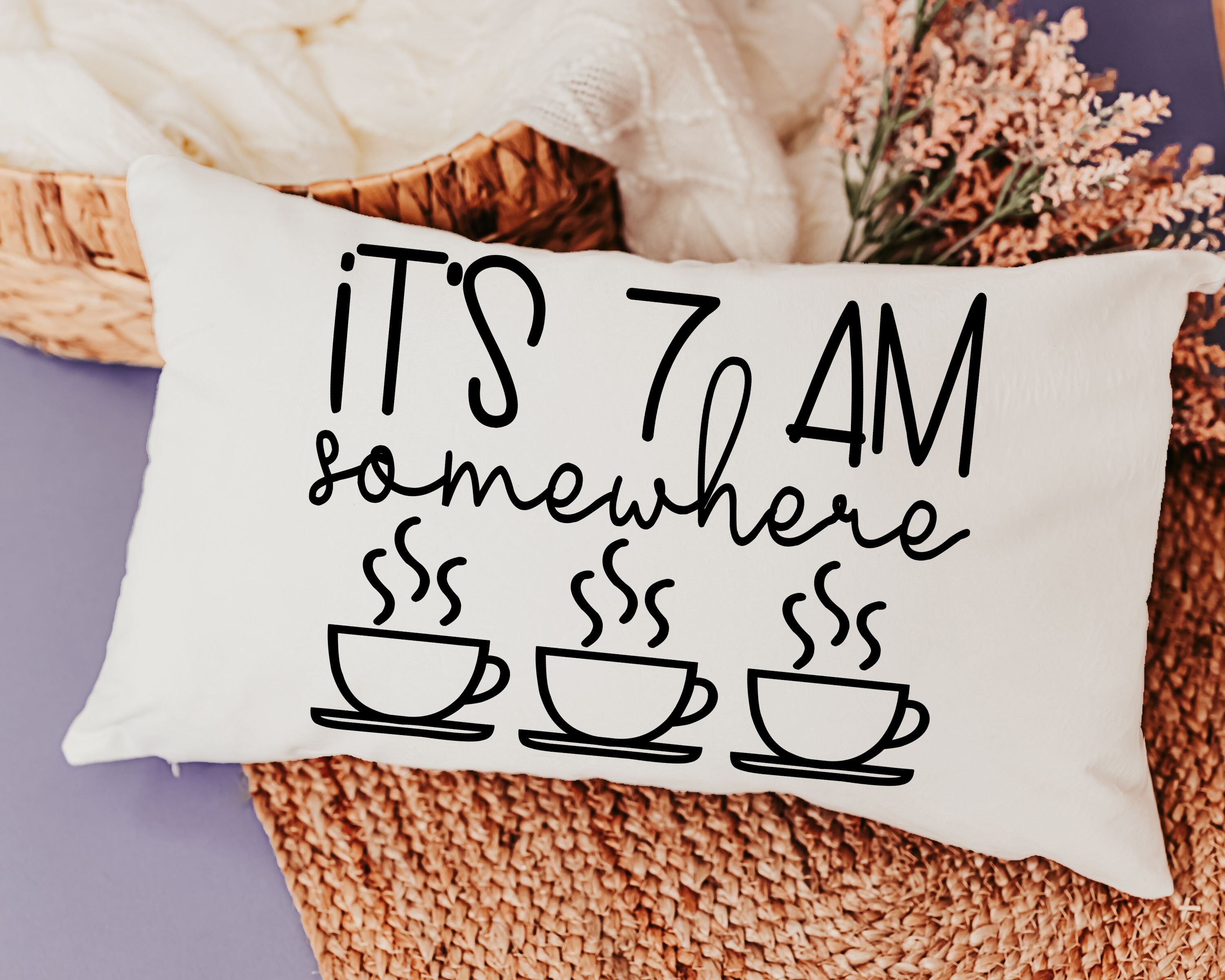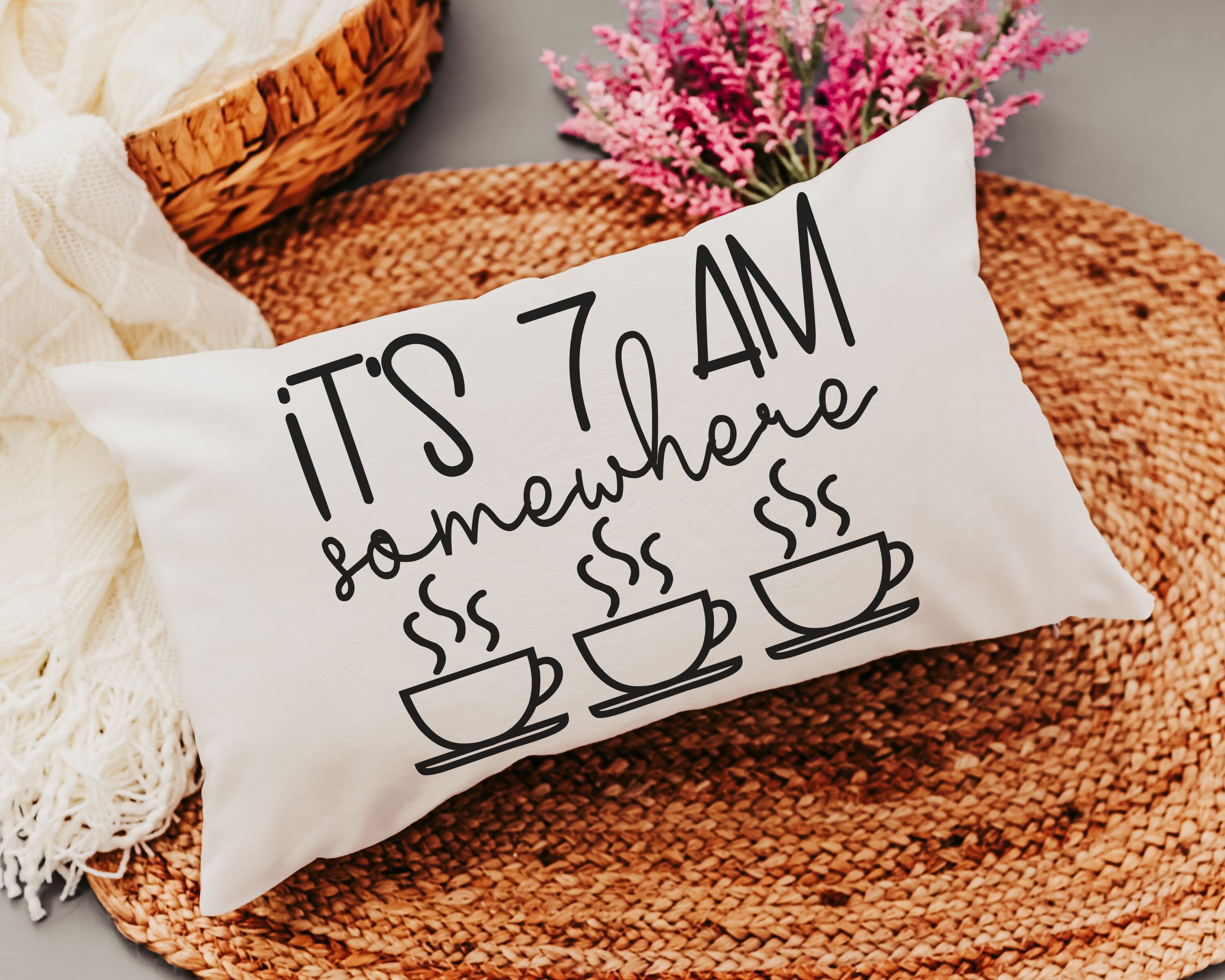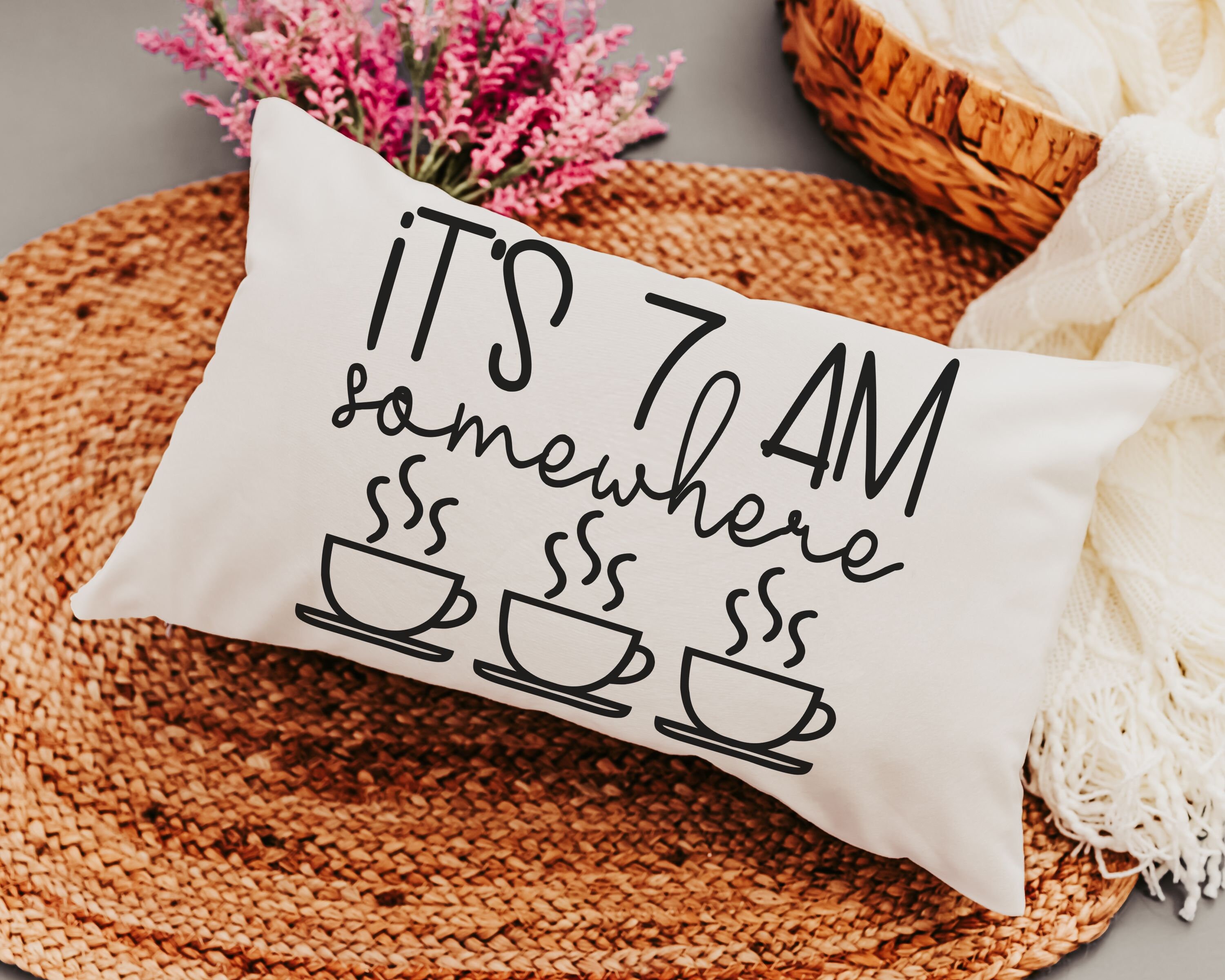 Enjoy the coffee lover's spirit with our 'It's 7 AM Somewhere' Throw Pillow. This makes for a delightful new home or housewarming gift for women who appreciate a good laugh along with their coffee. It's not just a pillow; it's a fun addition to their morning routine and a unique bar pillow. Perfect for celebrating birthdays or simply adding a touch of humor to your home decor.