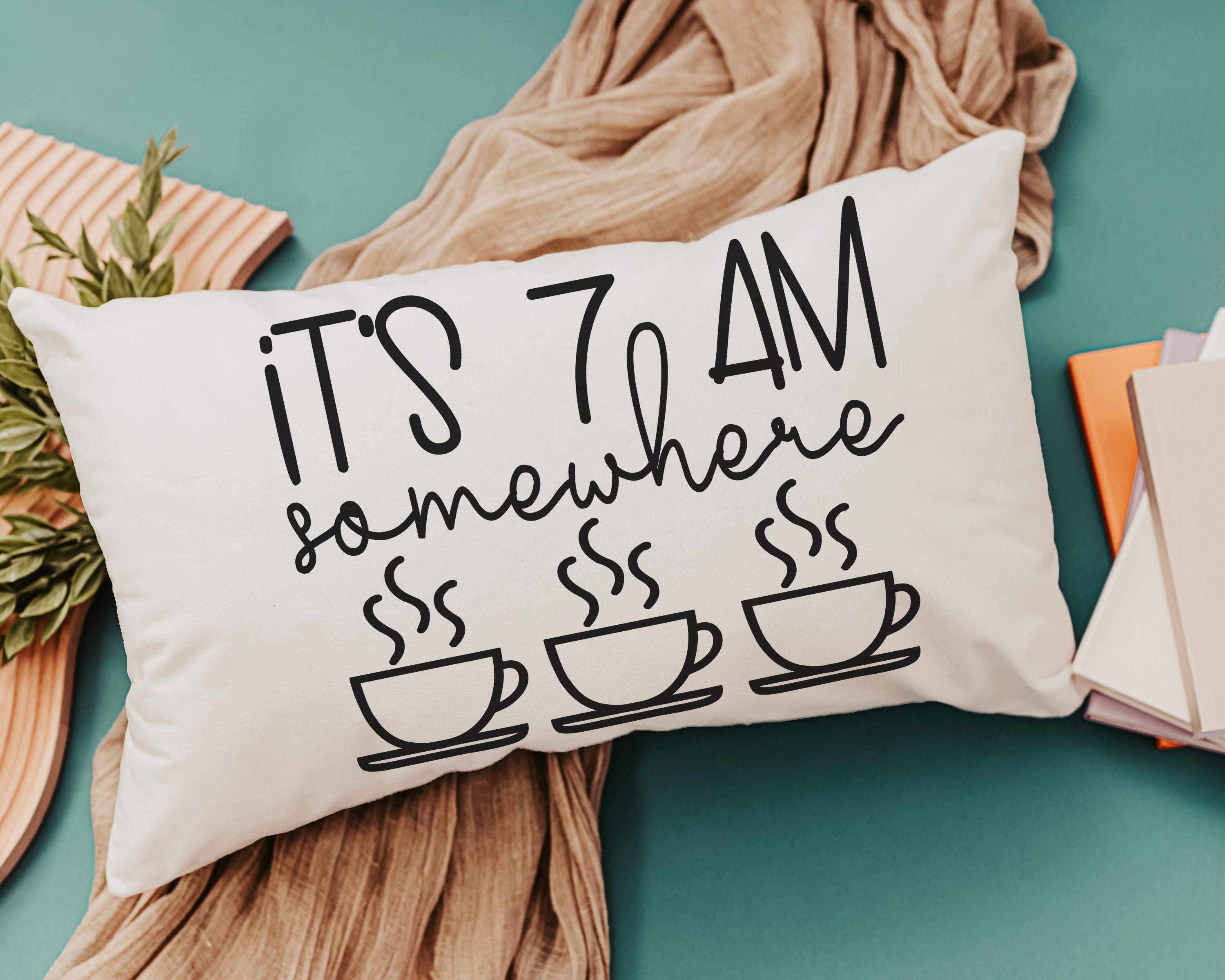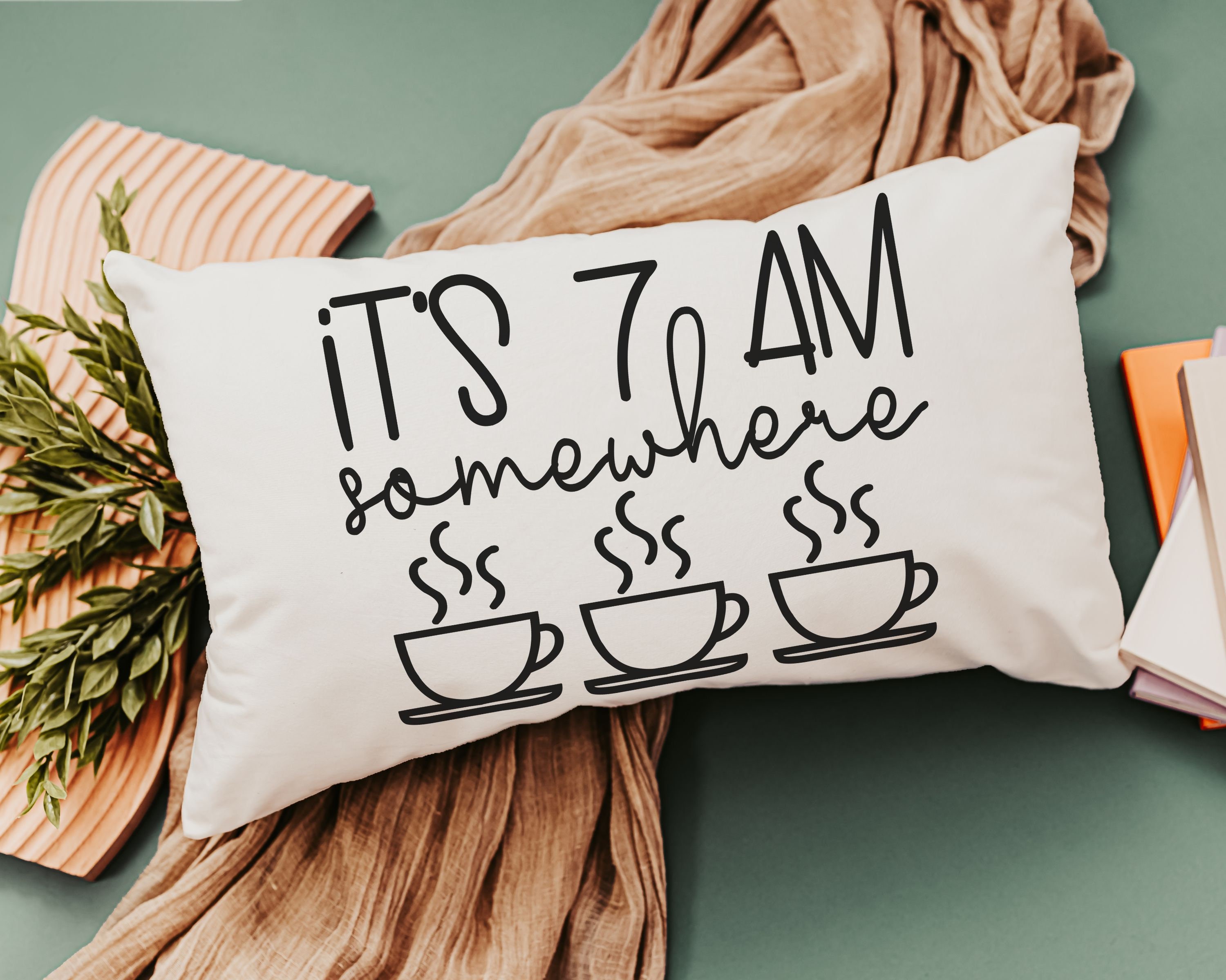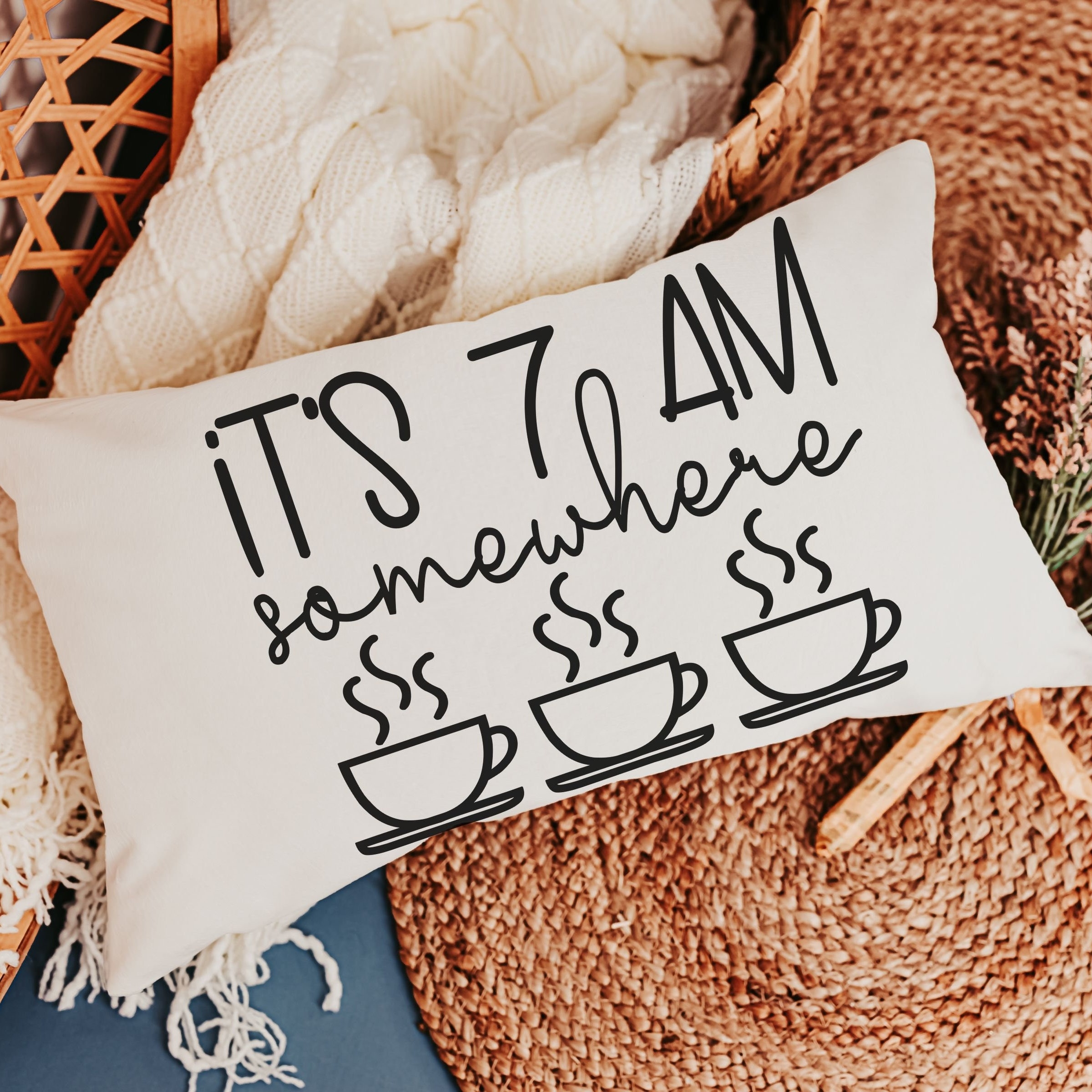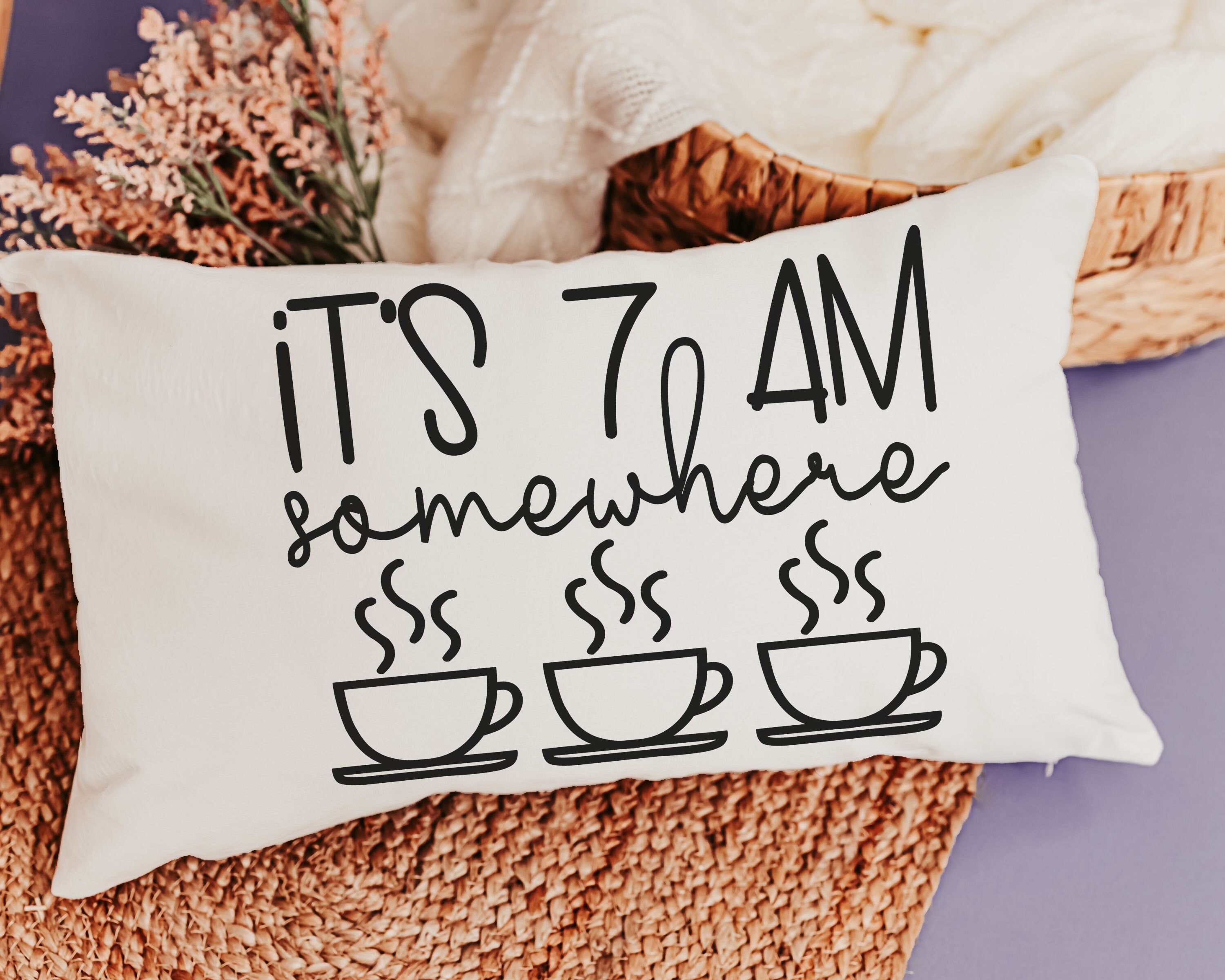 Enjoy the coffee lover's spirit with our 'It's 7 AM Somewhere' Throw Pillow. This makes for a delightful new home or housewarming gift for women who appreciate a good laugh along with their coffee. It's not just a pillow; it's a fun addition to their morning routine and a unique bar pillow. Perfect for celebrating birthdays or simply adding a touch of humor to your home decor.