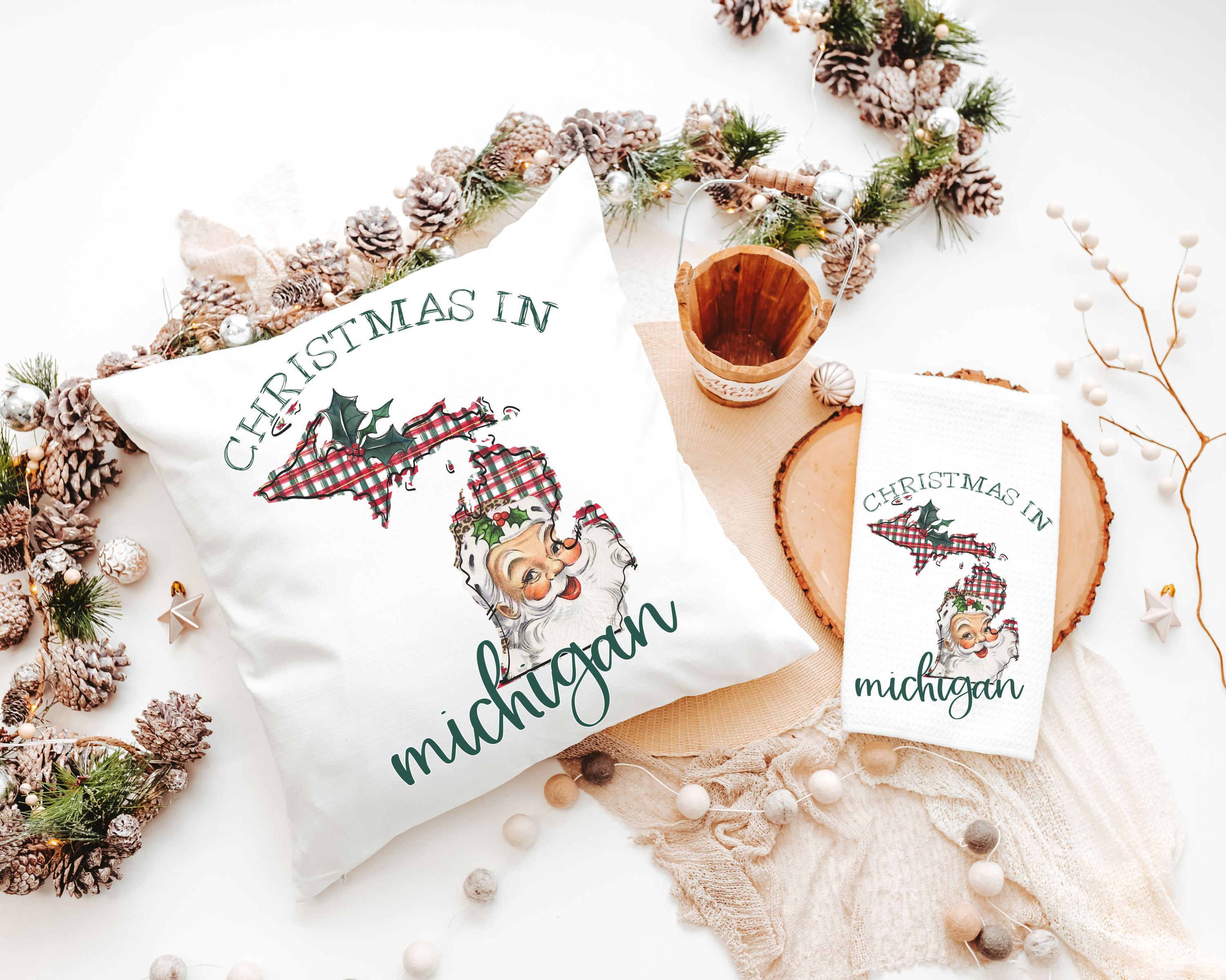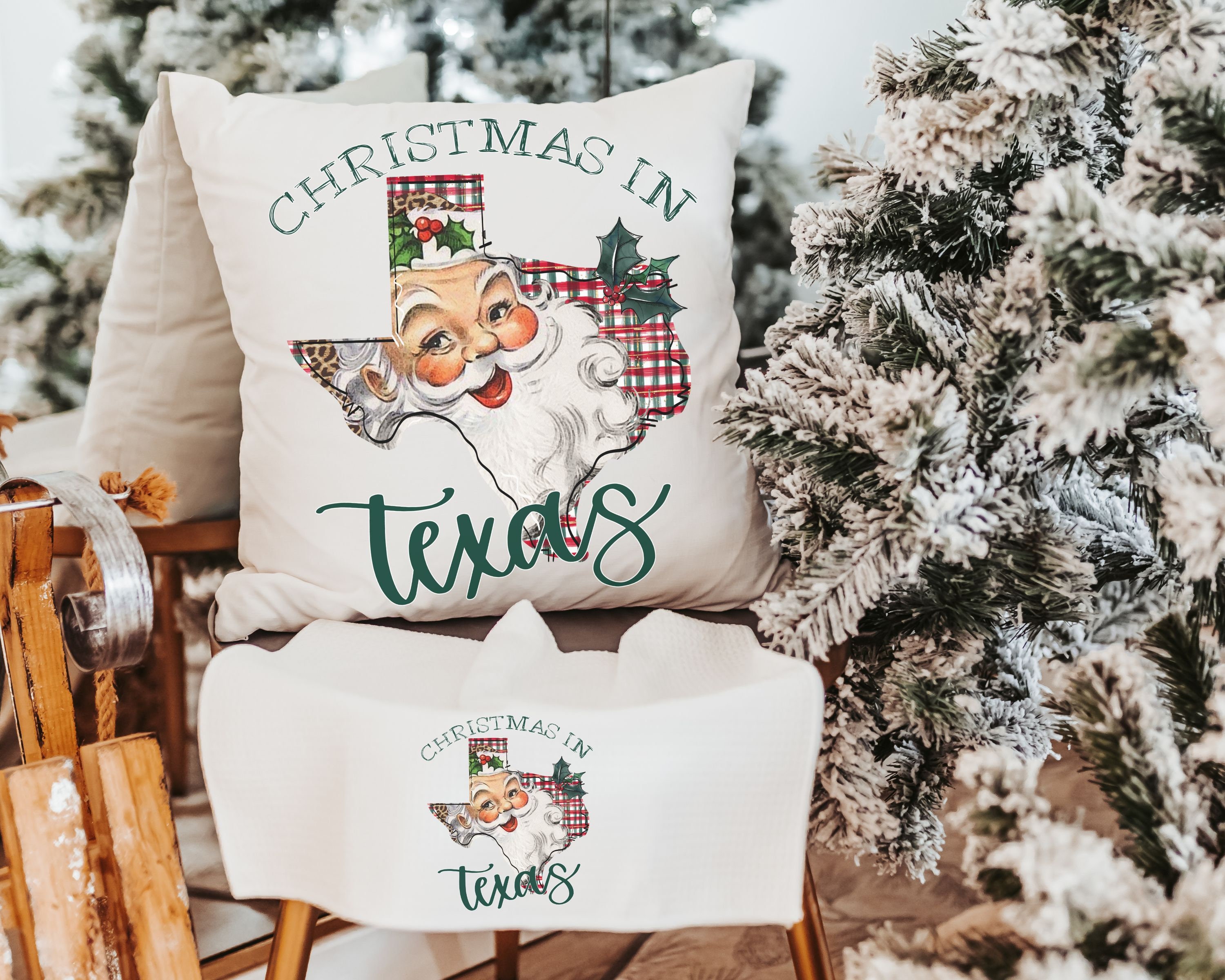 Celebrate a Texas Christmas with Santa pillows and matching towels, perfect for holiday decorating. Ideal for the couch or kitchen, they make beautiful home decor gifts and thoughtful holiday surprises for neighbors. Available to purchase as pillows or towels, sold separately or as sets.