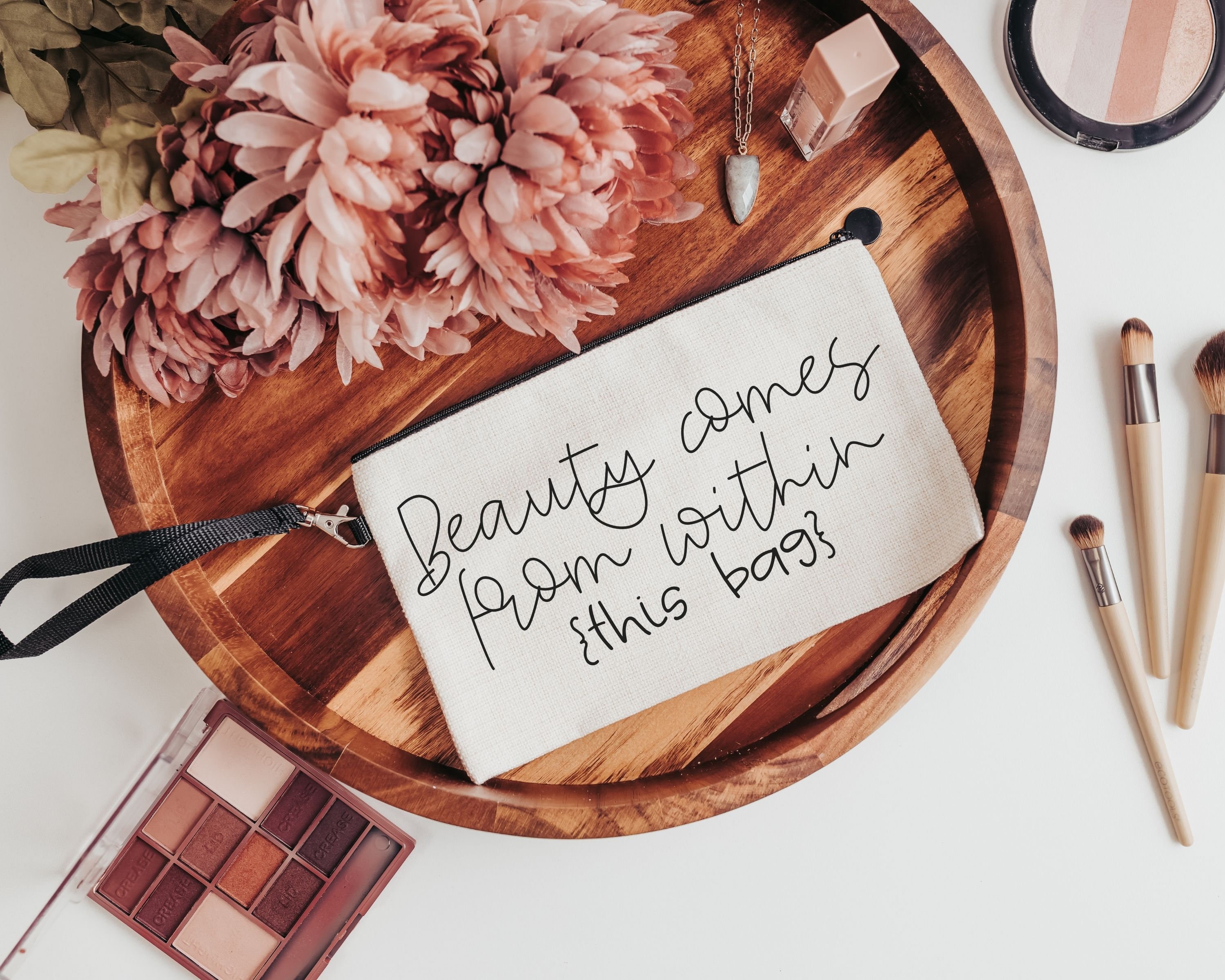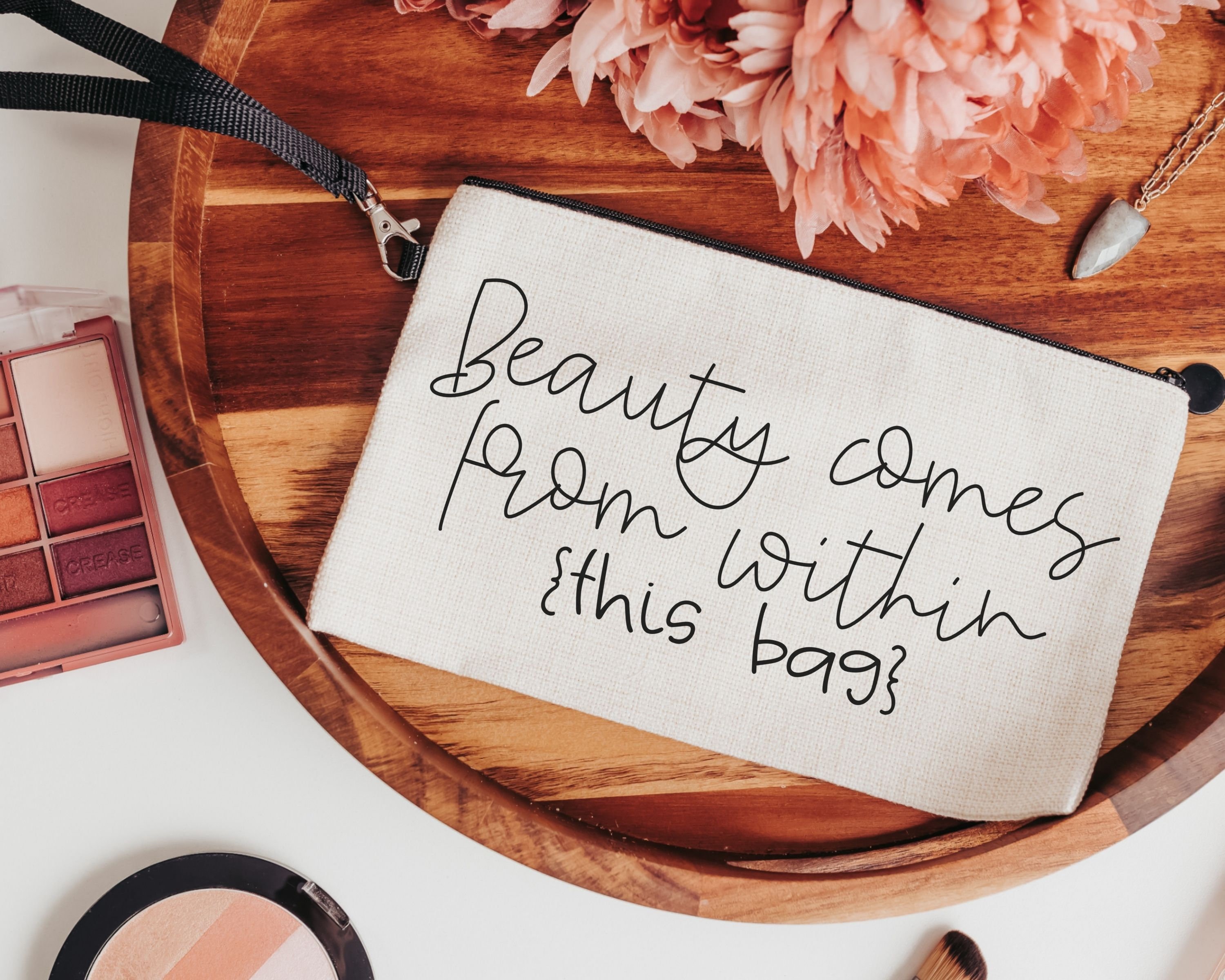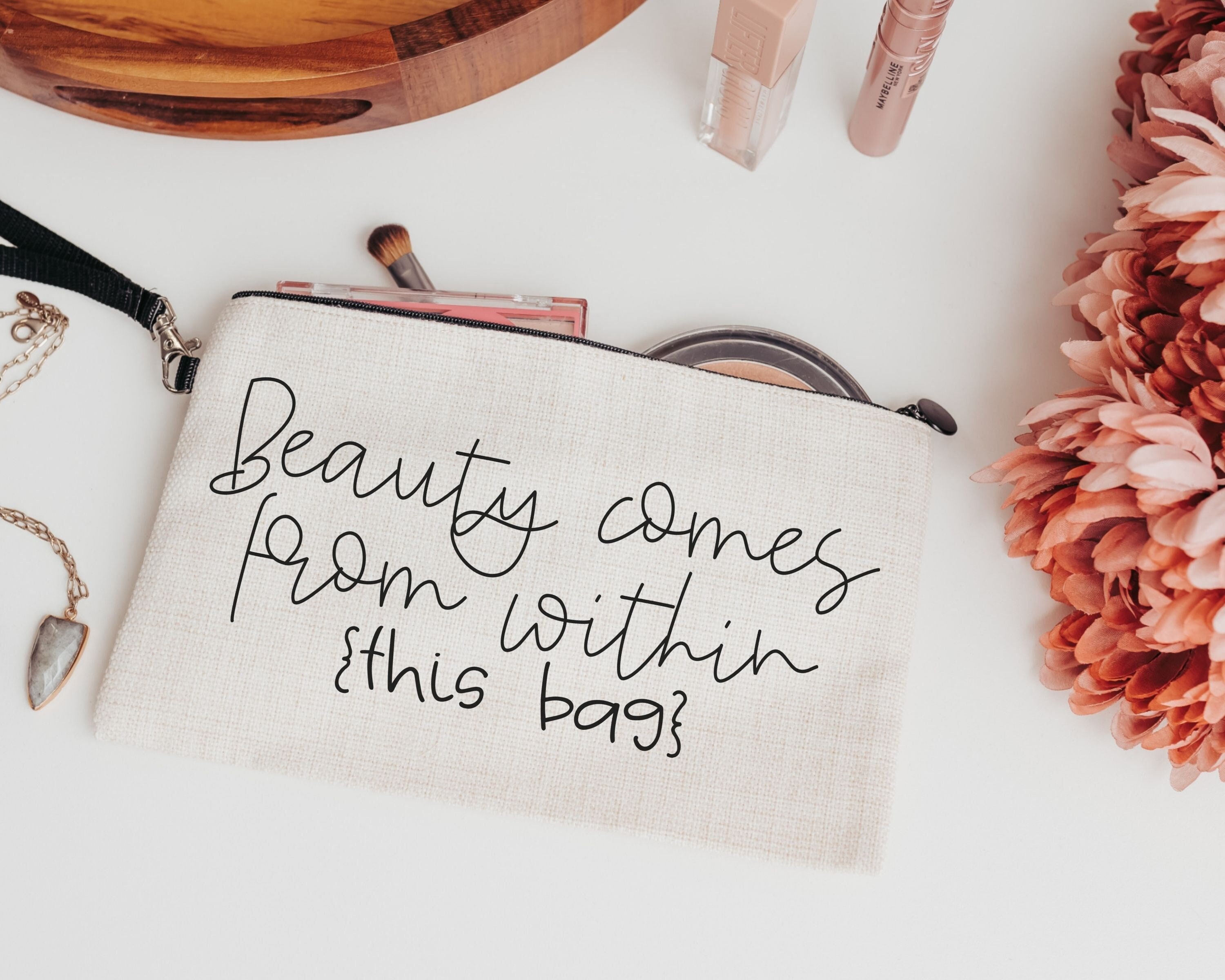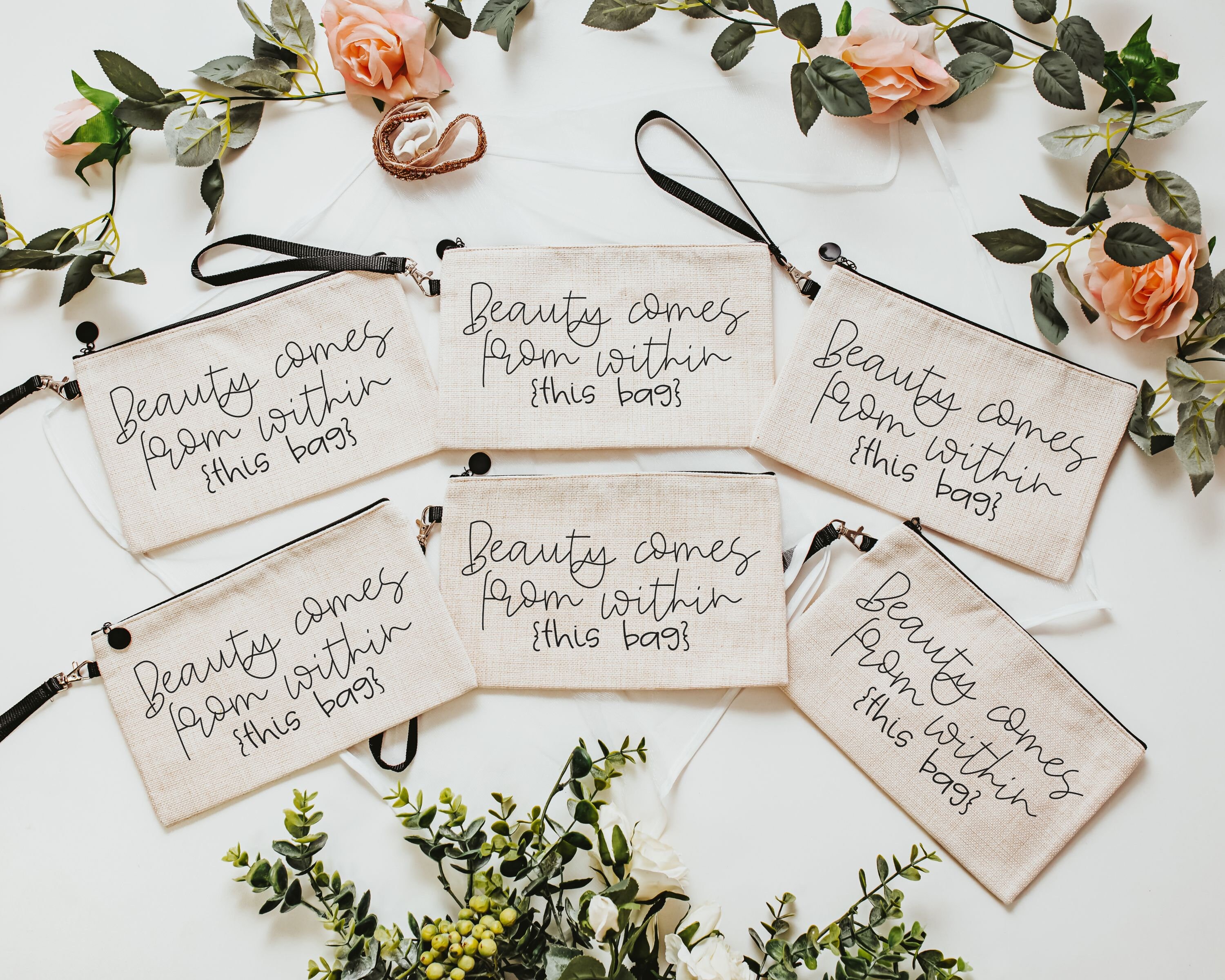 Add a touch of fun to your wedding morning with the Beauty Comes from Within This Bag makeup pouch. Perfect for bridal party gifts or getting-ready moments, this cosmetic bag fits easily in a purse and makes cute wedding day gifts for bridesmaids or thoughtful bridal shower thank-you gifts.