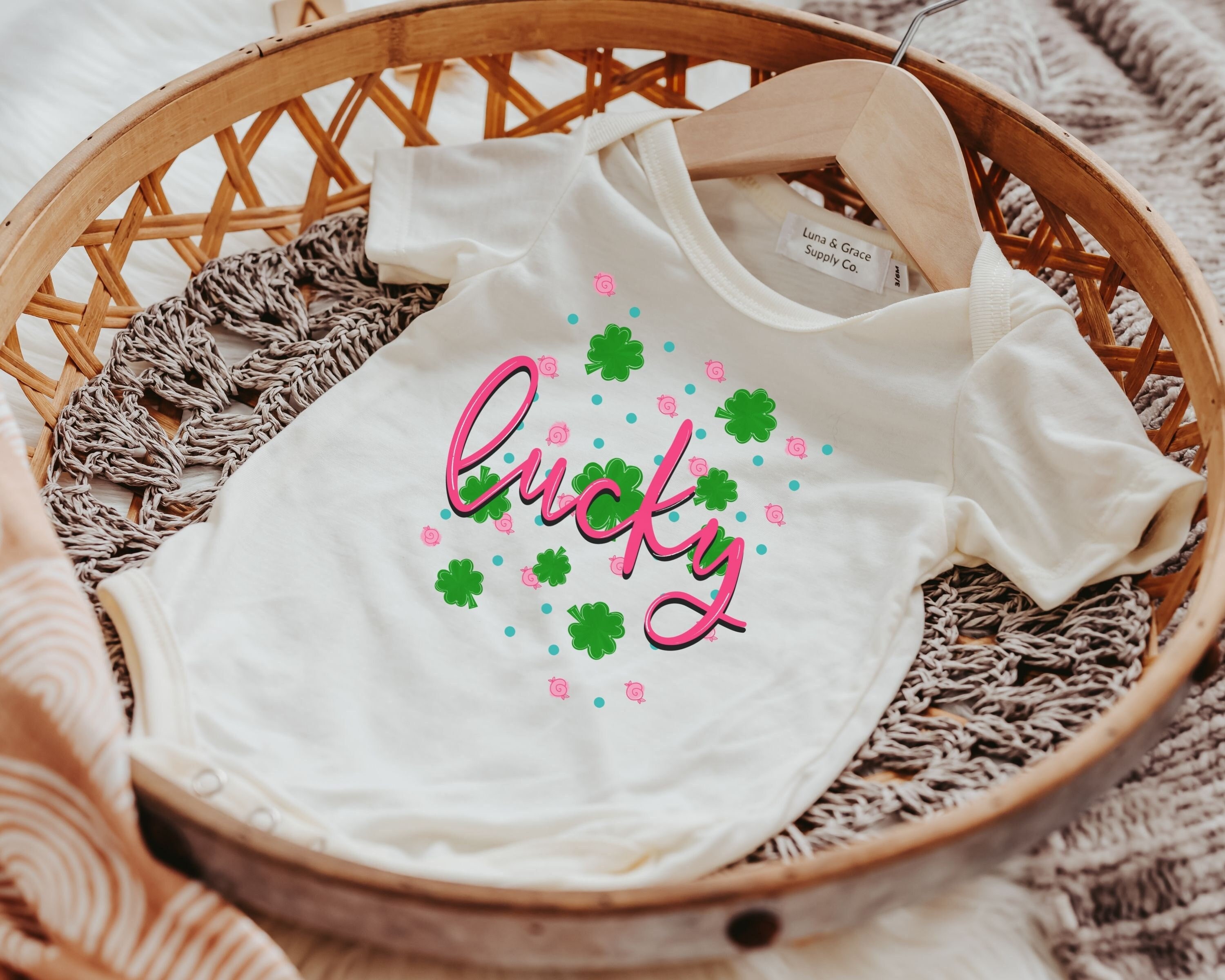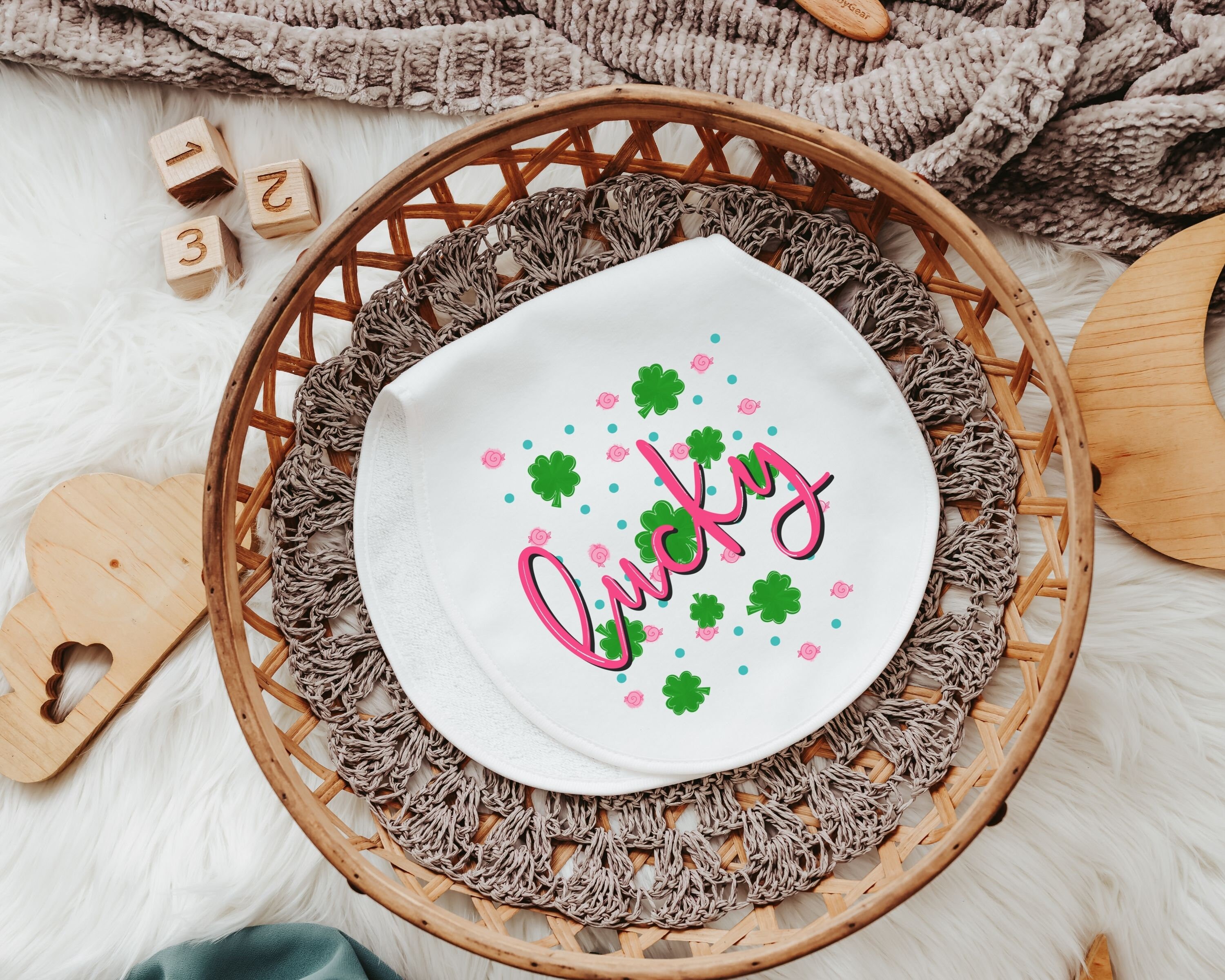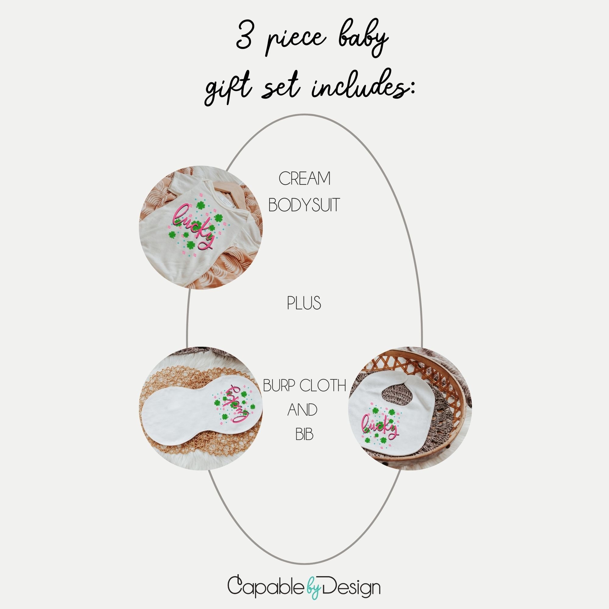 This Lucky St. Patrick's Day Outfit for baby is the perfect gift for any little girl. Featuring a festive Irish-inspired design, along with a matching bib and burp cloth, this set has everything you need for a special St. Patty's Day. It's the perfect way to bring a little Irish luck into your baby's wardrobe. Celebrate the luck of the Irish with this adorable St. Patty's Day outfit!