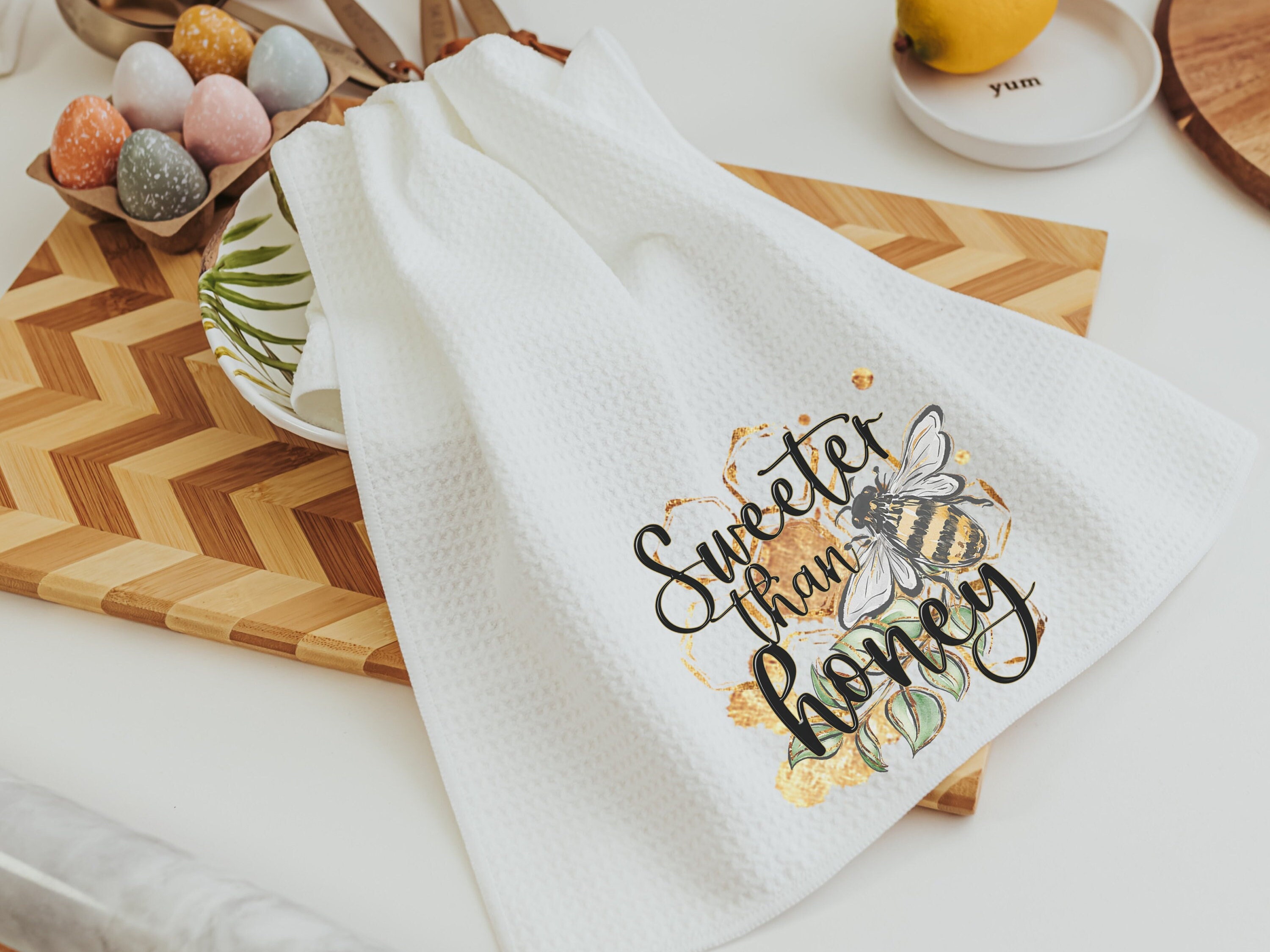 These cute "Sweeter than honey" kitchen towels are a perfect choice for moms, beekeepers, and anyone who loves the charm of bee kitchen decor. With their sweet message and farmhouse kitchen style, they make for beautiful additions to your decor or a thoughtful new apartment gift. Enjoy the sweetness of life and add a touch of nature-inspired beauty to your home with these bee-themed towels.