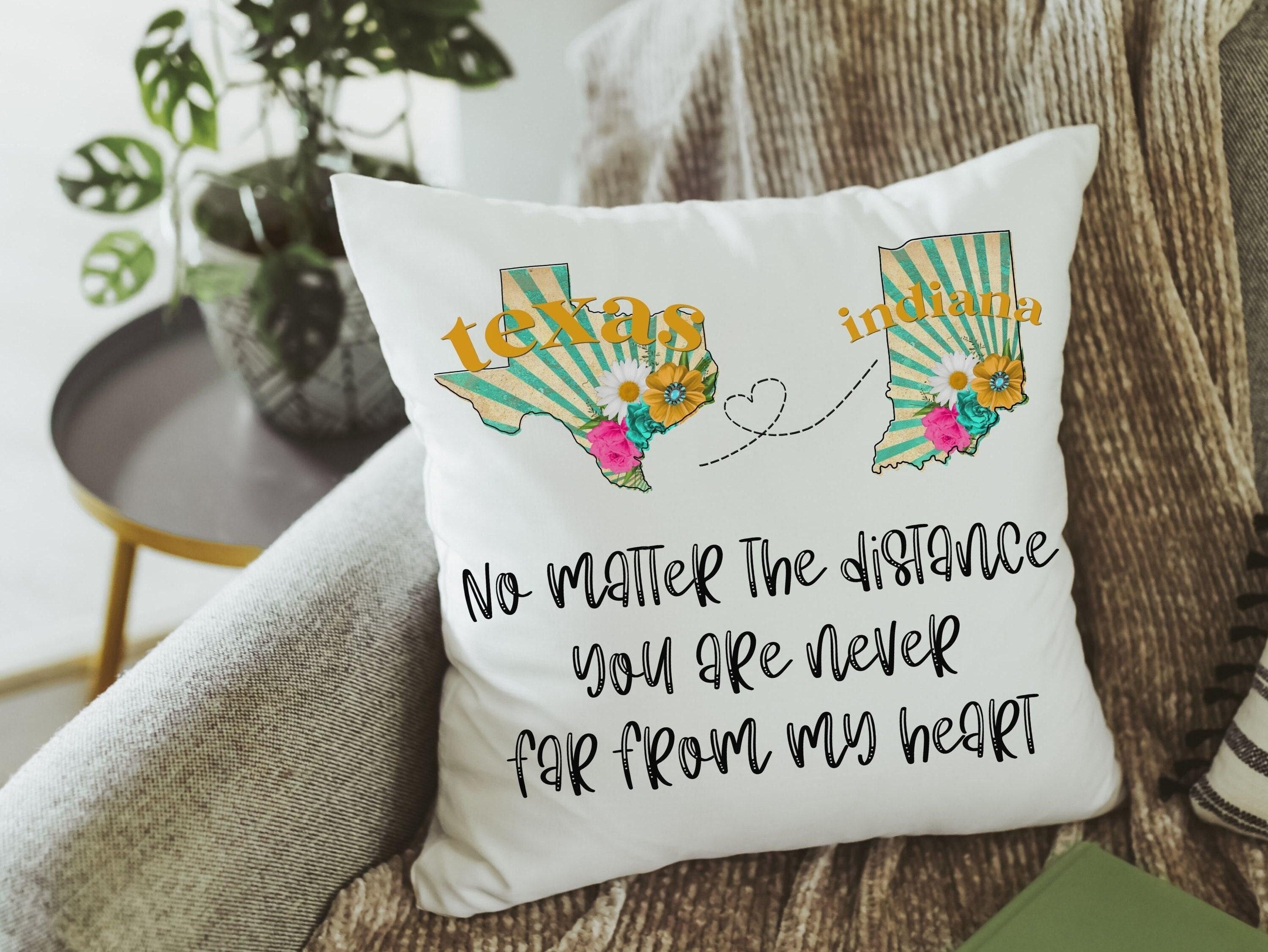no matter the distance throw pillows for couch, long distance relationship gift for girlfriend, moving away gift for best friend, two states