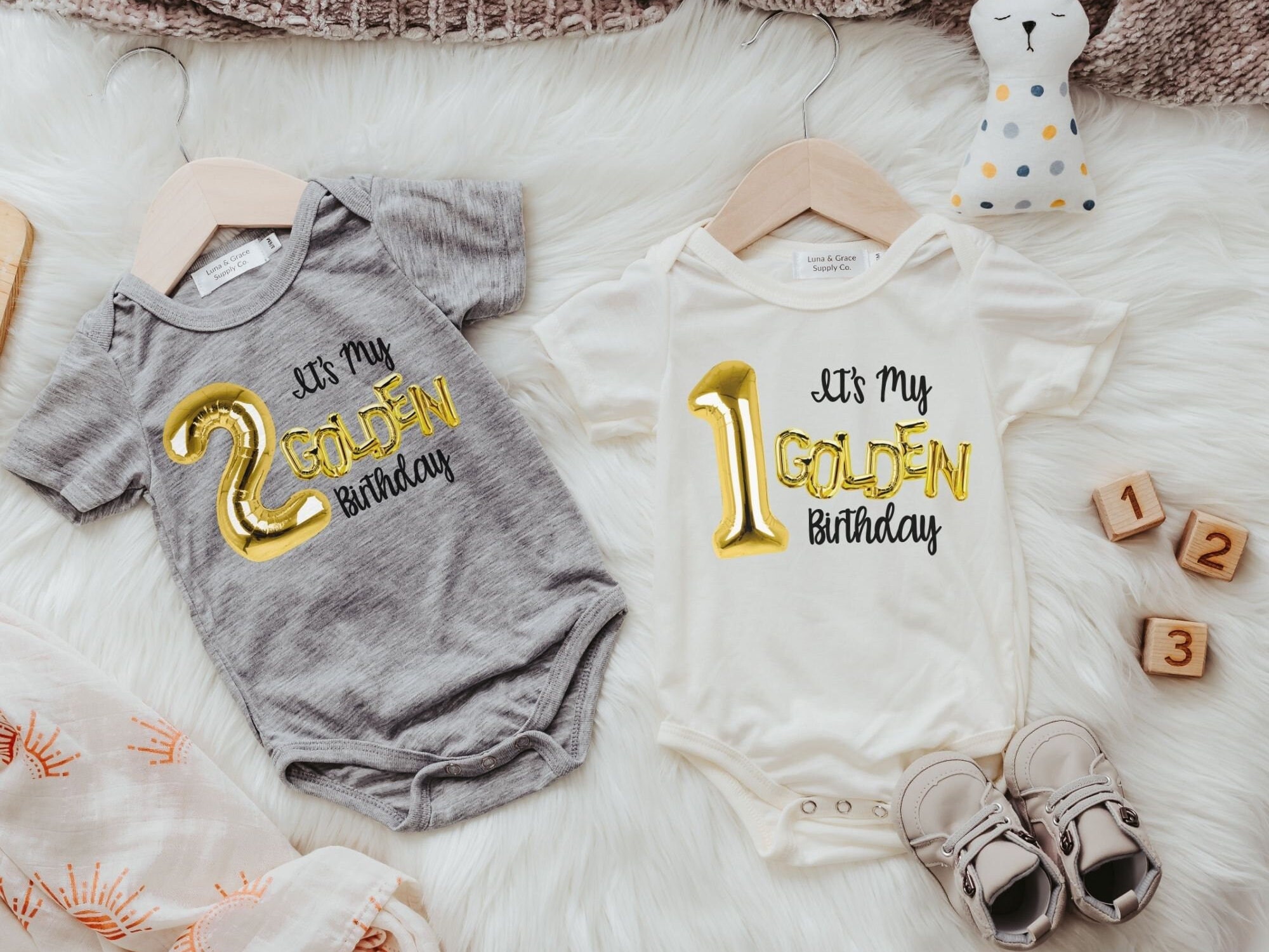 Celebrate your little one's first golden birthday in style with our 1st Golden Birthday burp cloth, bib and Golden Birthday cake smash outfit for boys and girls! This adorable outfit features a stunning golden design that's sure to make your little one shine on their big day. Our 1st Golden Birthday burp cloth is the perfect addition to any baby's wardrobe. The soft and absorbent fabric is great for catching messes, while the cute golden design is a fun and festive touch. And when it comes time for the cake smash, our Golden Birthday cake smash outfit is sure to steal the show! The soft and comfortable fabric is perfect for active little ones. Looking for the perfect first birthday gift idea or a gift for a new parent? Our 1st Golden Birthday burp cloth, bib, and Golden Birthday cake smash outfit make a great baby gift set! Order your 1st Golden Birthday burp cloth, bib, and Golden Birthday cake smash outfit today and give your little one a celebration to remember!