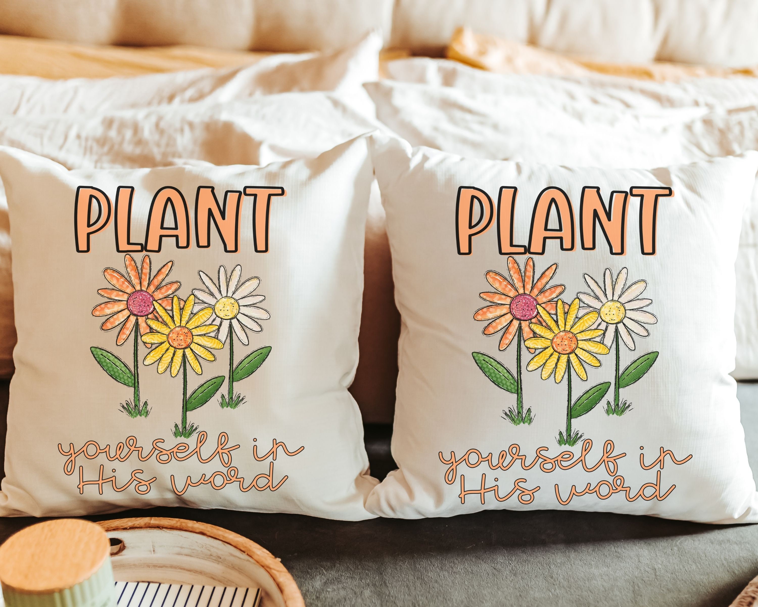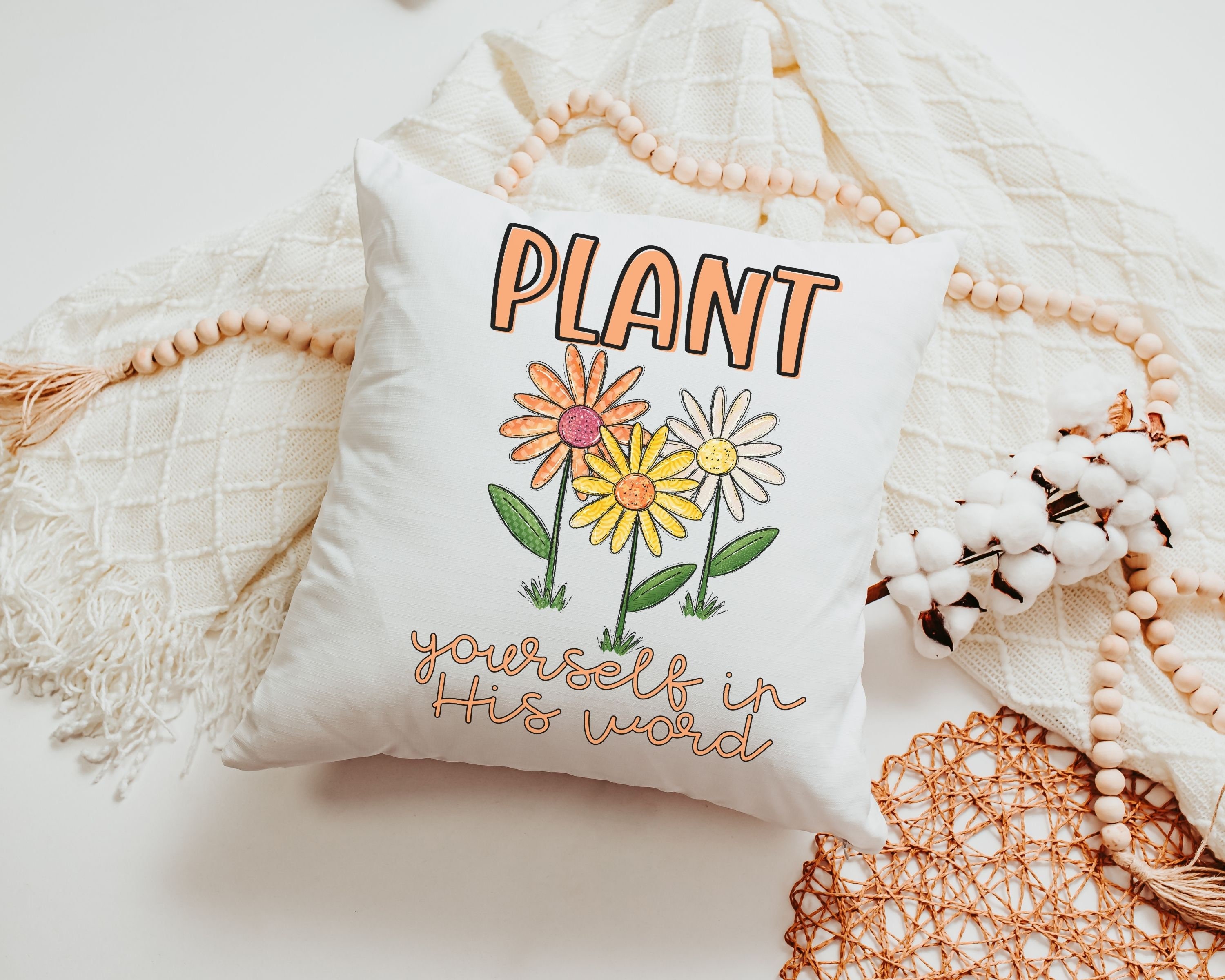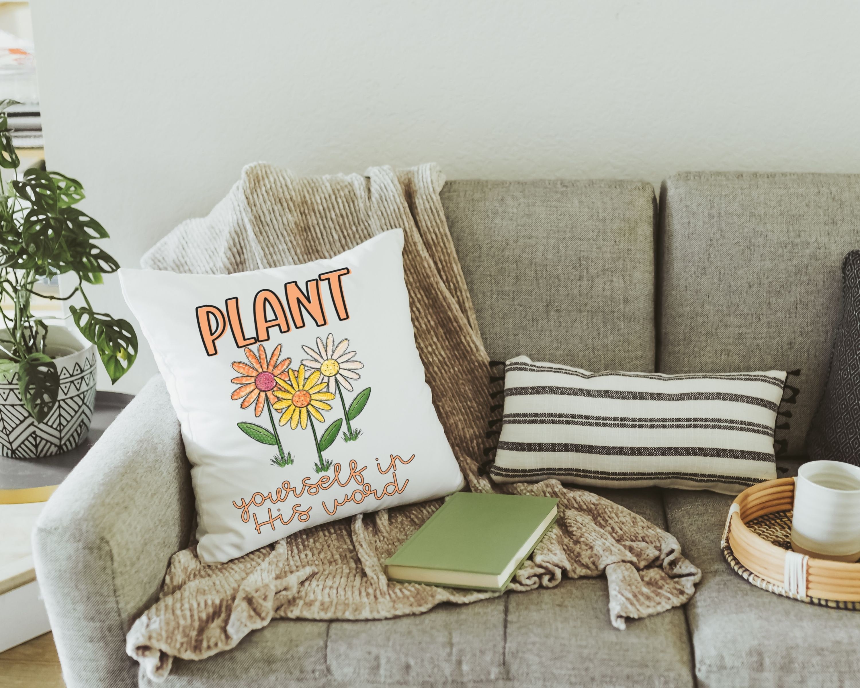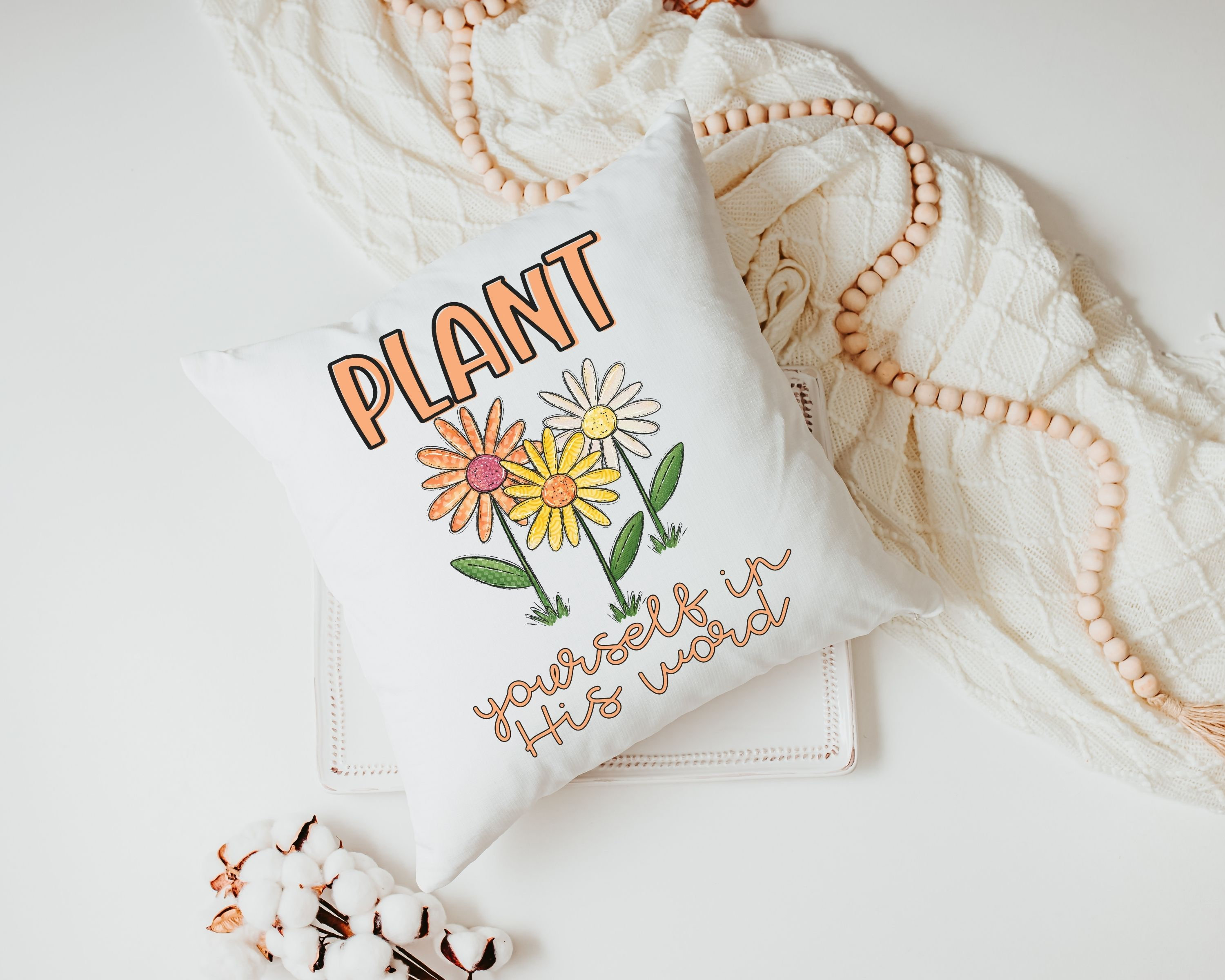 Brighten up any space with this colorful daisy throw pillow featuring the reminder to plant yourself in his word. A beautiful gift for gardeners, moms, or anyone who cherishes faith-filled home decor. Perfect for the living room, nursery, or as a unique Christian Christmas or baptism gift.