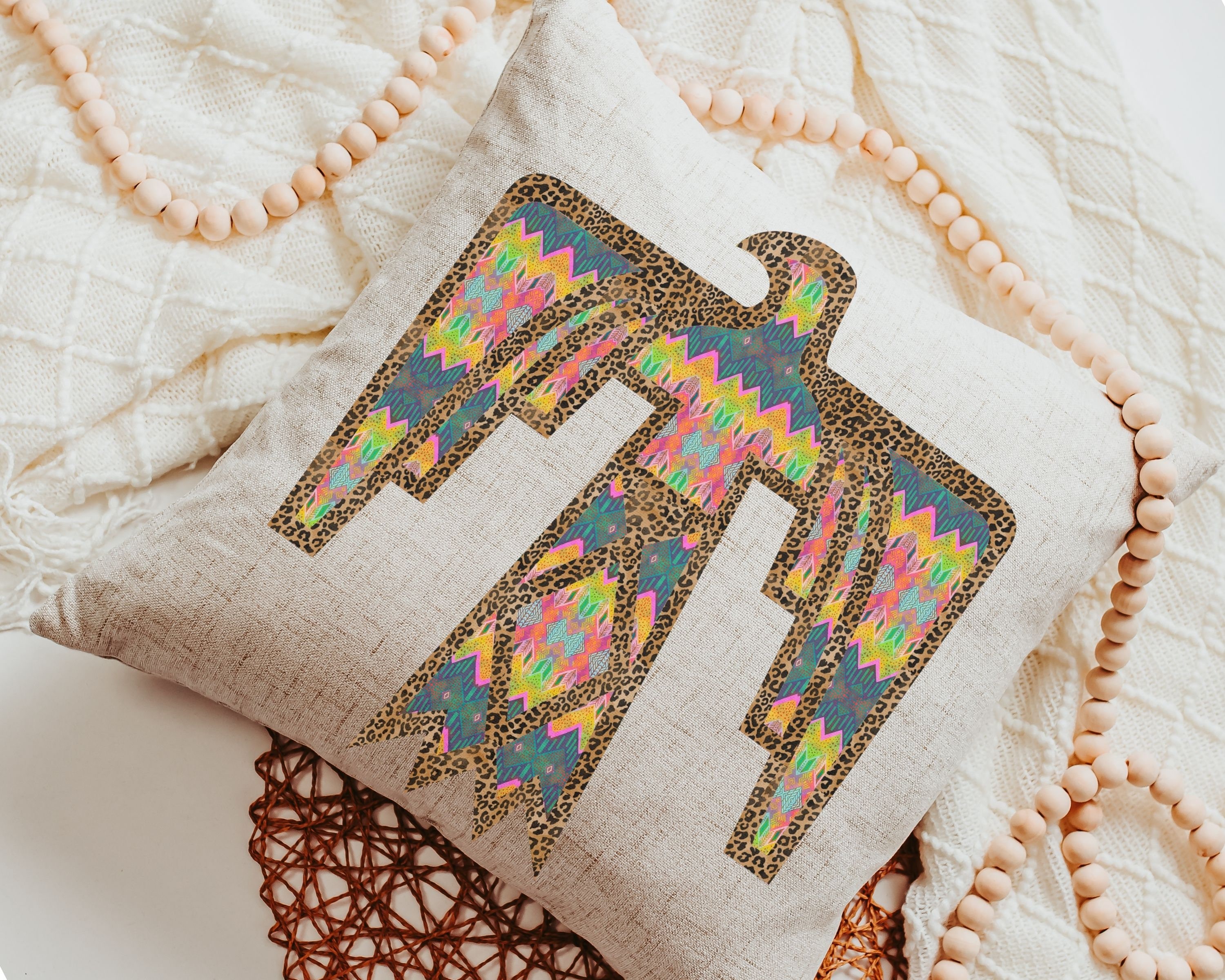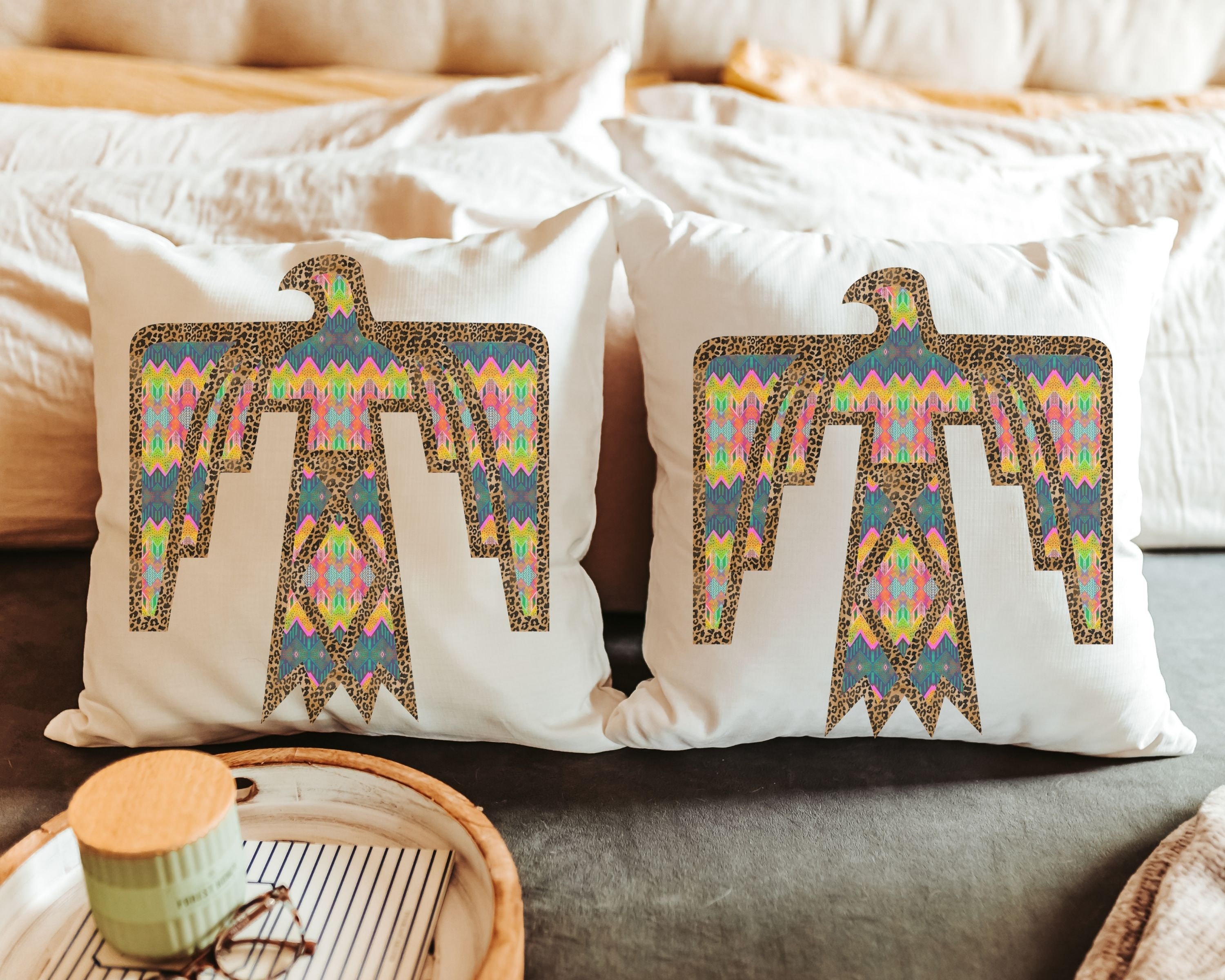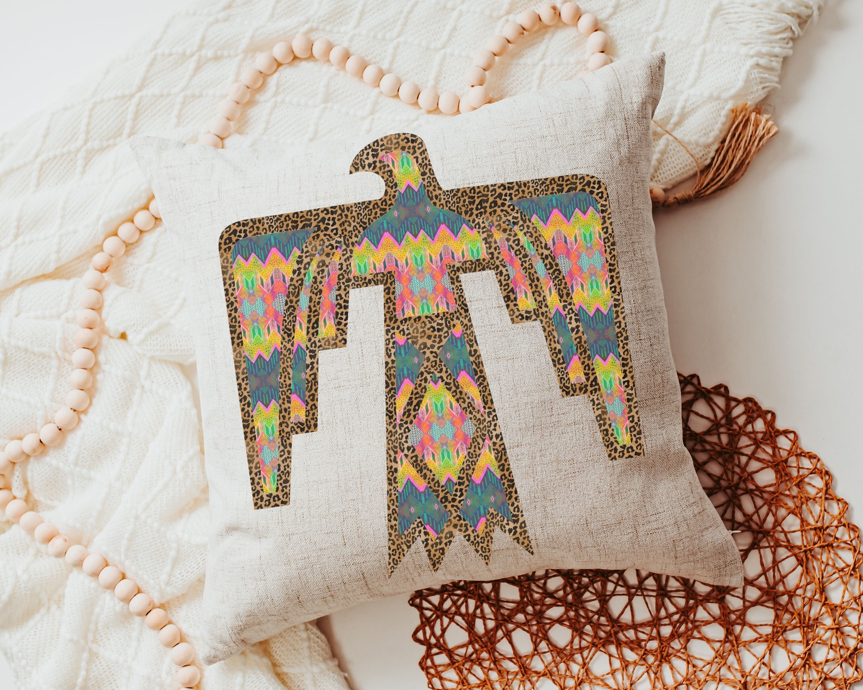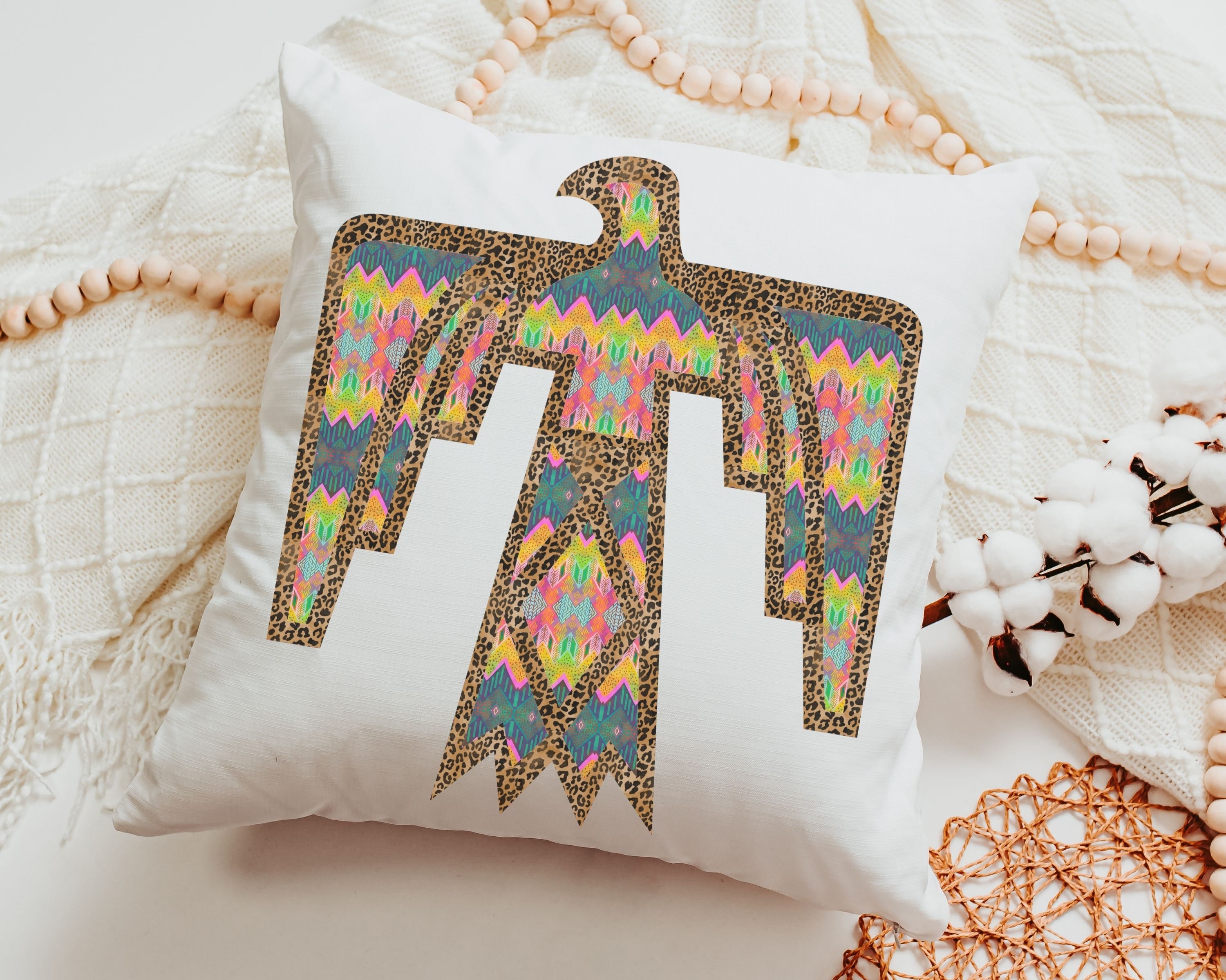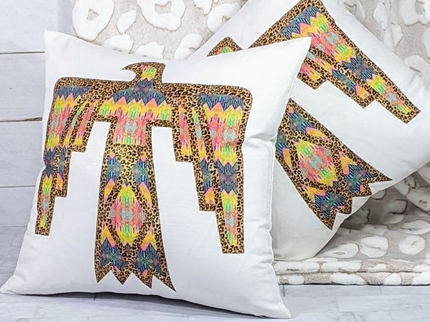 Our leopard print Thunderbird design adds a colorful accent to your couch, dorm room, or first apartment. A great gift idea for your daughter-in-law, college girls, or anyone who loves a southwestern touch in their home.