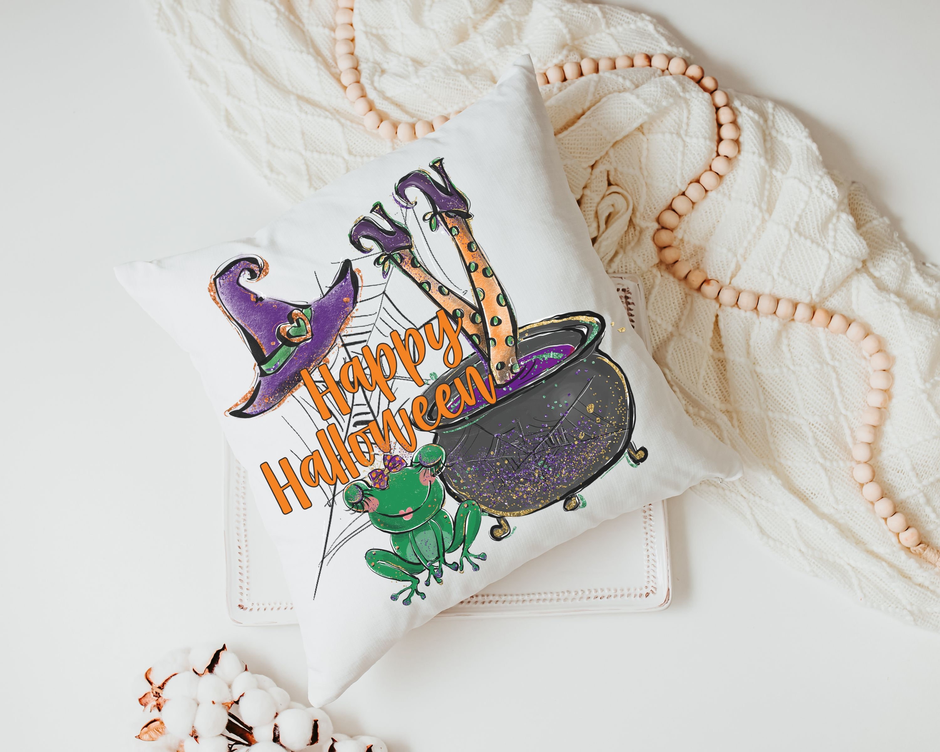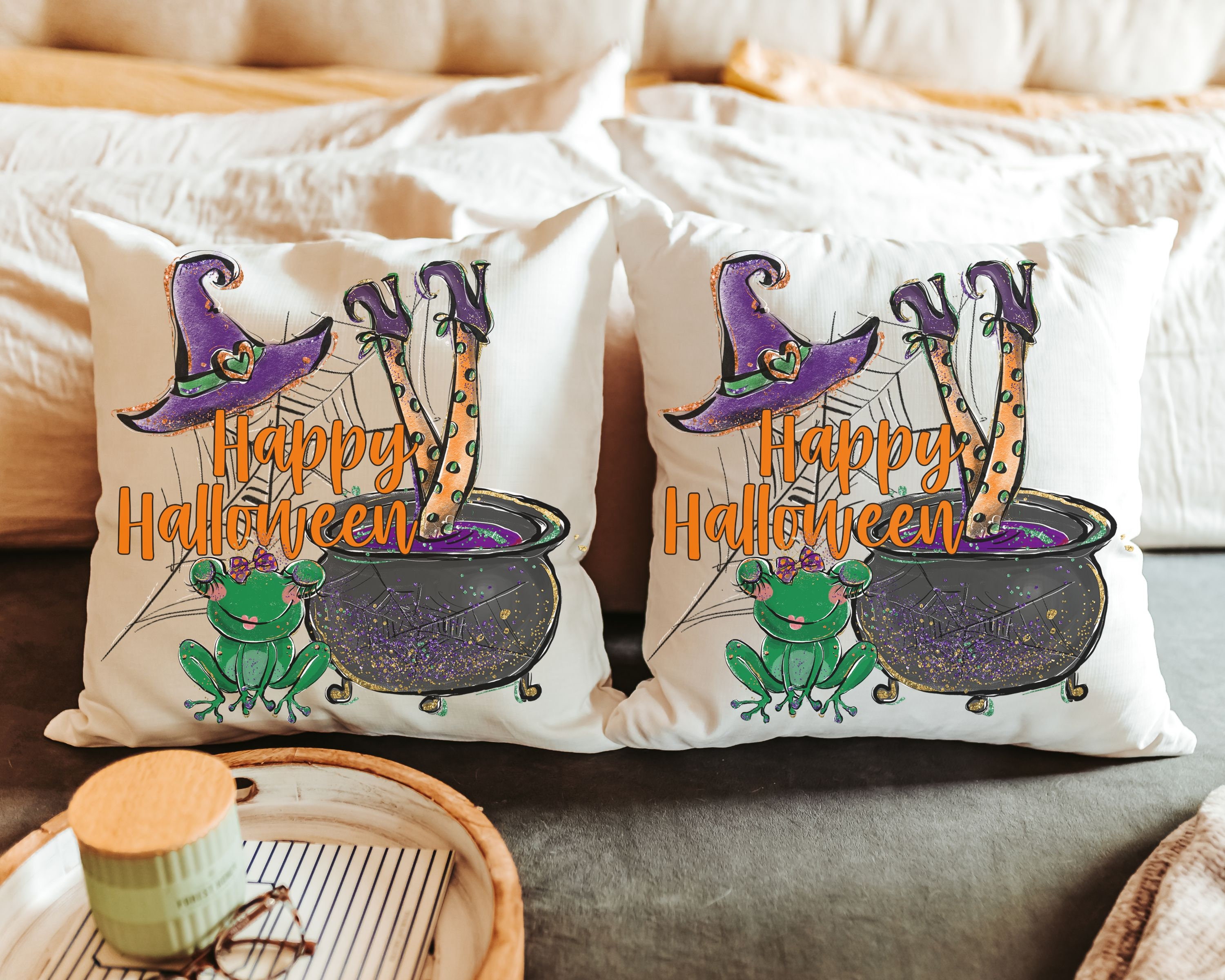 Add a seasonal touch to your home with these Happy Halloween throw pillows. Great for the couch, dorm, or as a Halloween housewarming gift, they bring whimsigoth style and a fun witch-inspired vibe to your space.