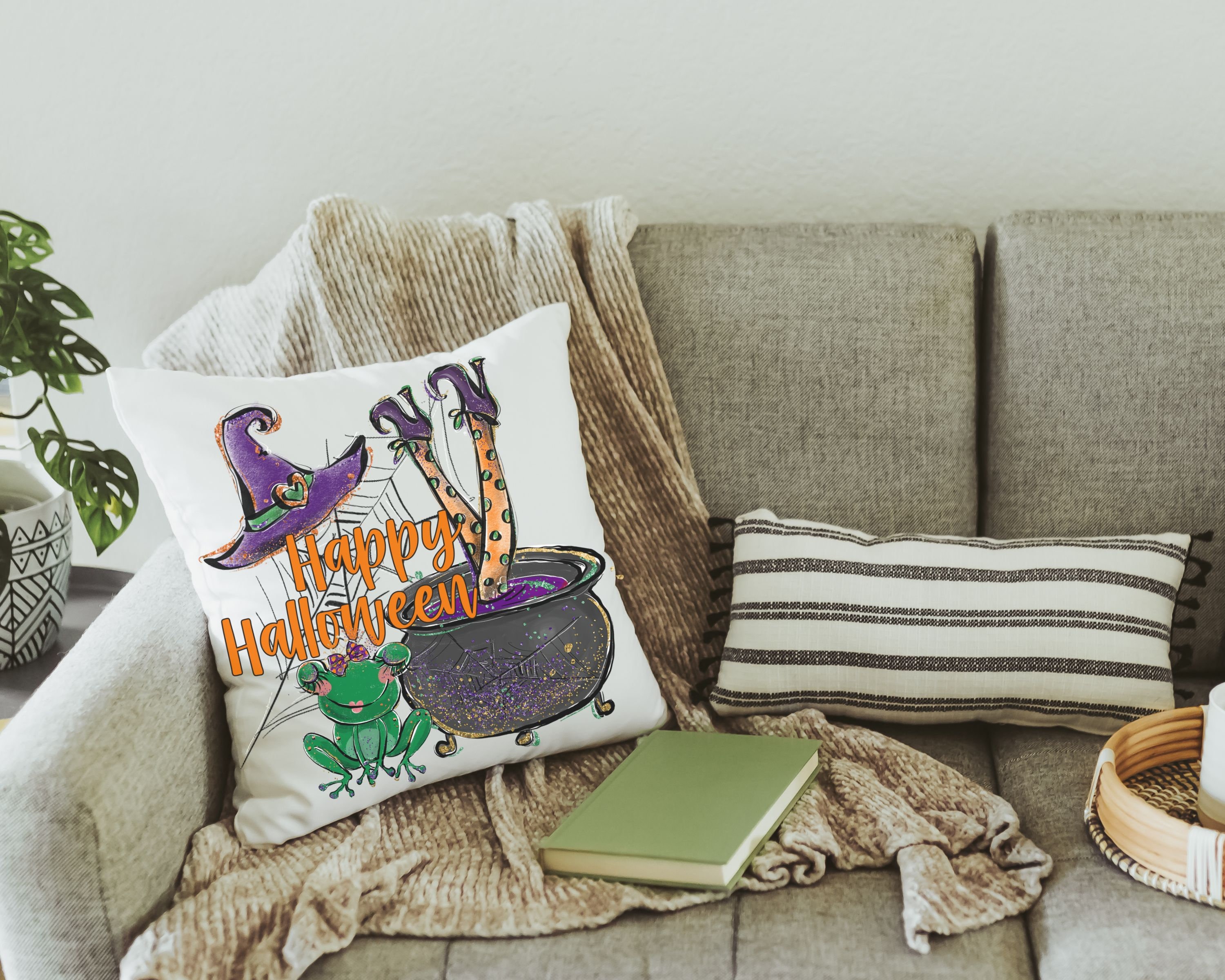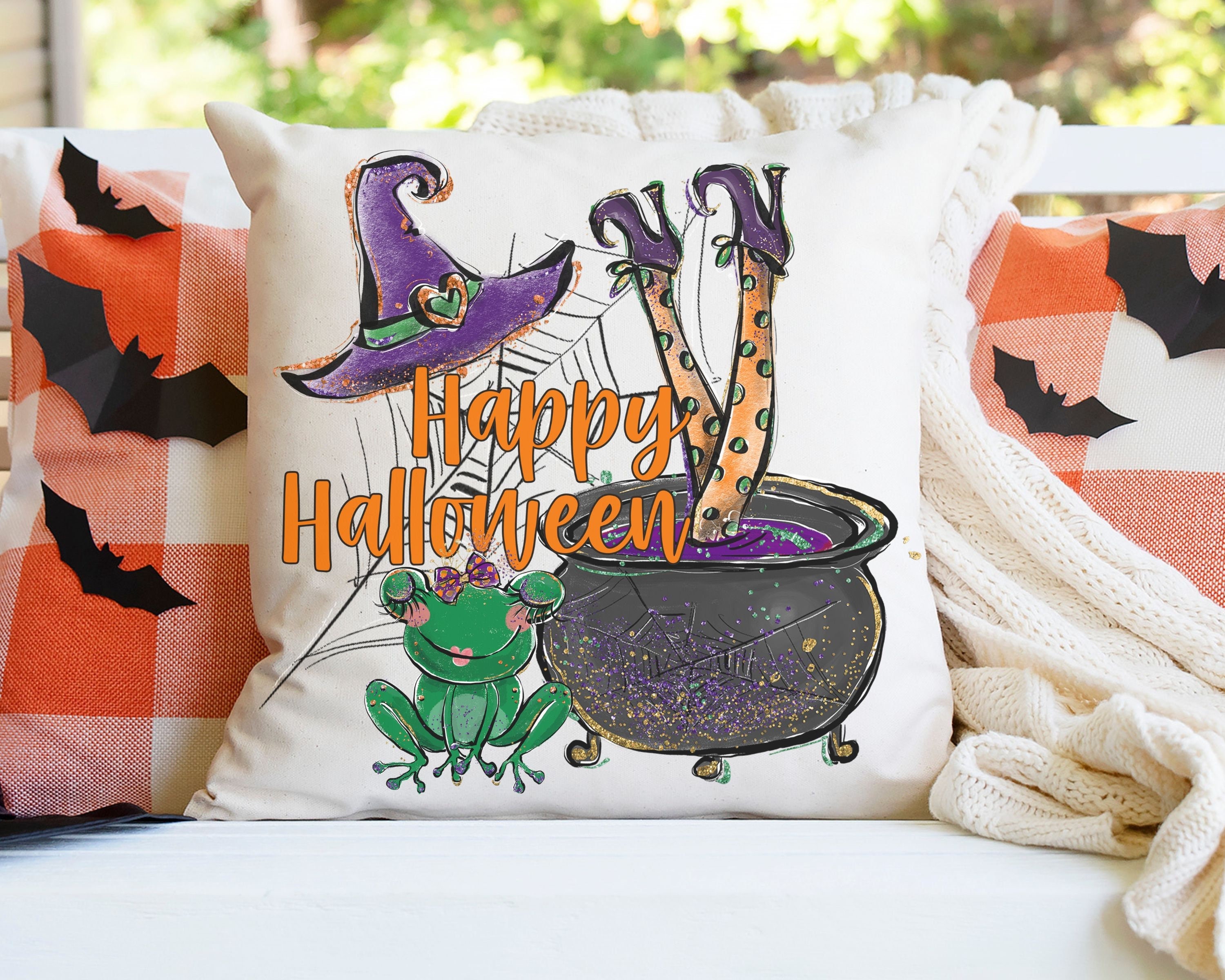 happy Halloween throw pillows for couch, funny Halloween decor, whimsigoth decor, witch pillow cover 18 x 18, Halloween housewarming gift