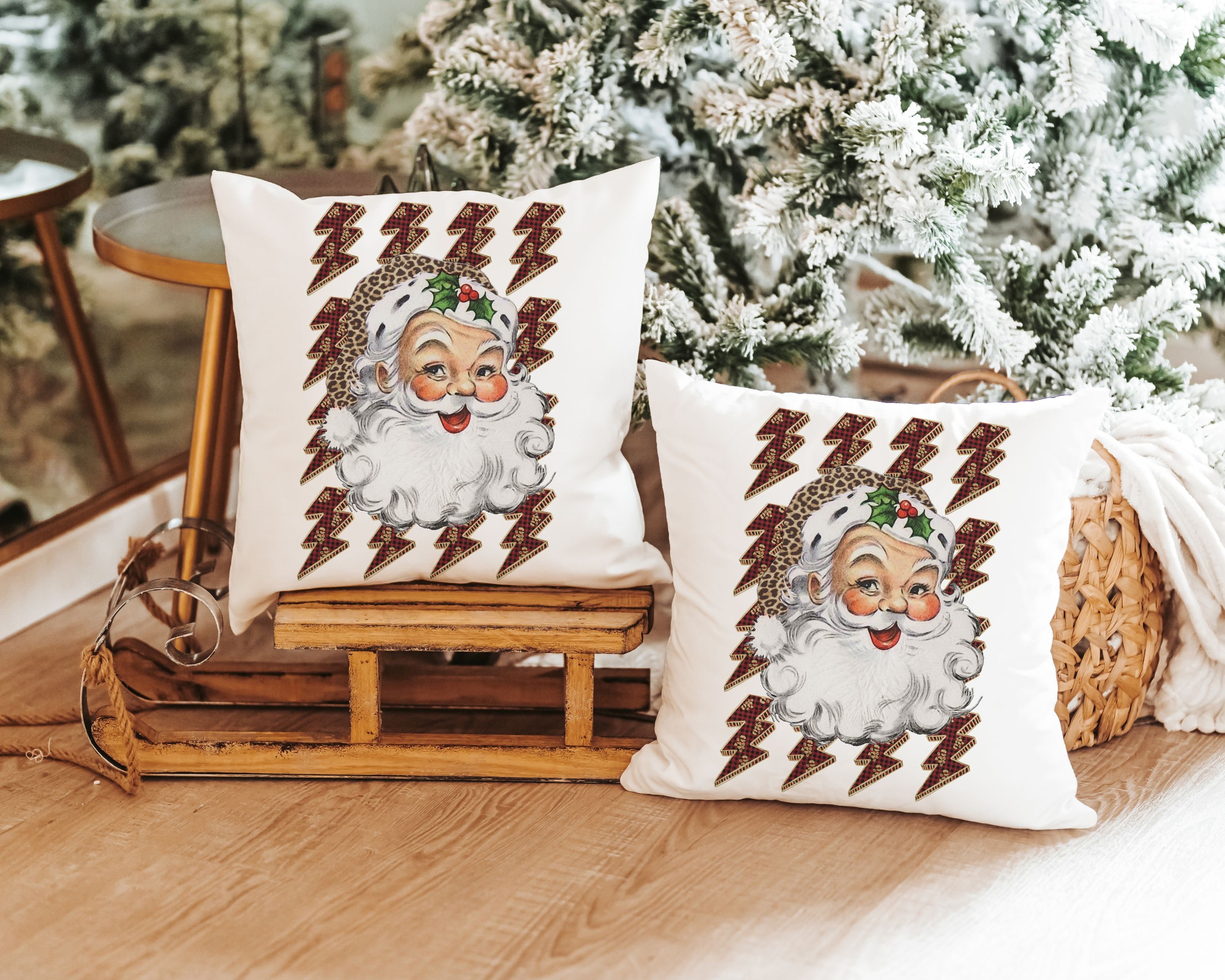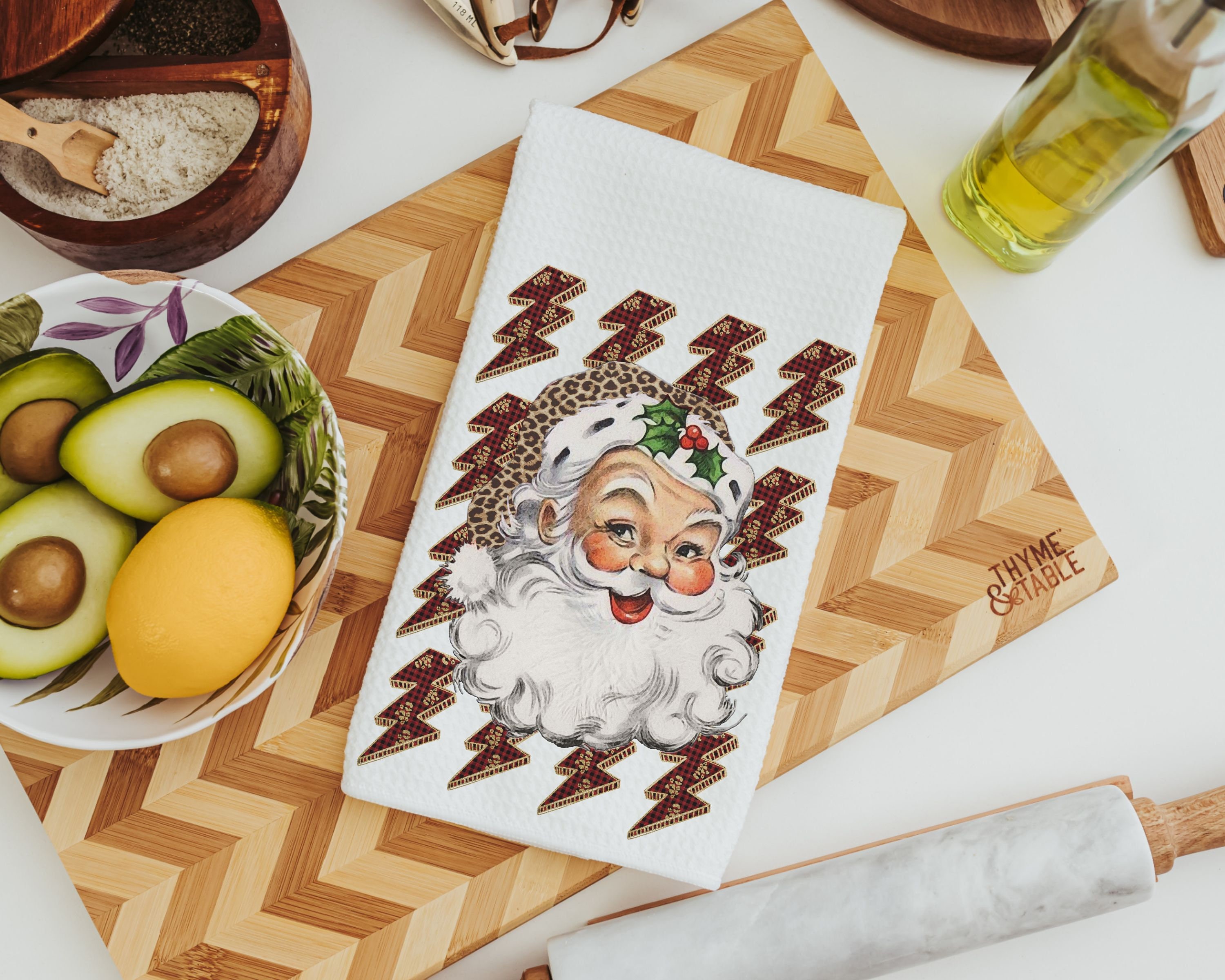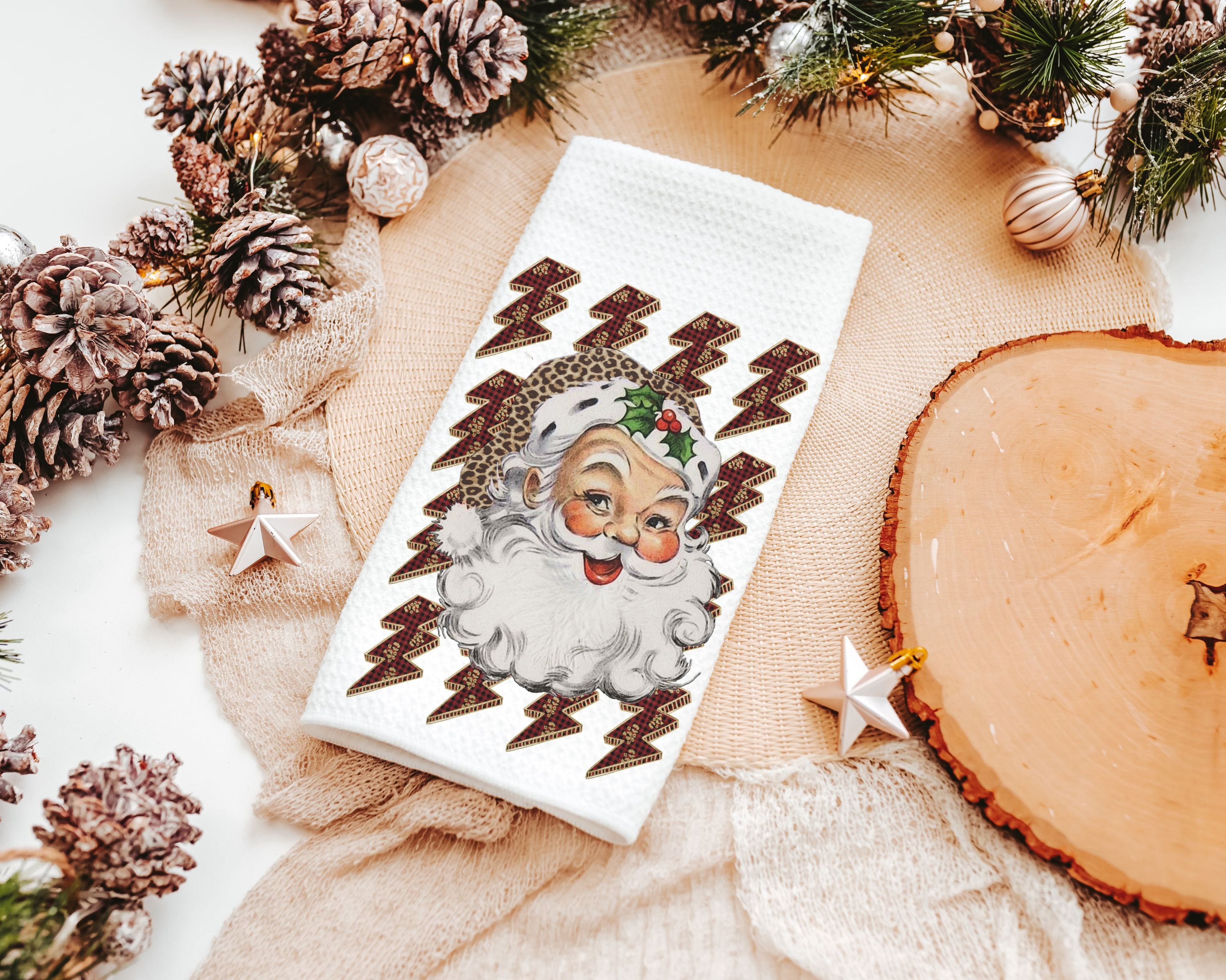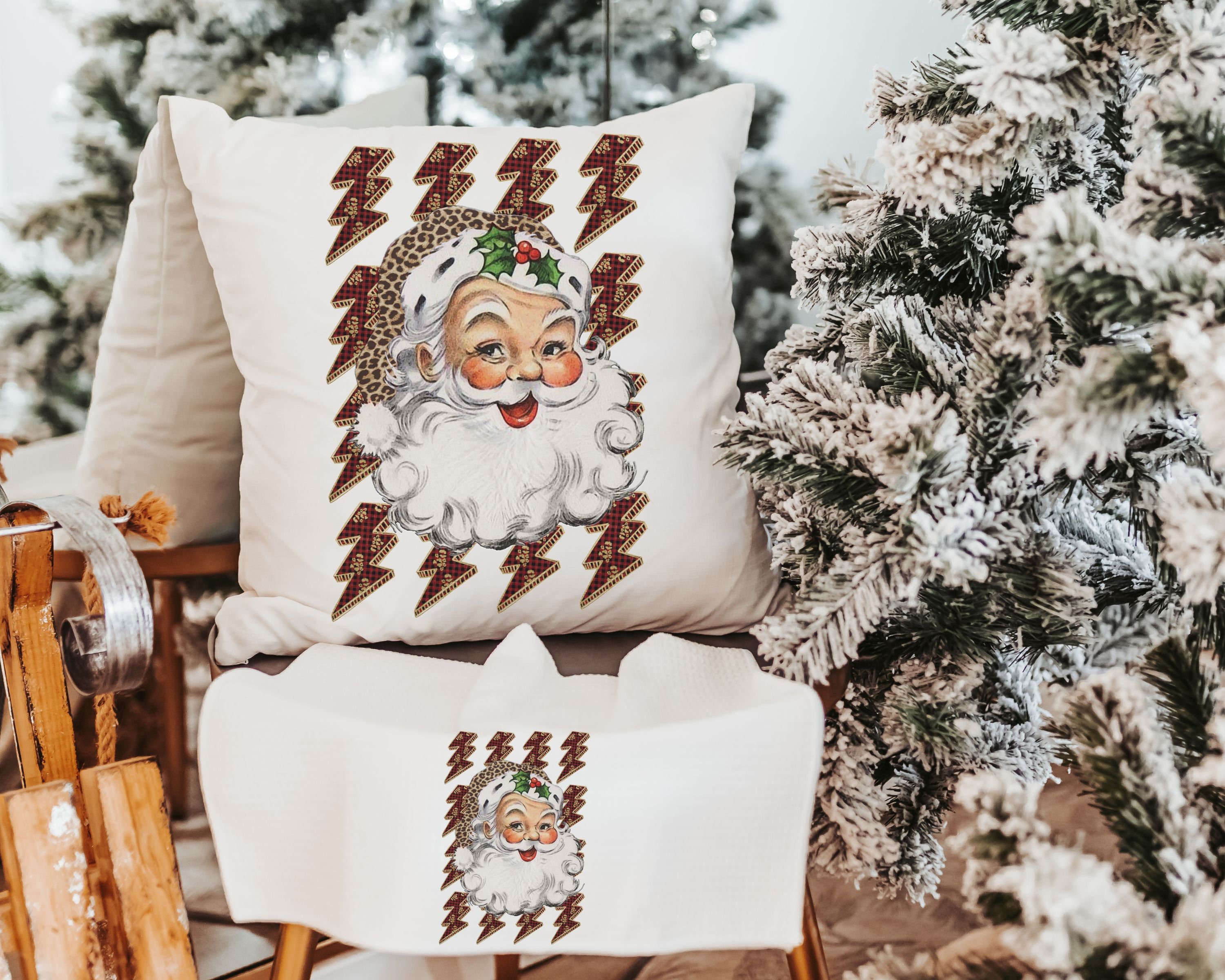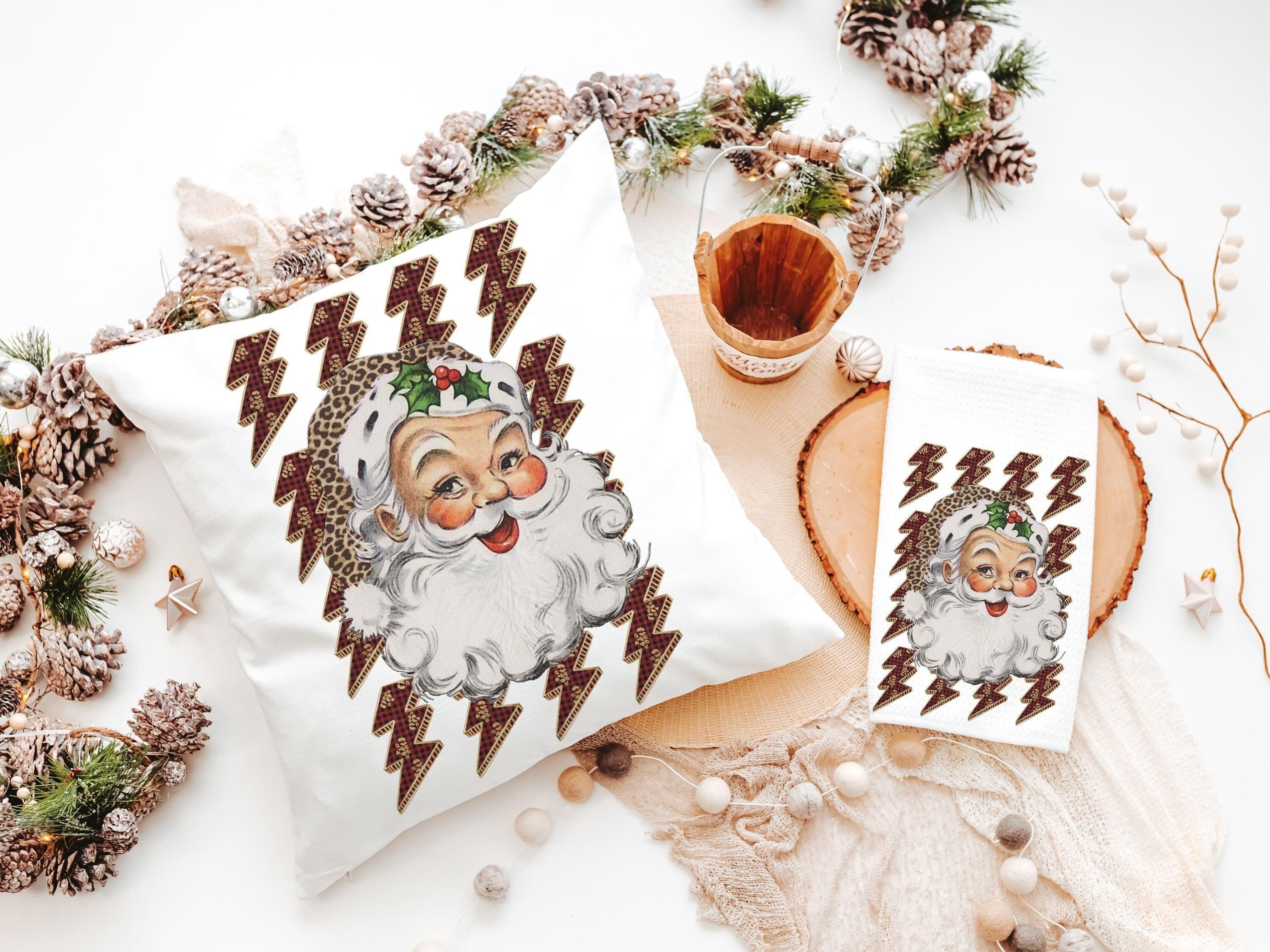 leopard print Santa throw pillow for couch, lightning bolt trendy Christmas kitchen towels for friends, secret Santa gifts for women, funky