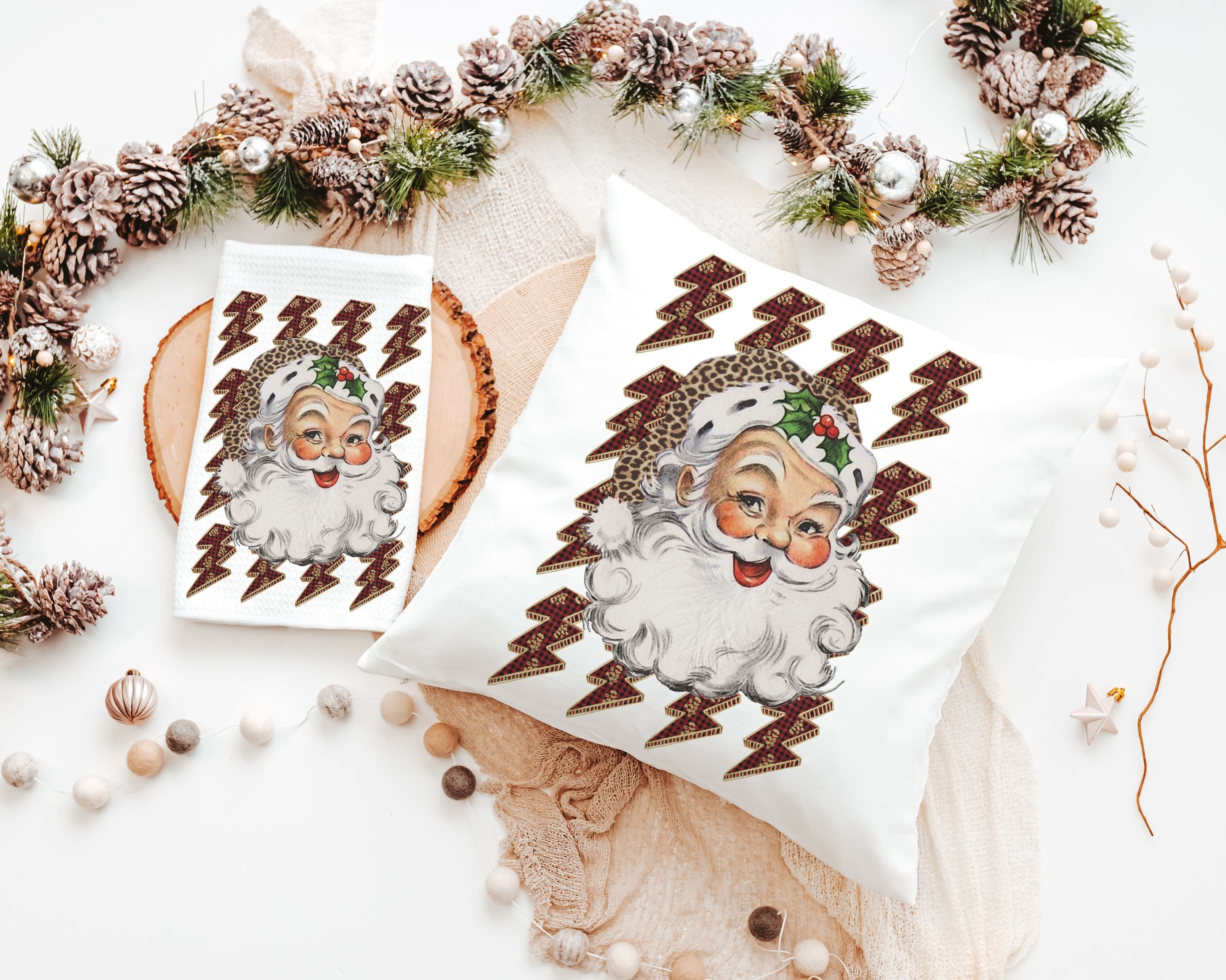 Add some cheer to the holidays with our Leopard Print Santa with Lighting Bolts Trendy Christmas Throw Pillows and matching Kitchen Towels. Perfect as secret Santa gifts or funky presents for friends, these unique pieces bring a modern, playful twist to Christmas decor. Purchase the pillow and towel separately or save by bundling them as a set for a standout gift for coworkers or a stylish addition to any festive home.