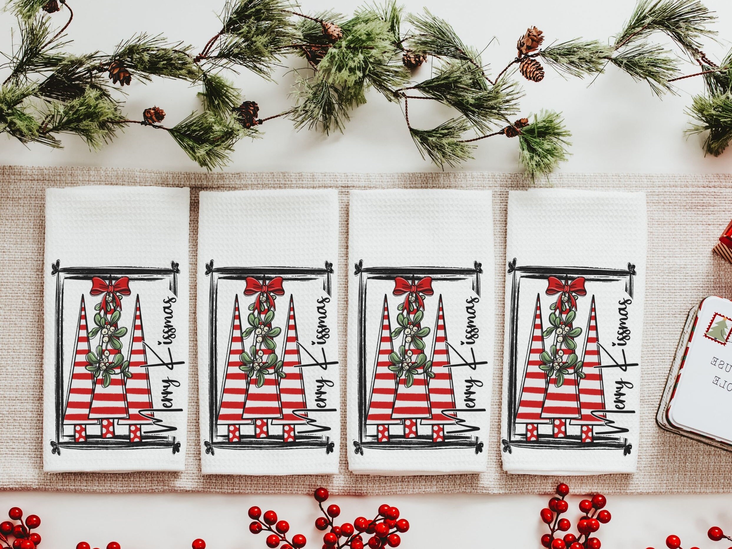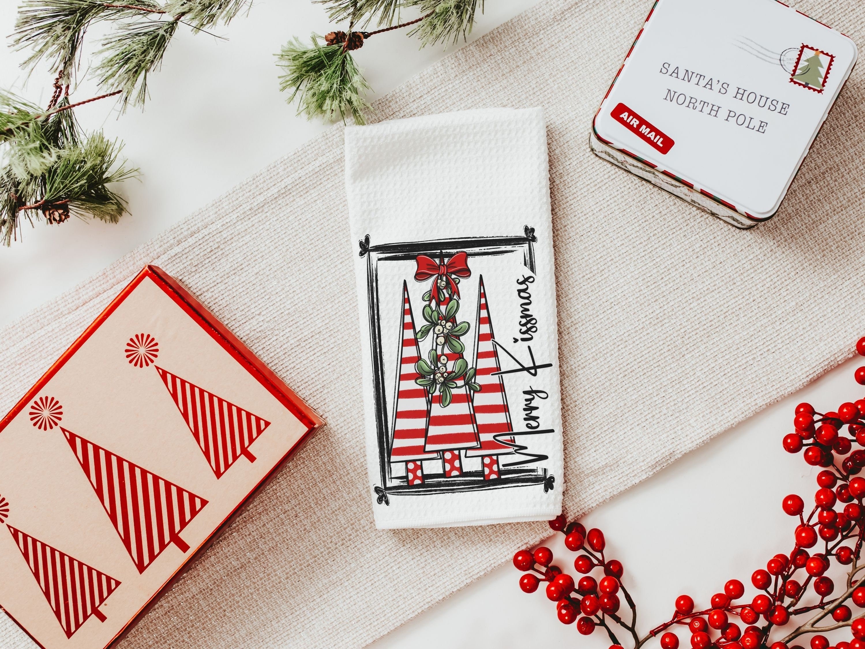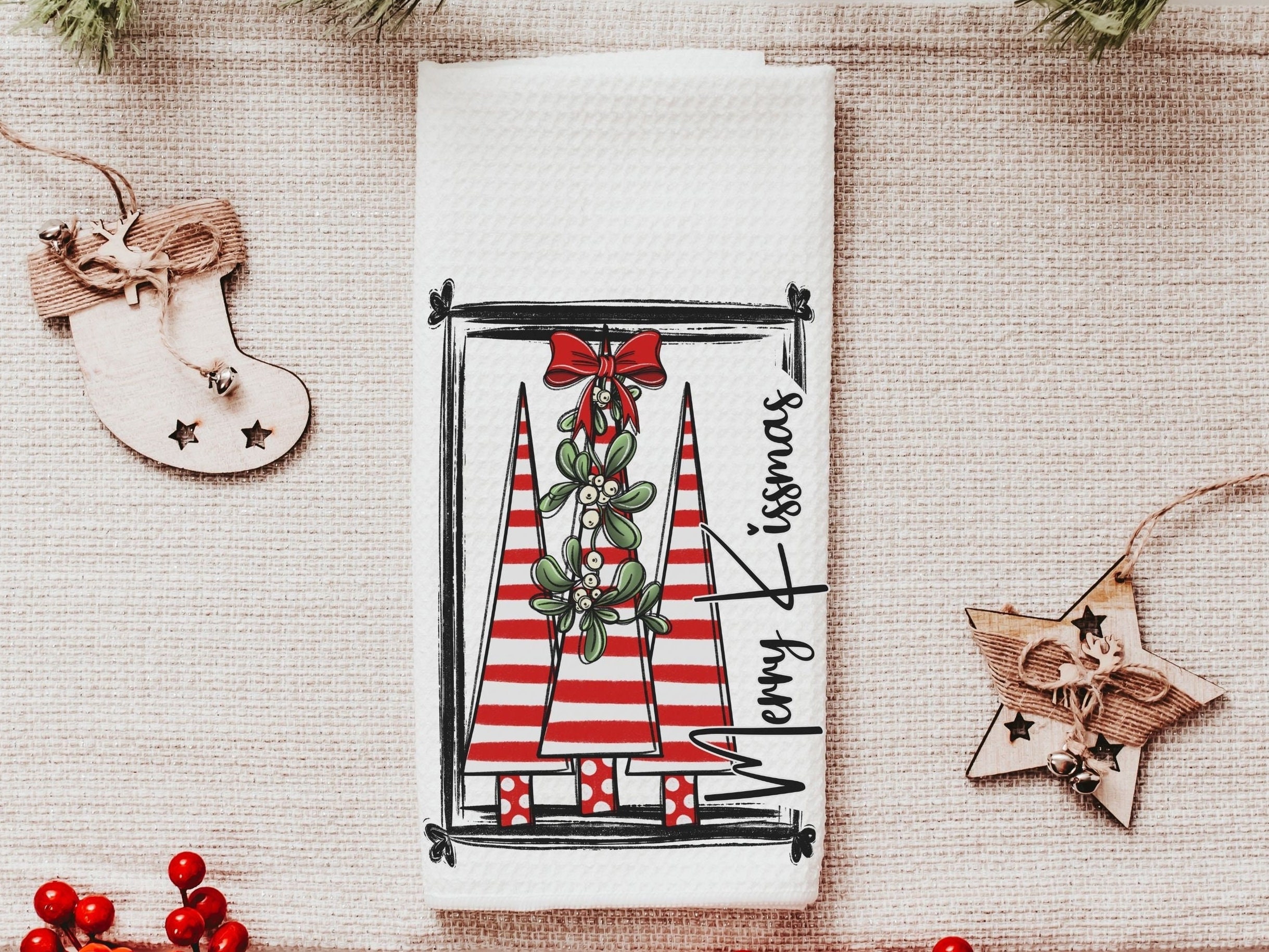 merry kissmas Christmas kitchen towels, cute Christmas housewarming gifts for couple, candy cane Christmas tree Christmas kitchen hand towel