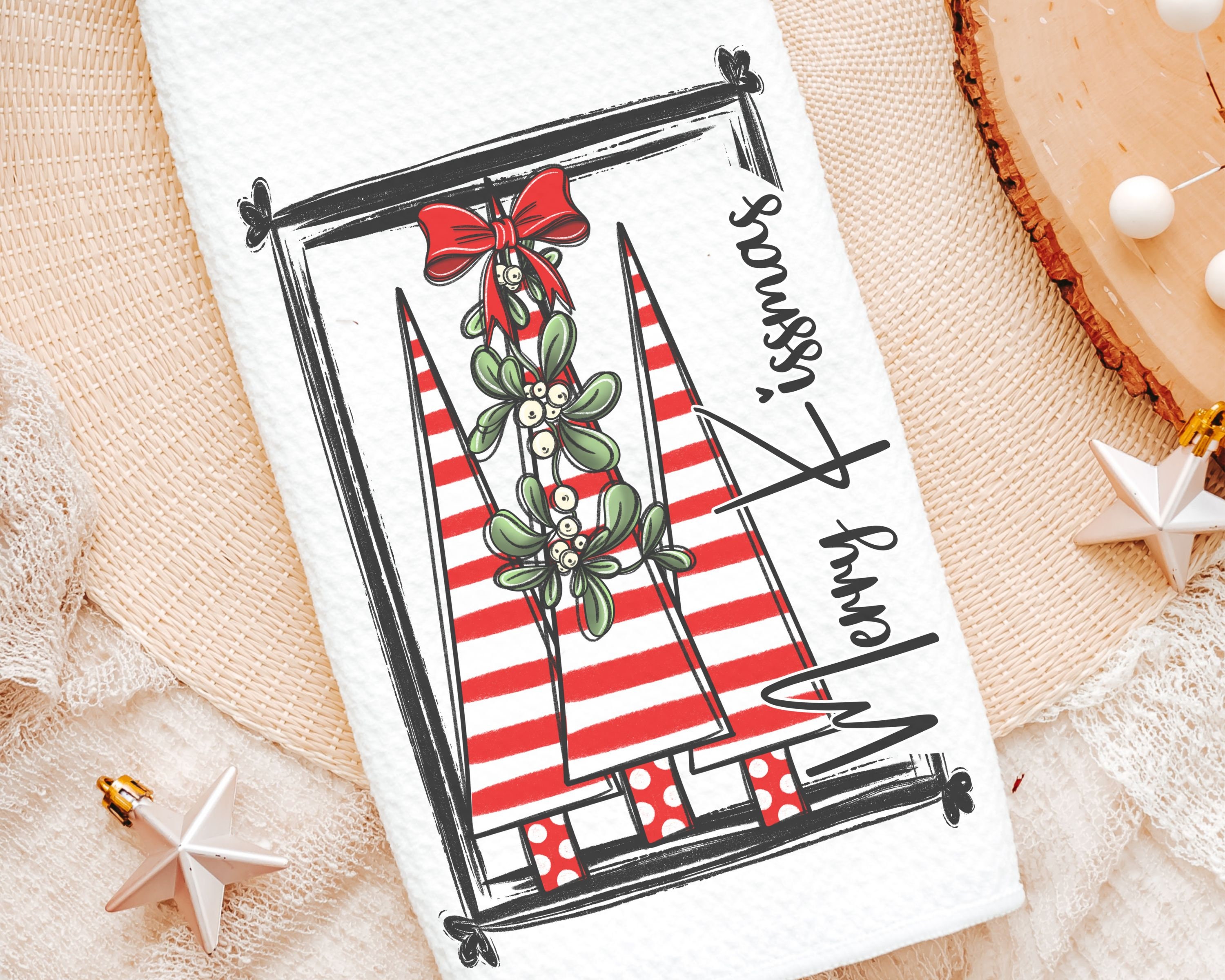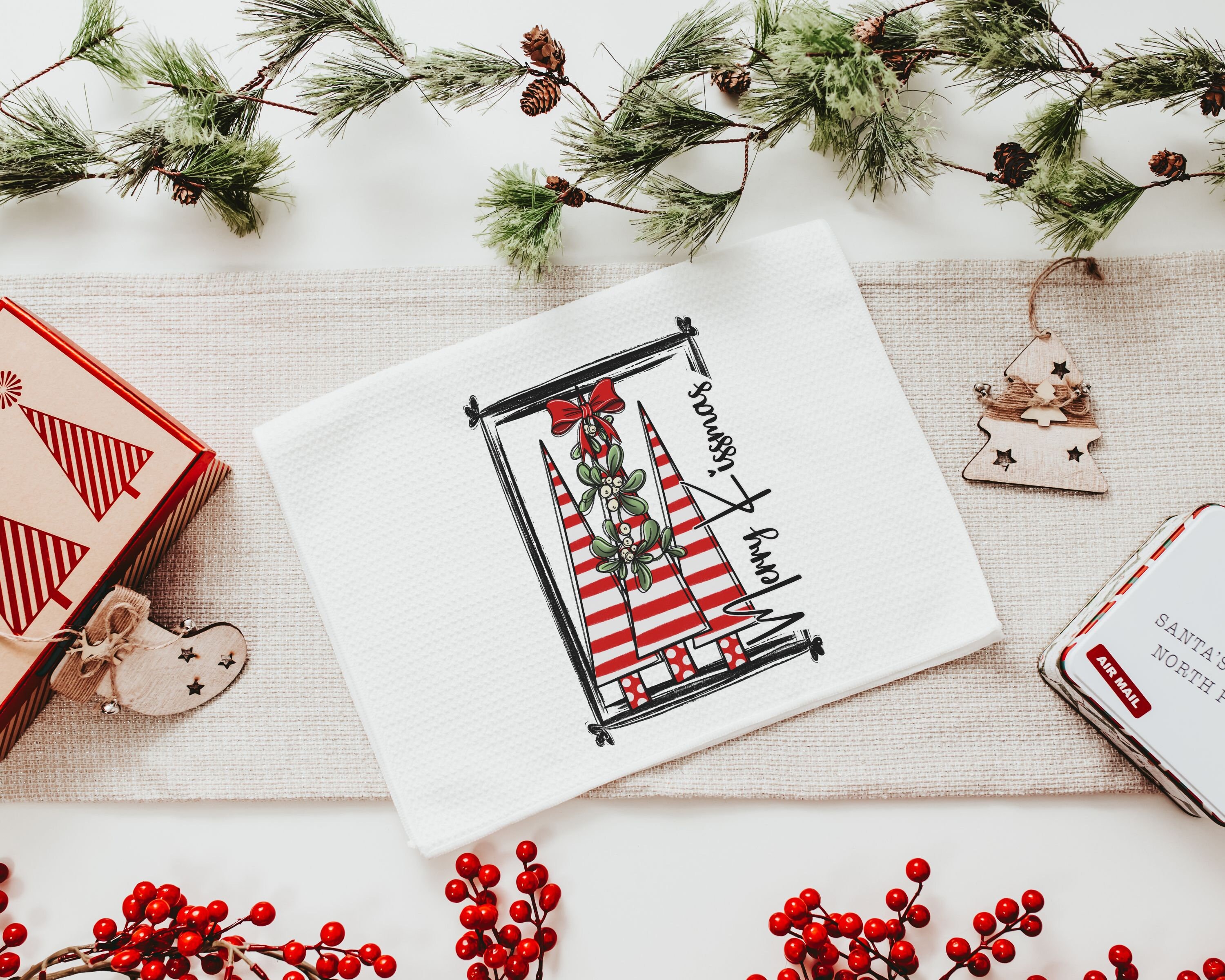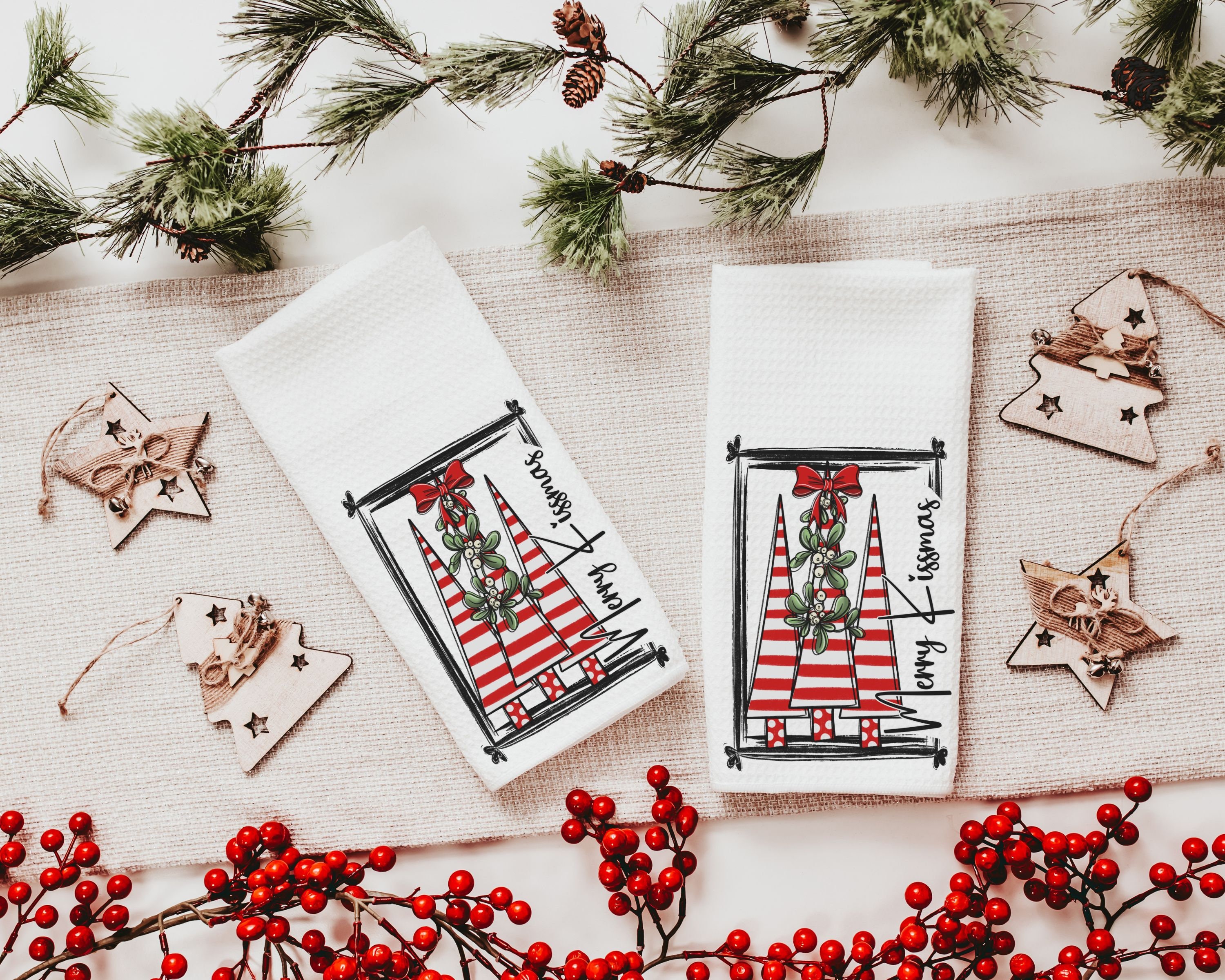 merry kissmas Christmas kitchen towels, cute Christmas housewarming gifts for couple, candy cane Christmas tree Christmas kitchen hand towel