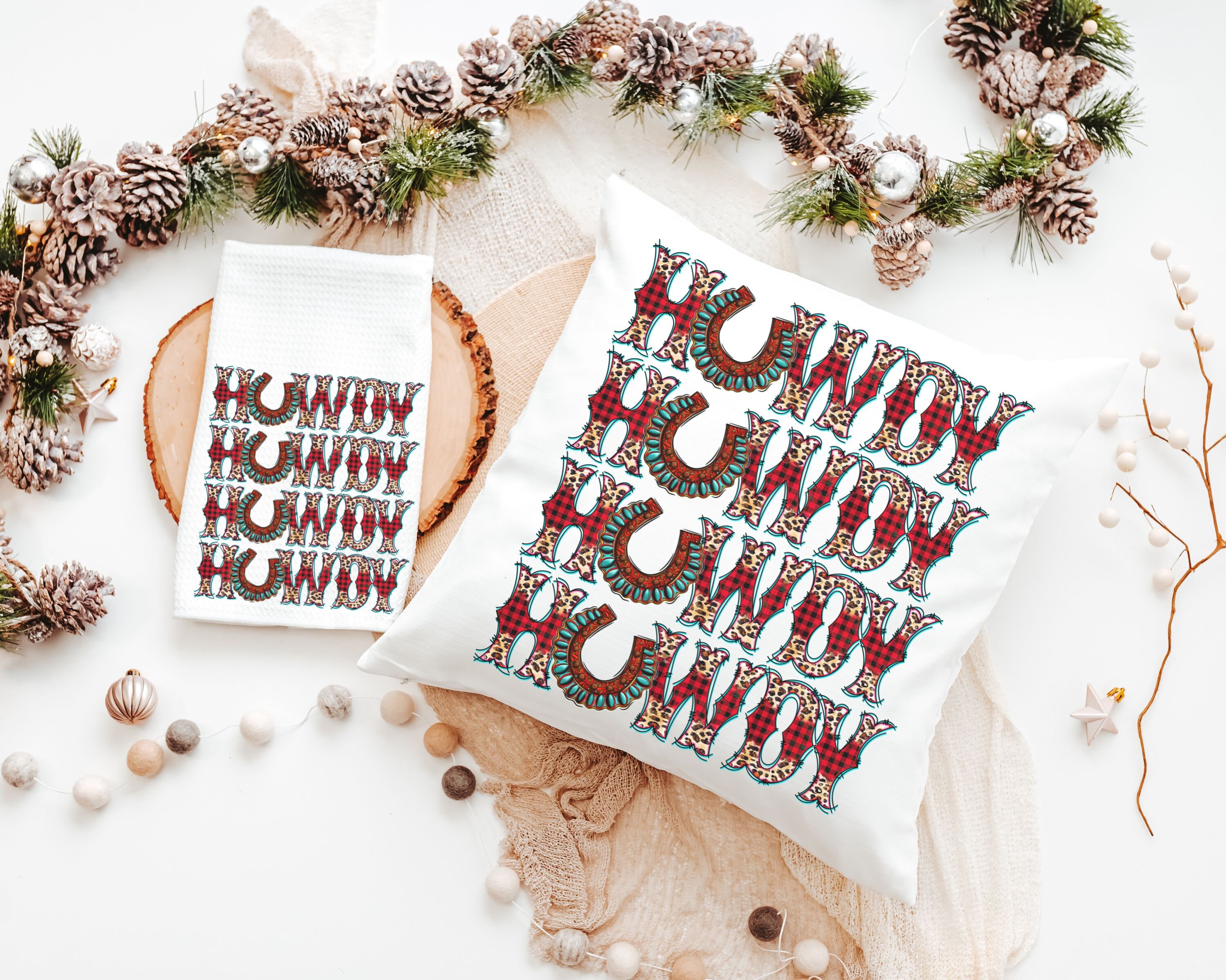 howdy Christmas throw pillow for sofa, western Christmas decor for home, country Christmas kitchen towels, trendy Christmas hostess gifts