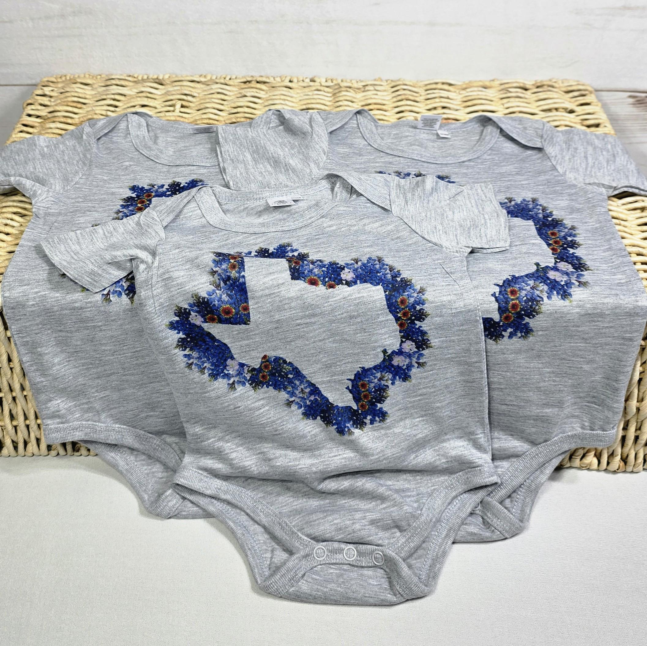 Sweet and simple, this Texas wildflower baby outfit features a bluebonnet outline of the Lone Star State. A sweet gift for baby girls and boys, perfect for showers, coming home, or everyday wear in your favorite floral Texas theme.