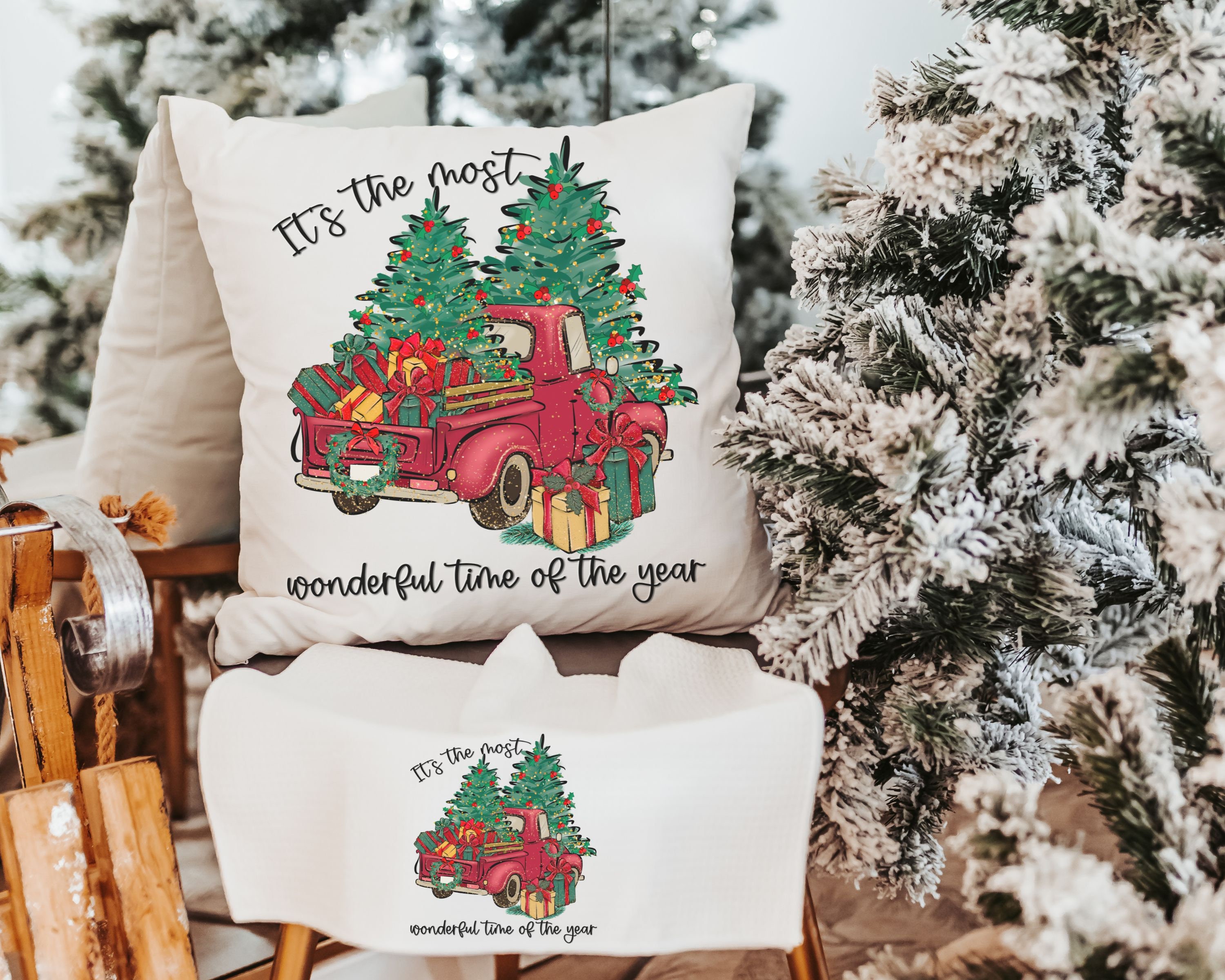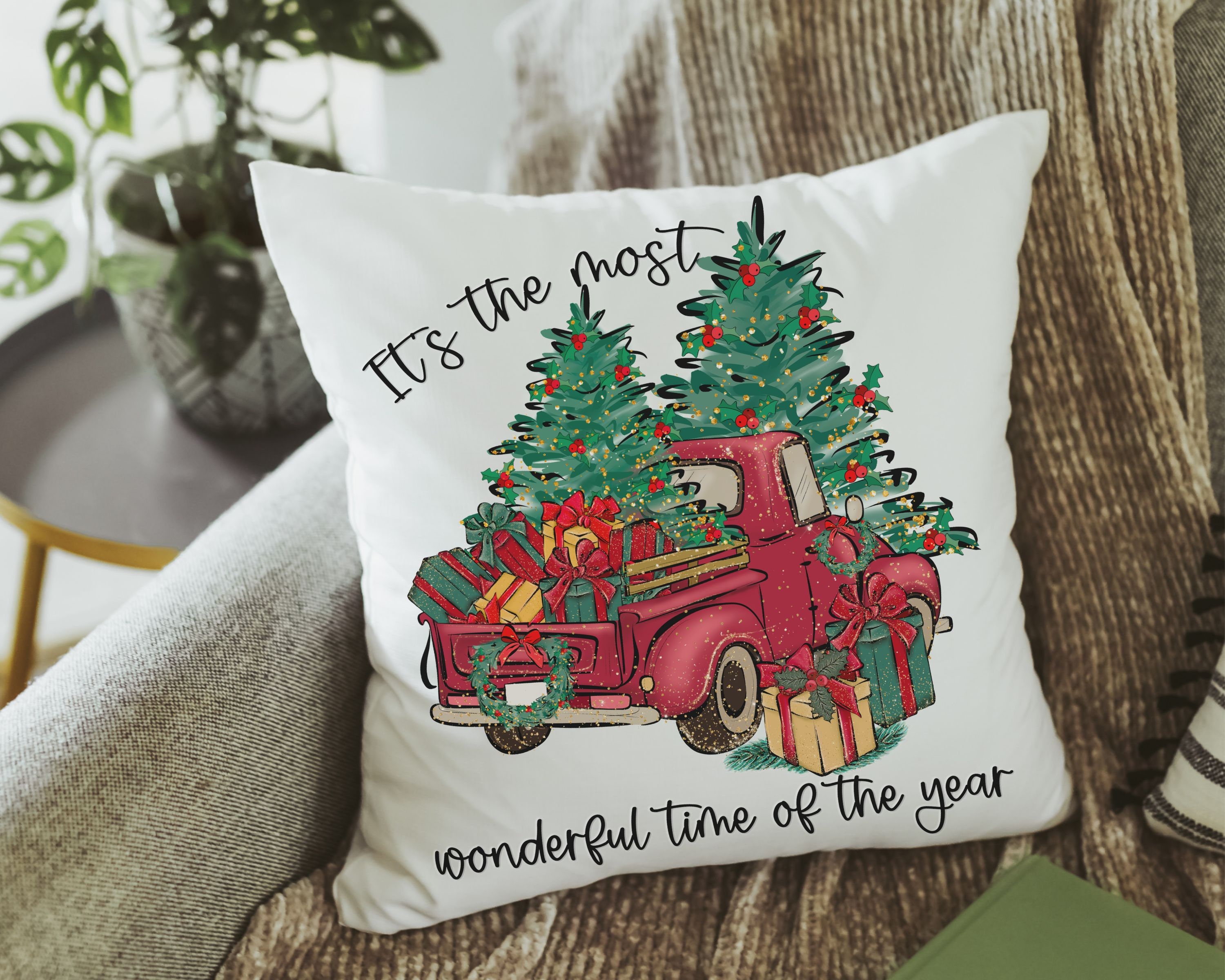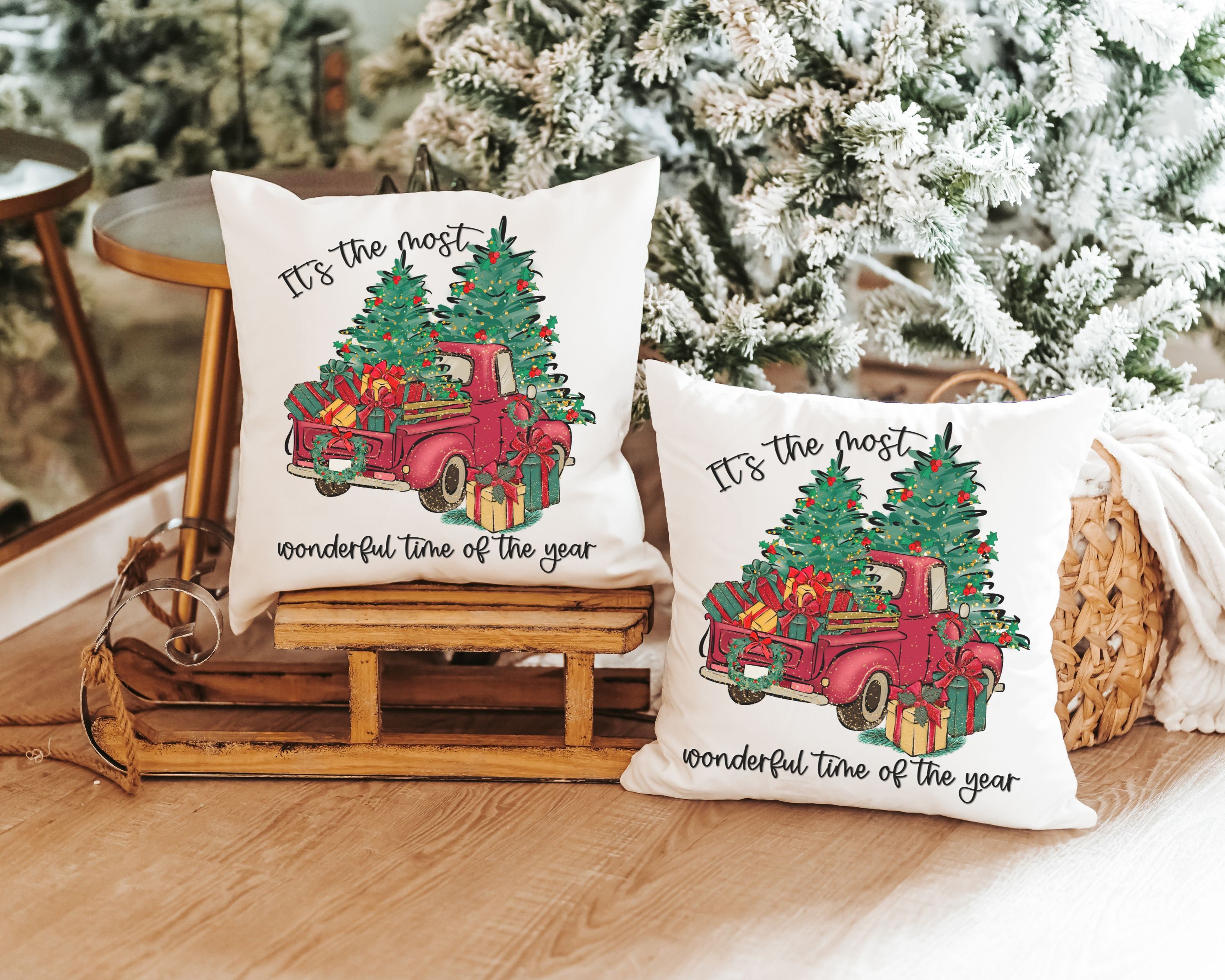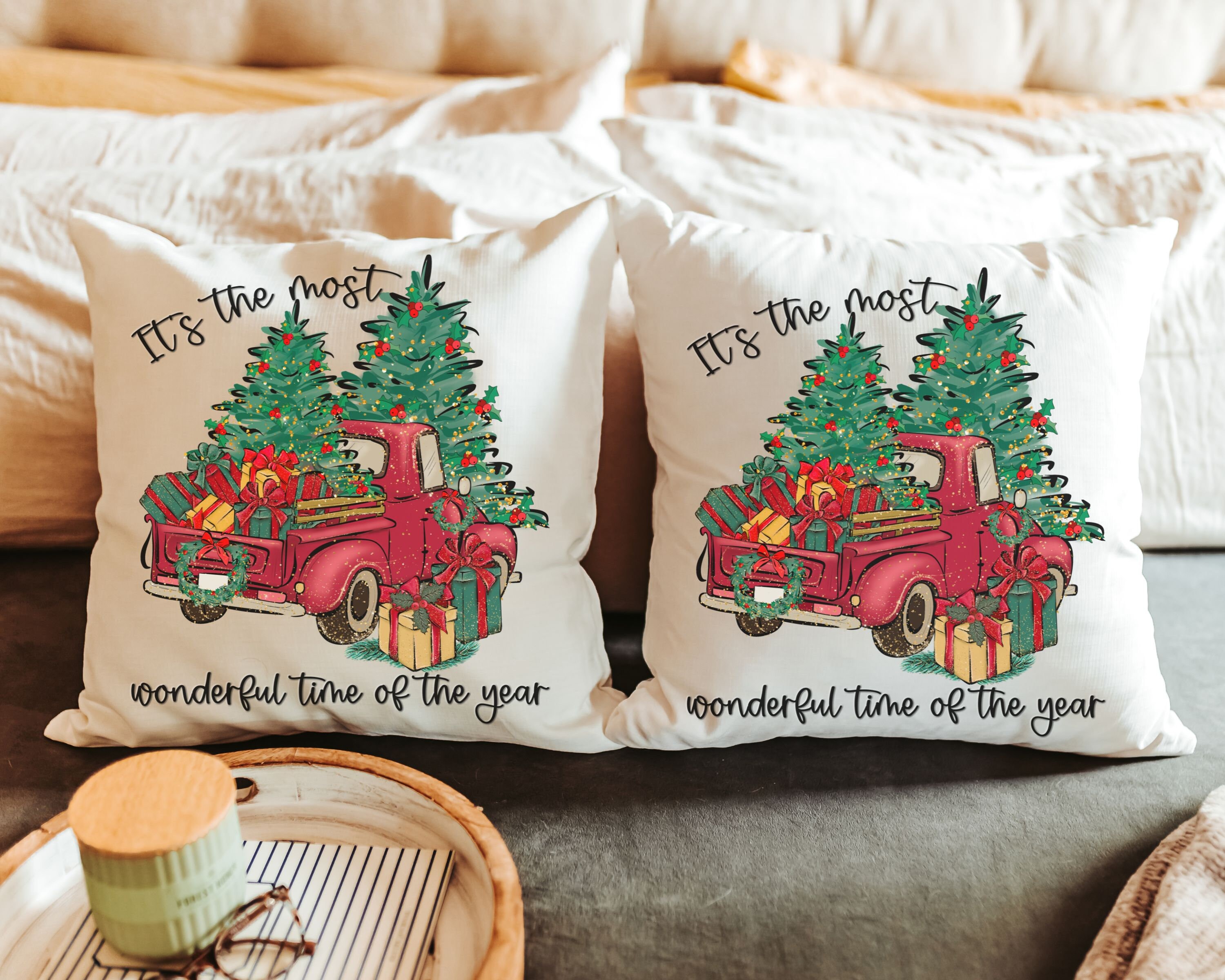 its the most wonderful time of the year Christmas throw pillow for sofa, red truck Christmas decor for home, whimsical Christmas gifts for