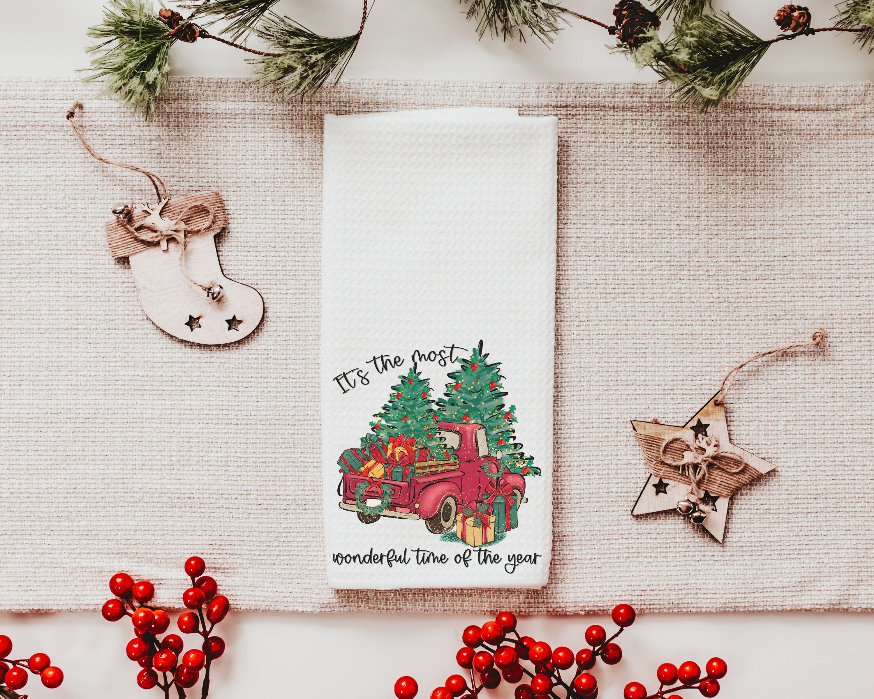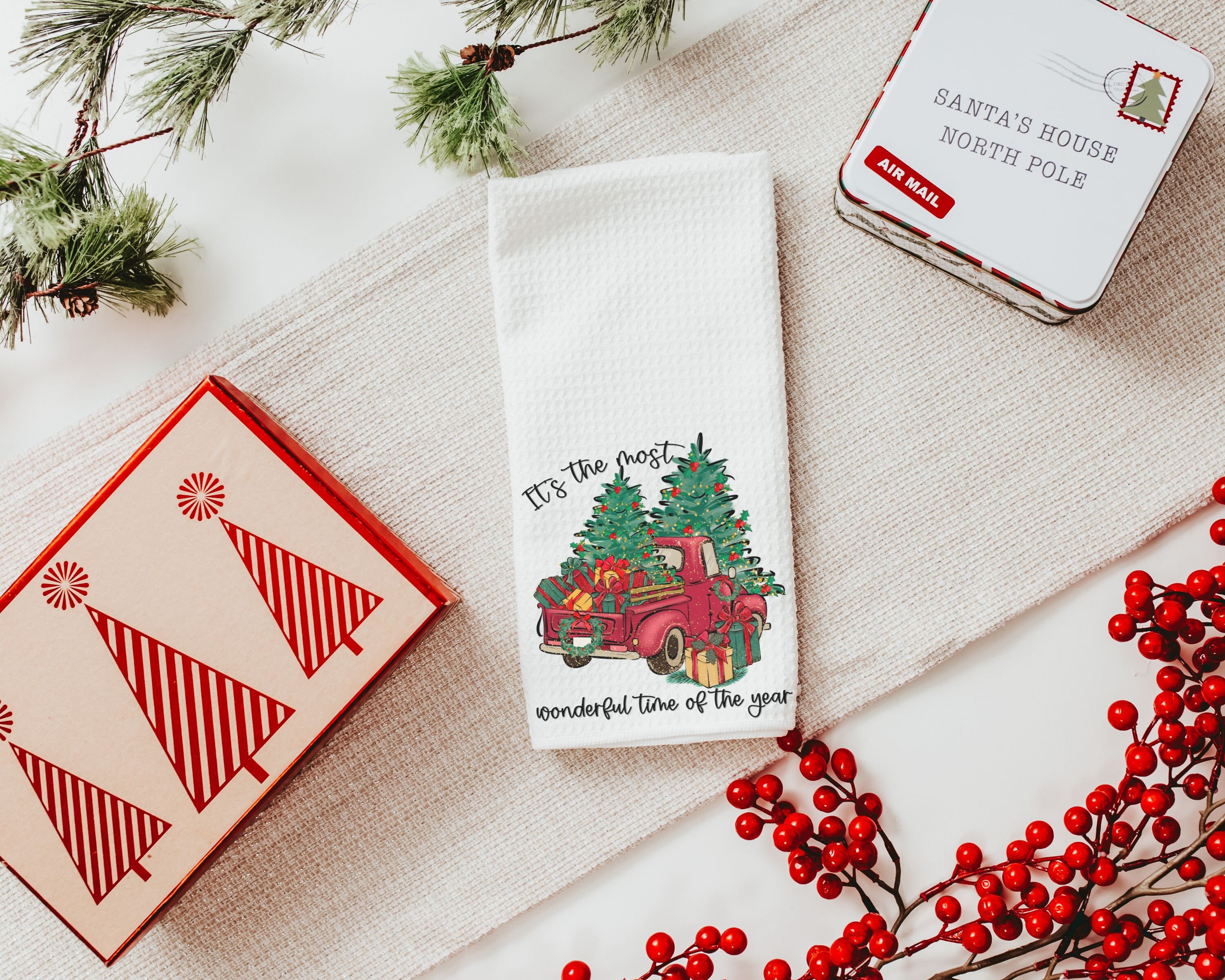 Celebrate the season in style with this “It’s the Most Wonderful Time of the Year” Christmas throw pillow for your sofa and the matching towels. A cute Christmas gift set, perfect for adding festive charm to your home decor. Available individually or as a complete set.