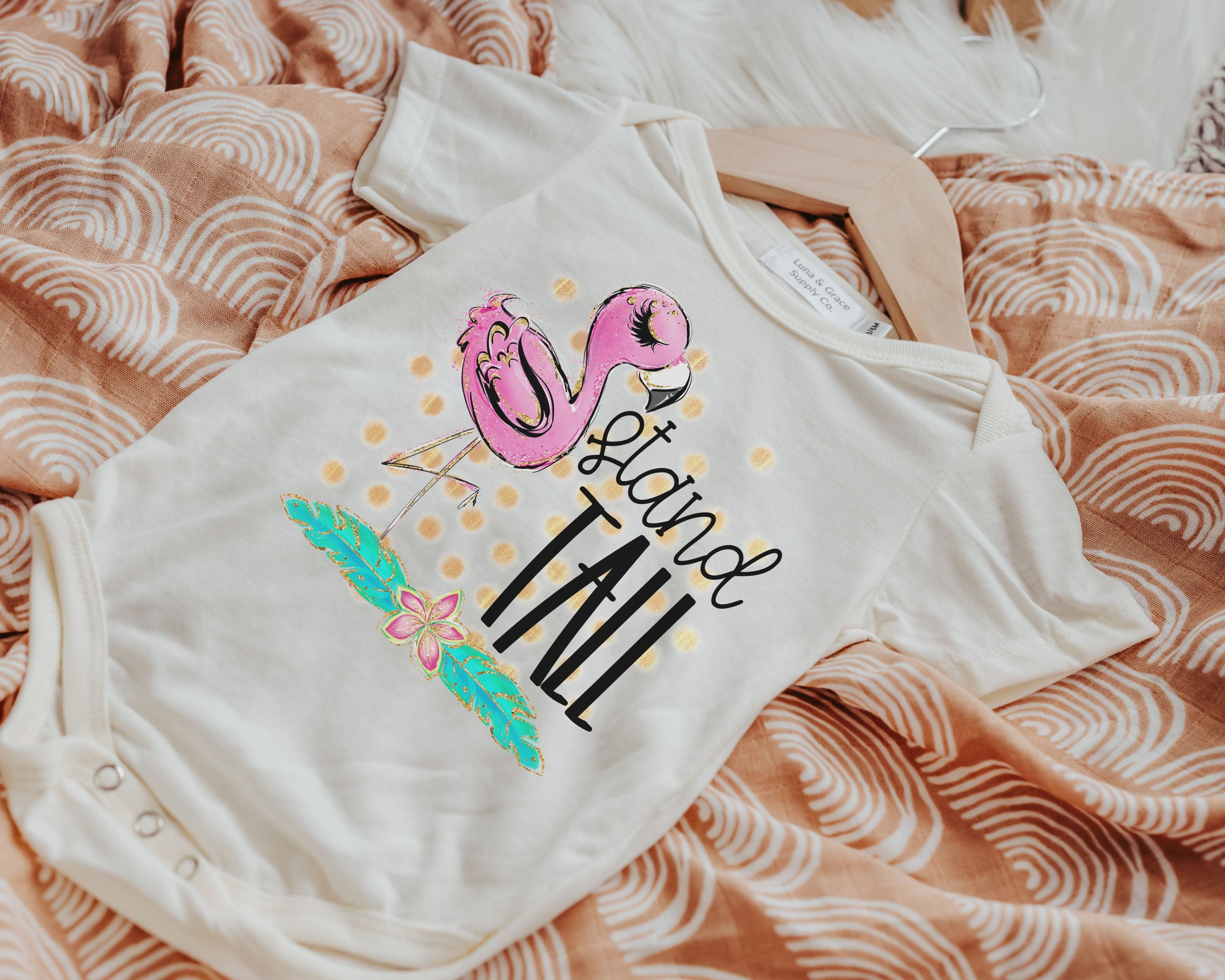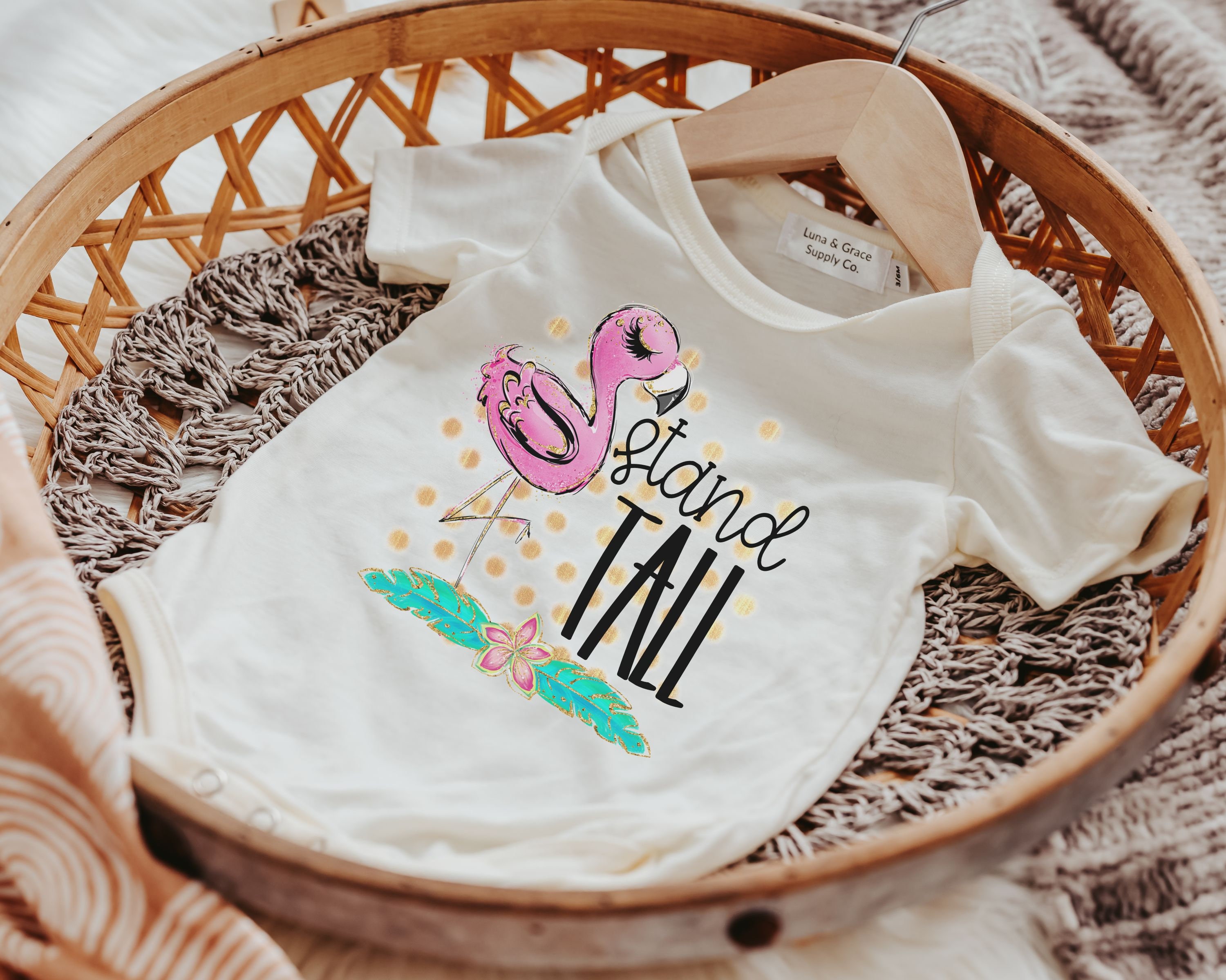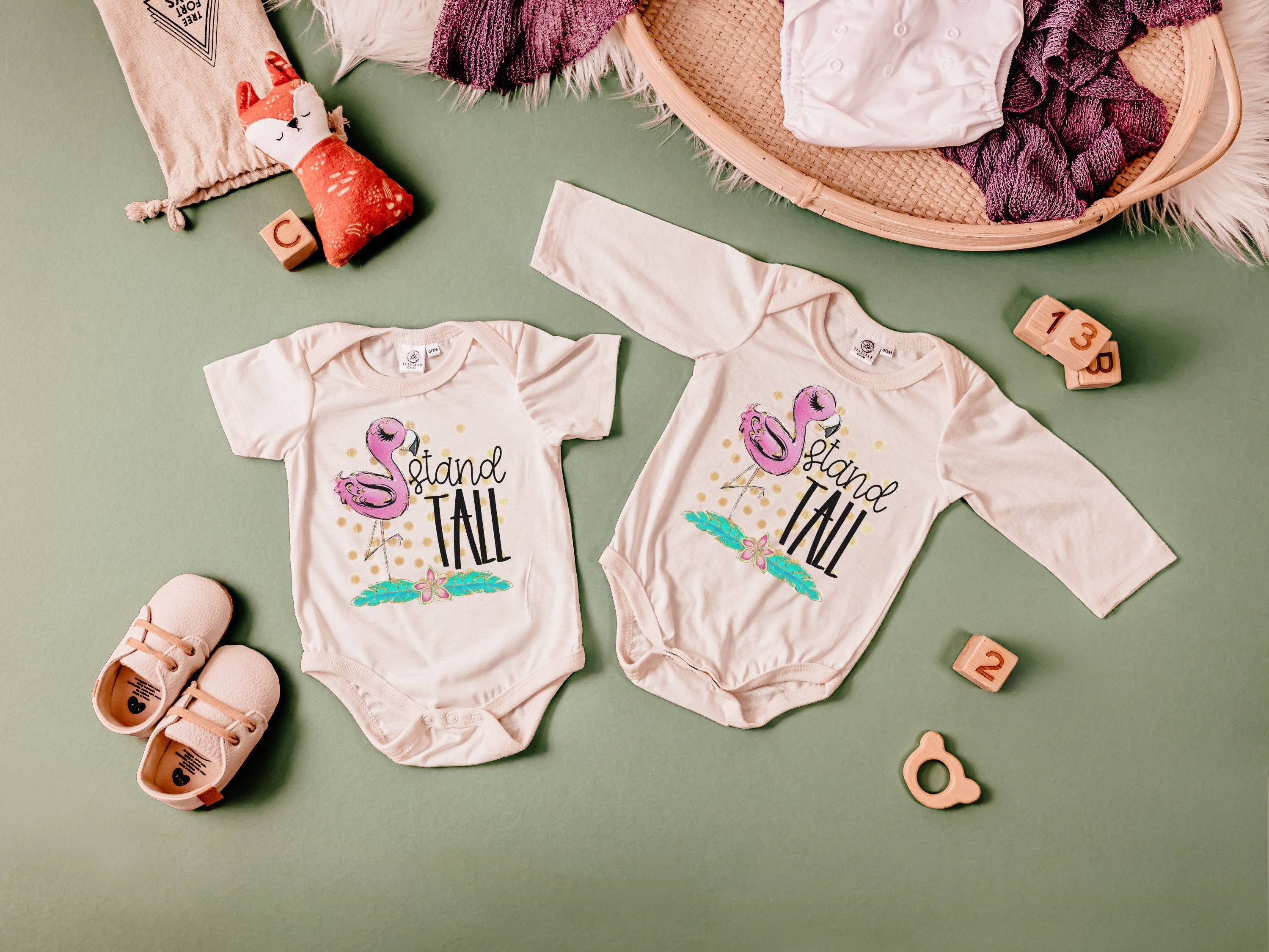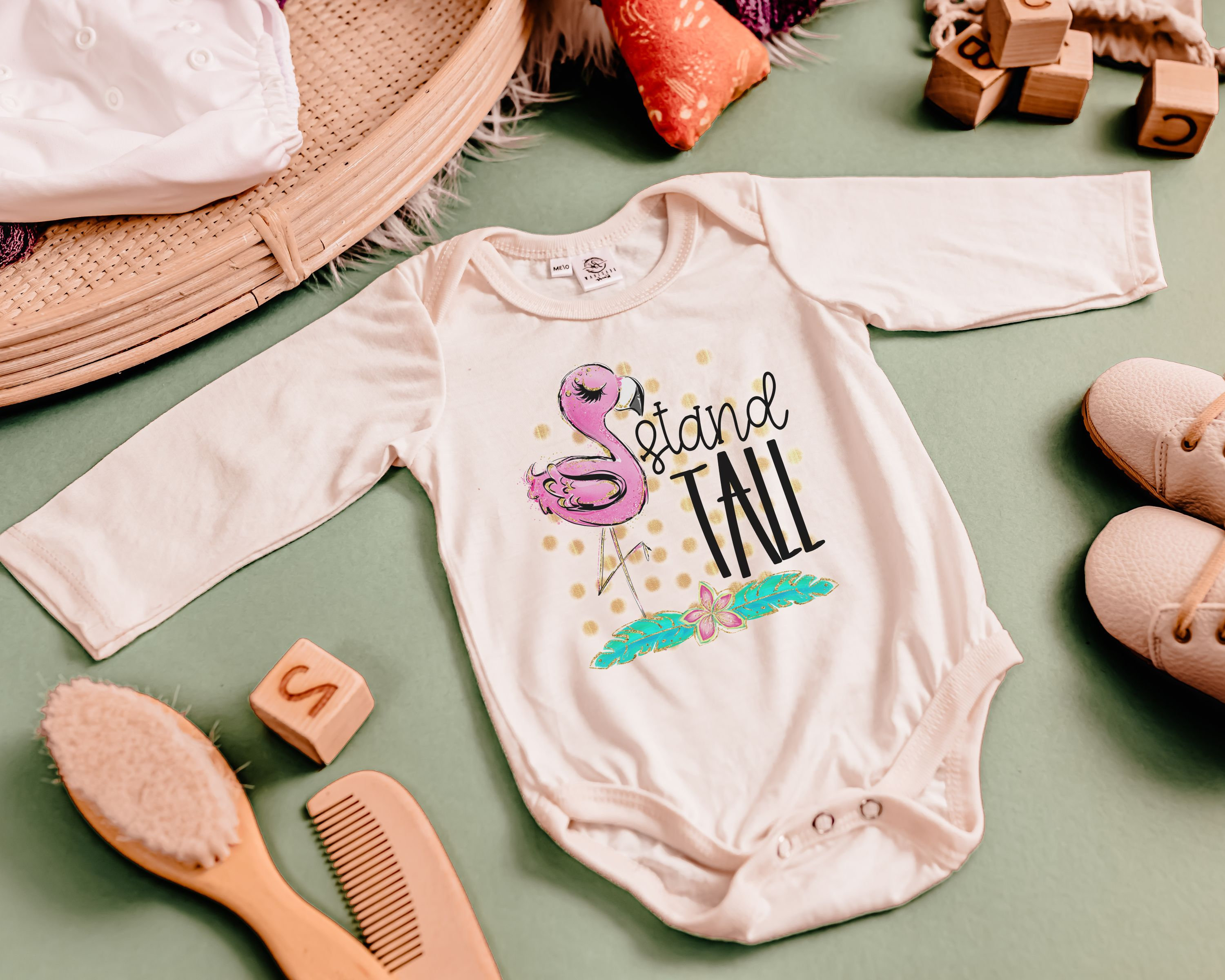 Dress your little one in style with our Stand Tall Flamingo baby bodysuit. This adorable outfit is perfect for newborn girls, whether it's for their coming home outfit or a memorable cake smash photoshoot. The flamingo design adds a touch of whimsy and charm to their wardrobe. Give the gift of inspiration with our collection of inspirational baby gifts, including this cute flamingo baby clothes. Let your little one stand out and make a statement with this unique and eye-catching bodysuit. It's the perfect addition to any baby girl's wardrobe. Shop now and dress your baby in style with our Stand Tall Flamingo baby bodysuit, perfect for newborn girls and a great gift idea for any occasion.