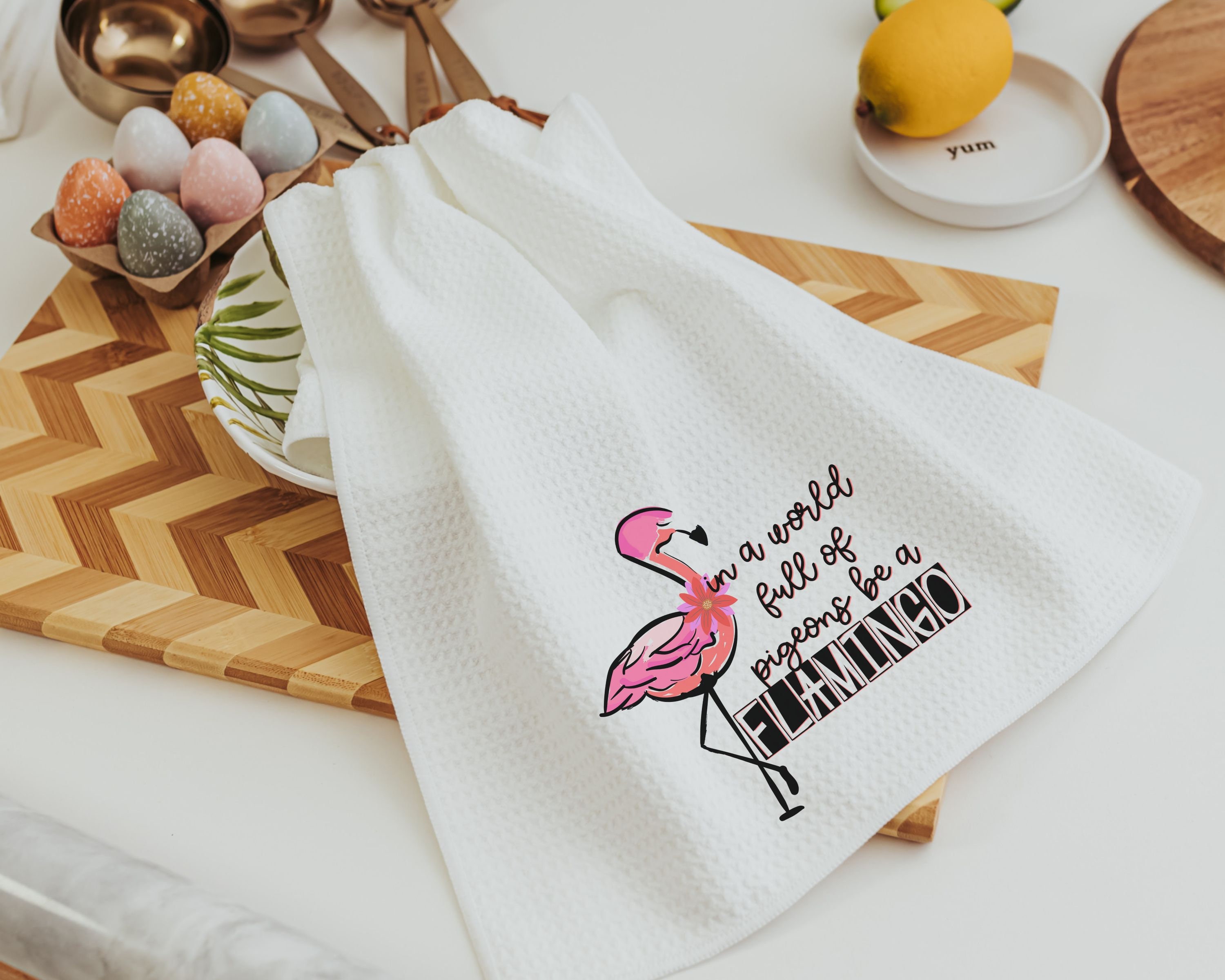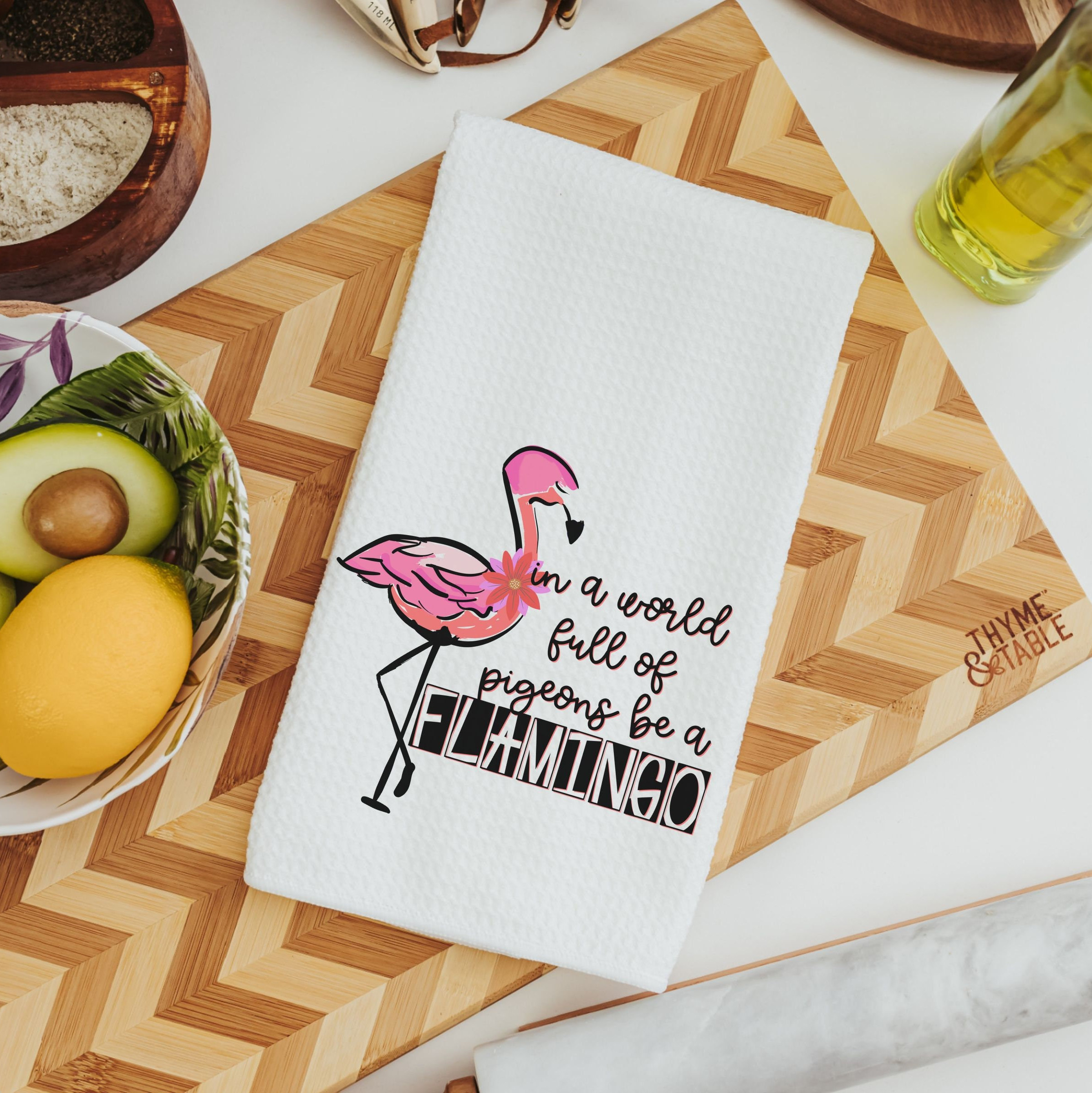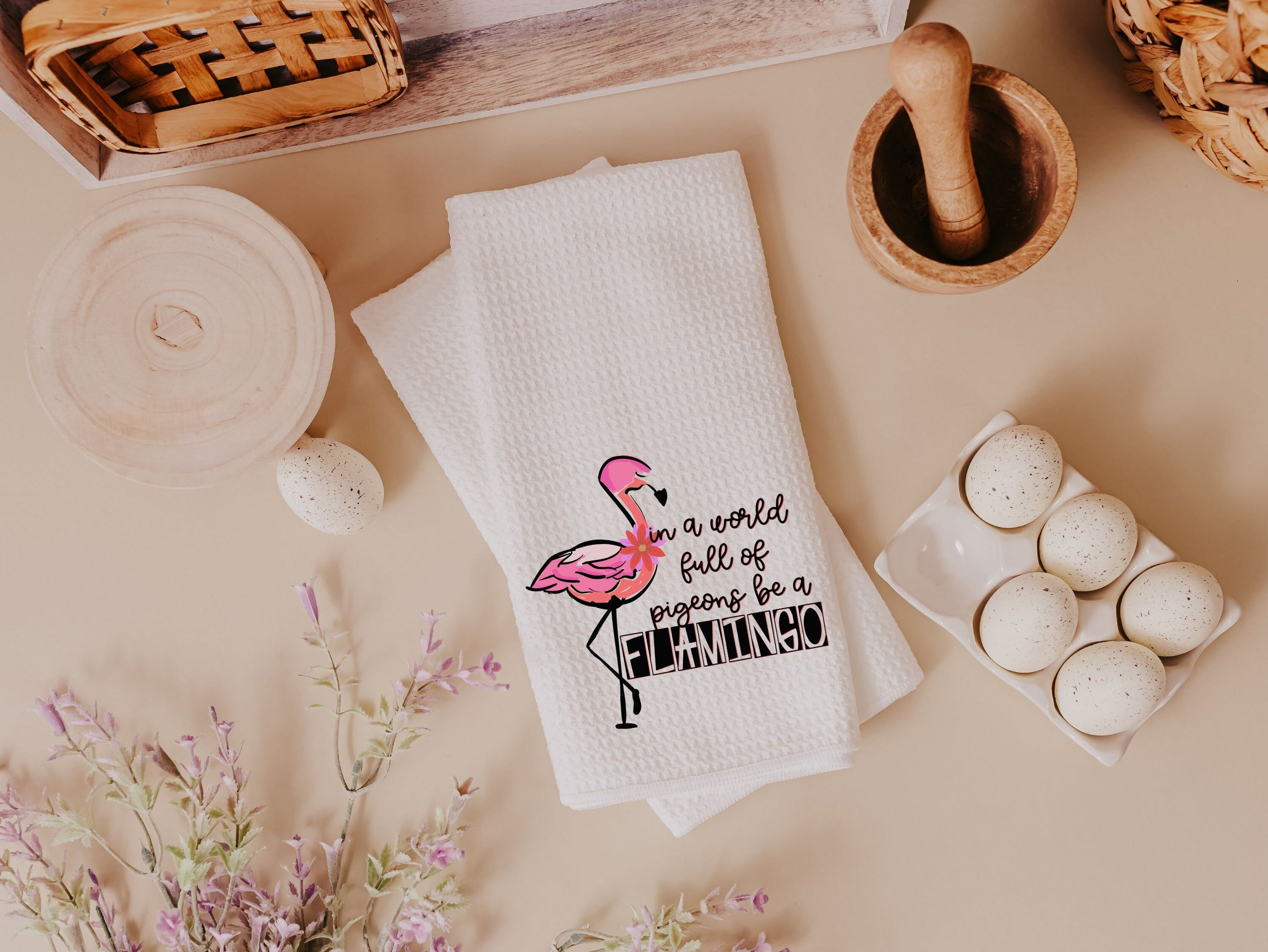 Add a splash of fun to your home with our In a World Full of Pigeons Be a Flamingo kitchen towels, perfect for gifting to friends. These flamingo towels are ideal gifts for beach lovers and make great surprise gifts. Whether for the kitchen or as a thoughtful present, these flamingo gifts are sure to bring a smile to anyone who loves a touch of flamingo in their home!