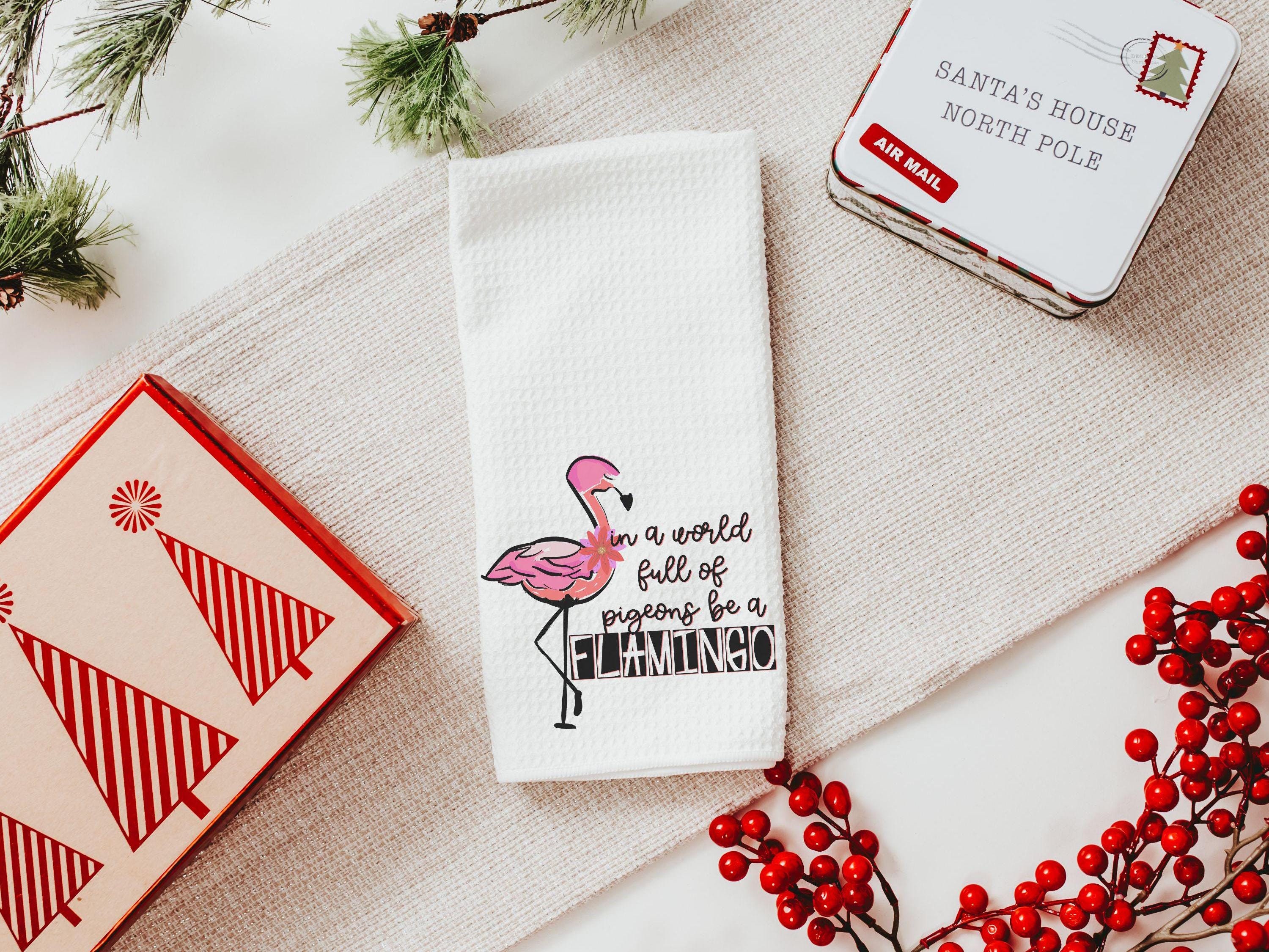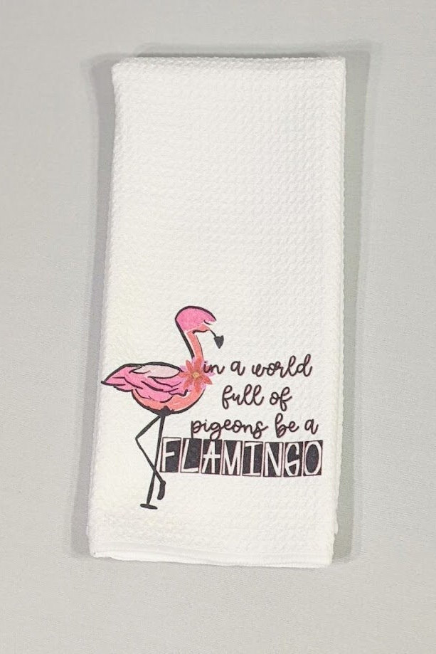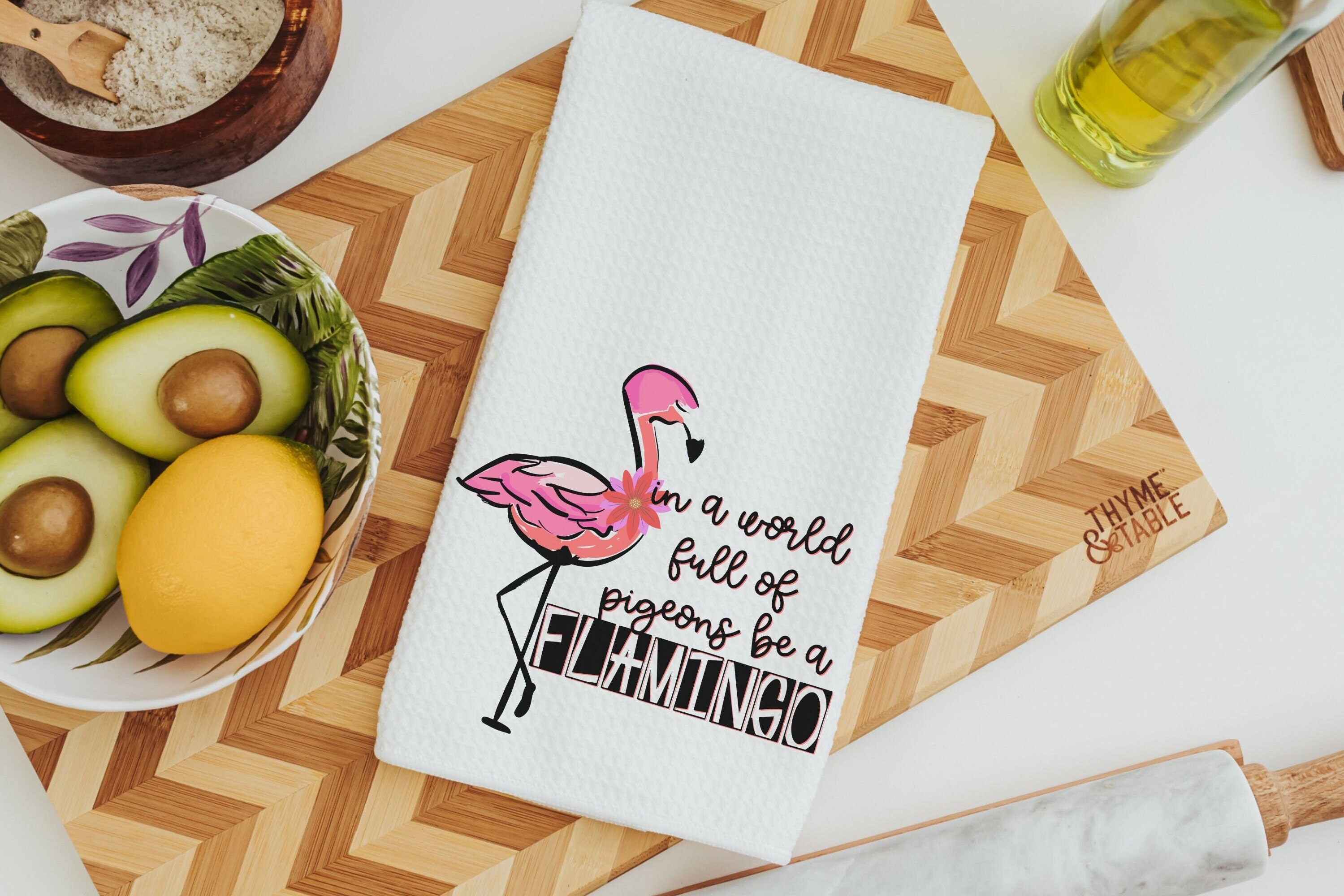 Add a splash of fun to your home with our In a World Full of Pigeons Be a Flamingo kitchen towels, perfect for gifting to friends. These flamingo towels are ideal gifts for beach lovers and make great surprise gifts. Whether for the kitchen or as a thoughtful present, these flamingo gifts are sure to bring a smile to anyone who loves a touch of flamingo in their home!