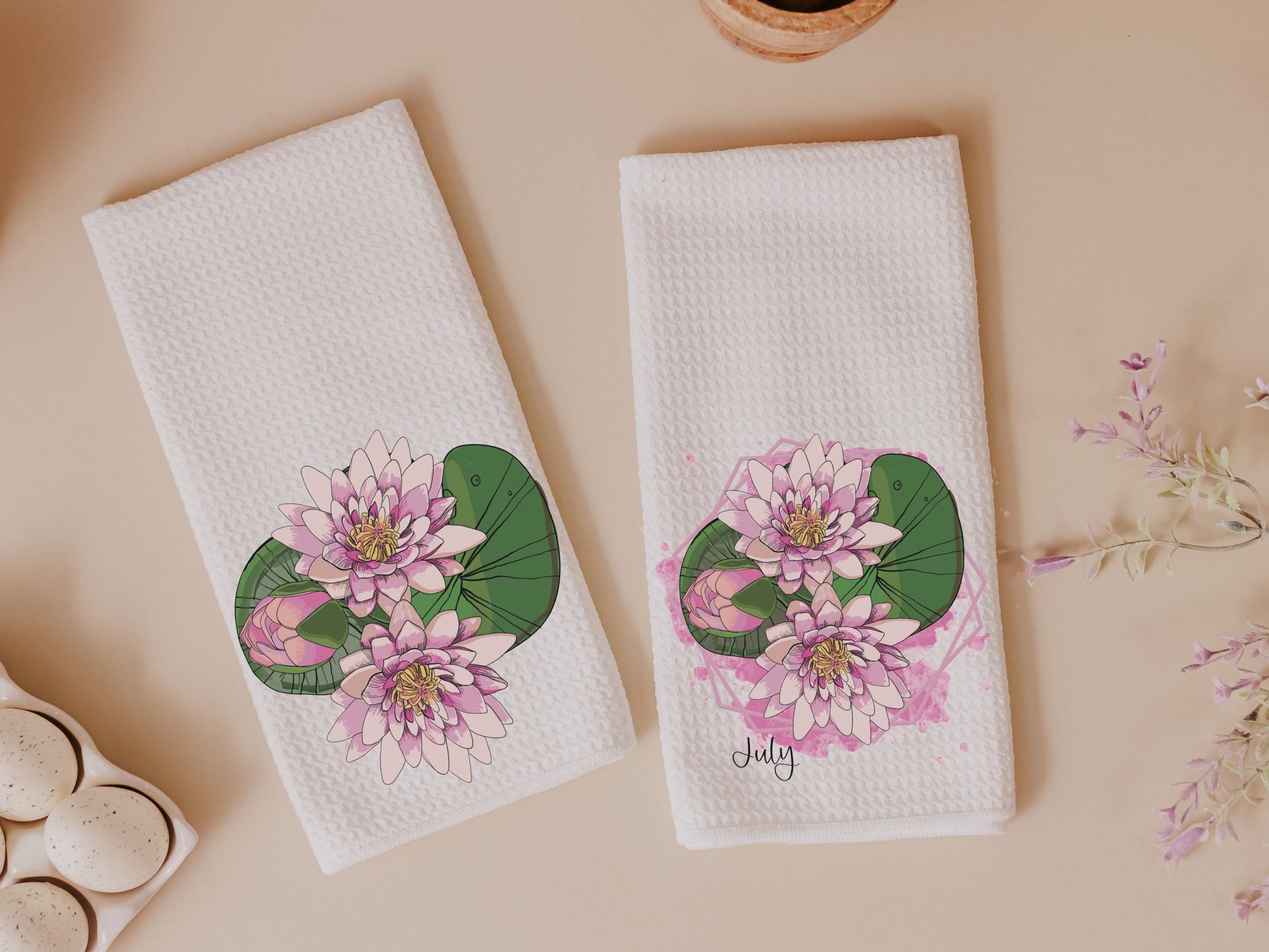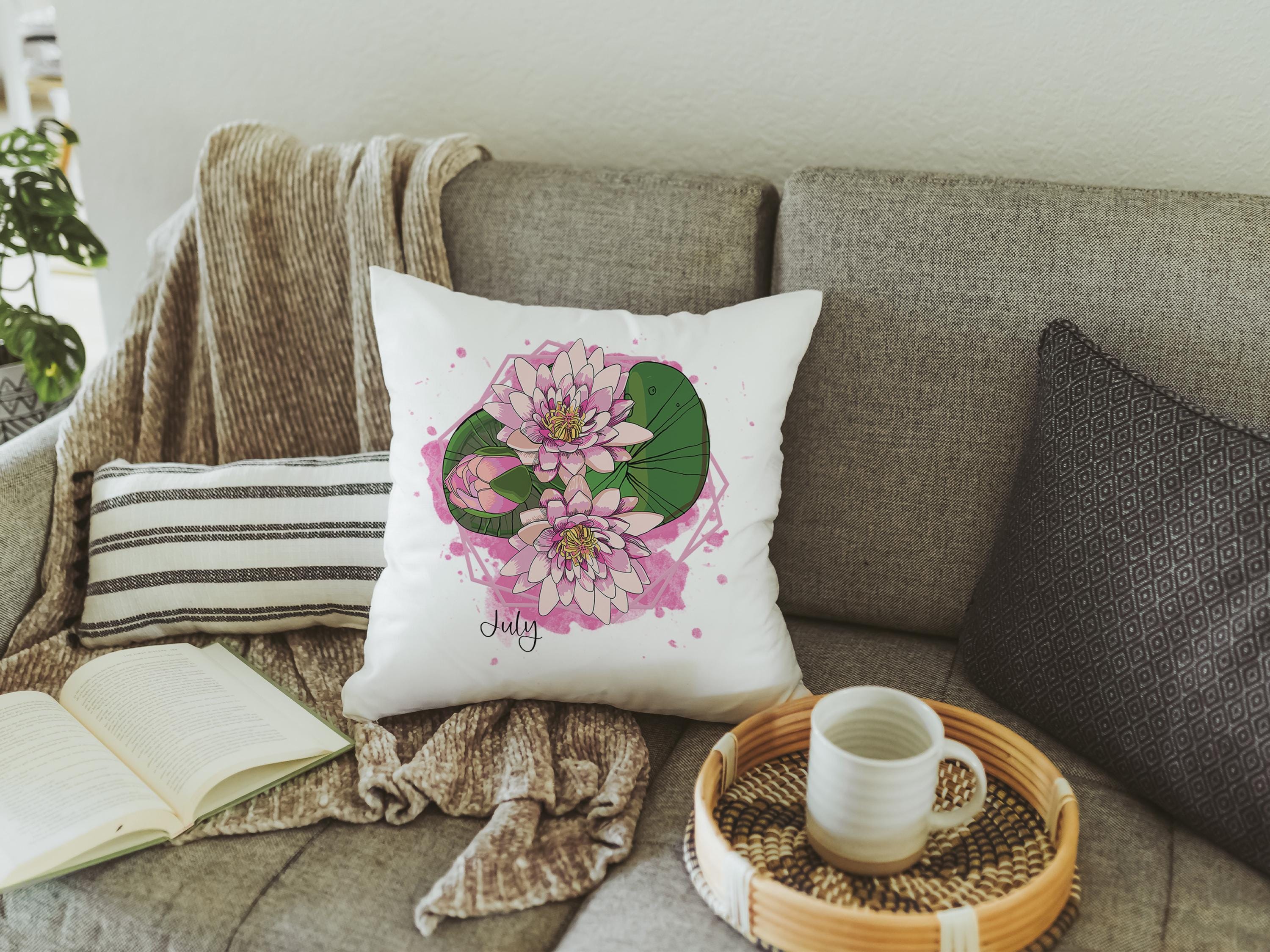 July birth flower throw pillow for bed, larkspur kitchen towels, water lily birth month flower decor, July birthday gifts for her, Leo gifts