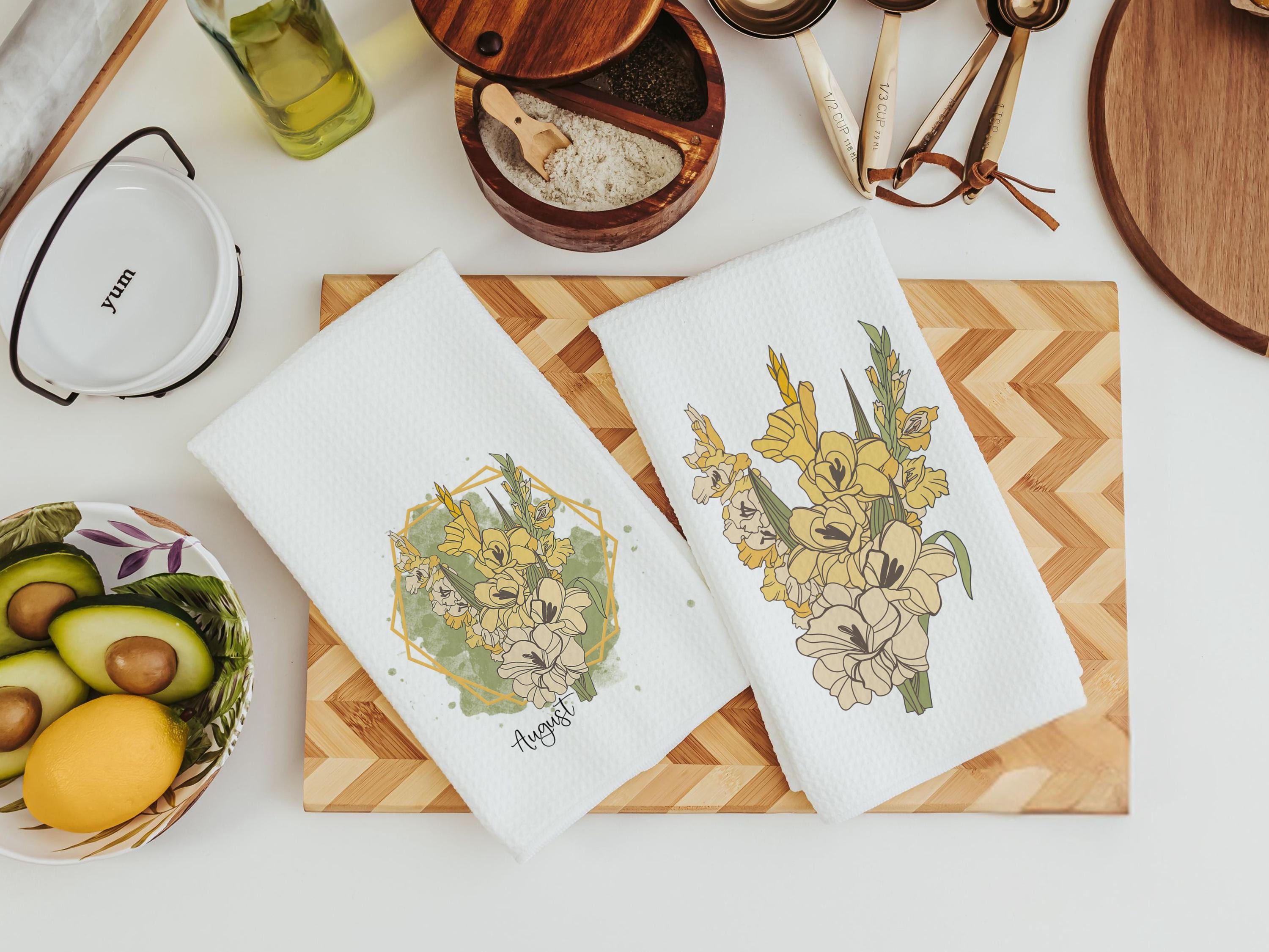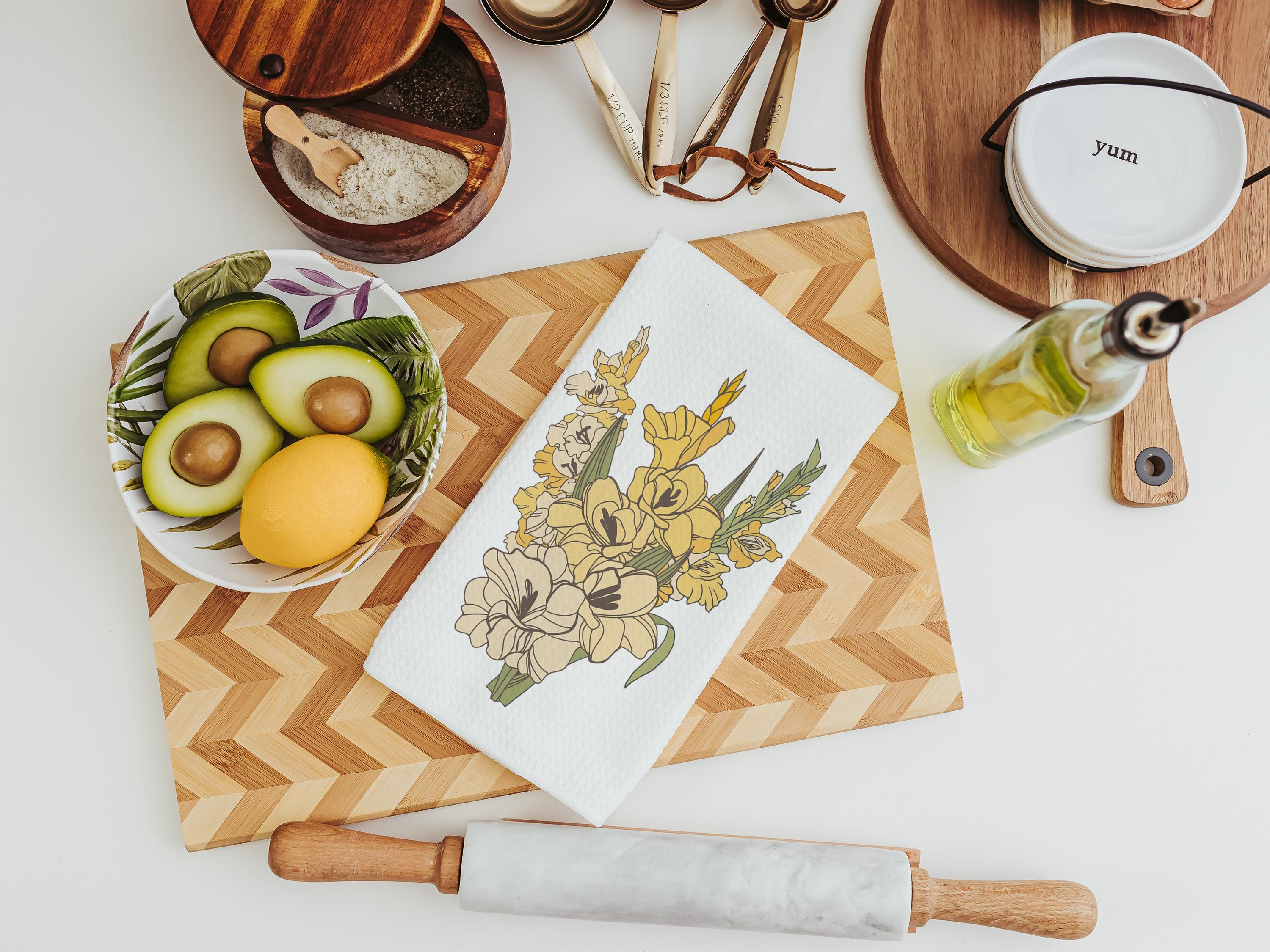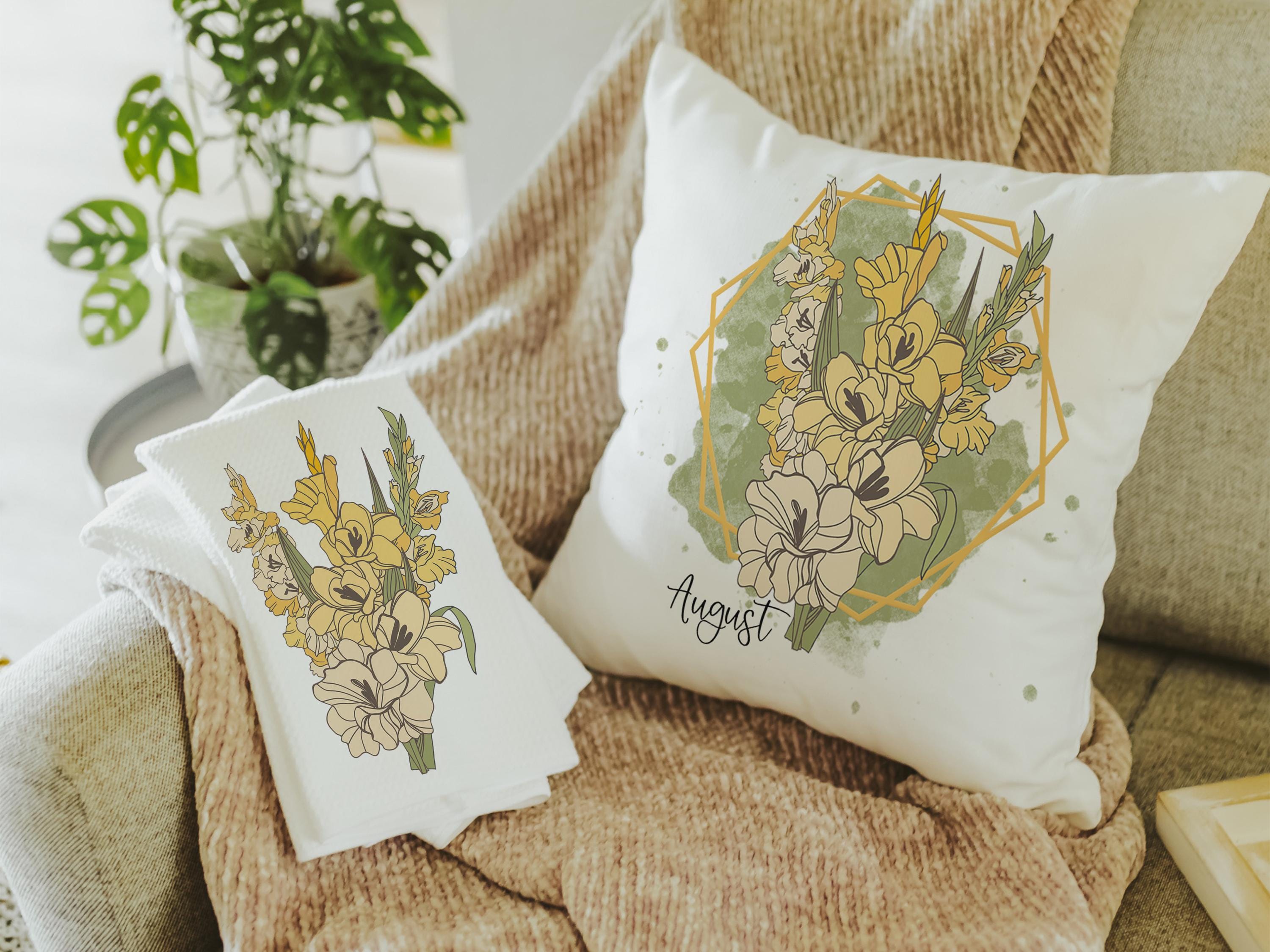 Gladiolus blooms in golden yellow bring warmth to this August birth month pillow and coordinating towel set. A thoughtful gift for friends, Leo women, or anyone who loves cheerful kitchen and bedroom accents. Available as a set or sold separately.