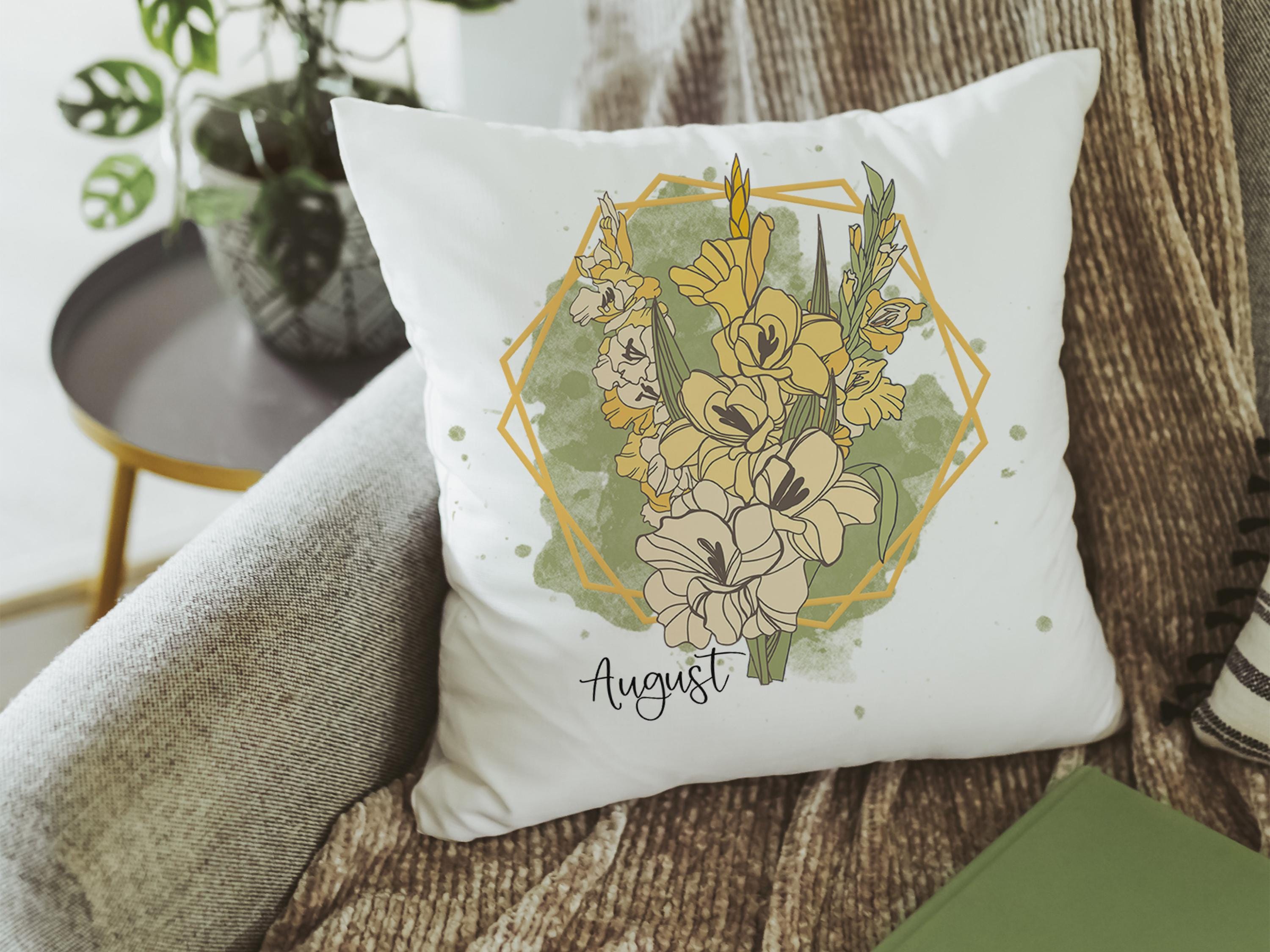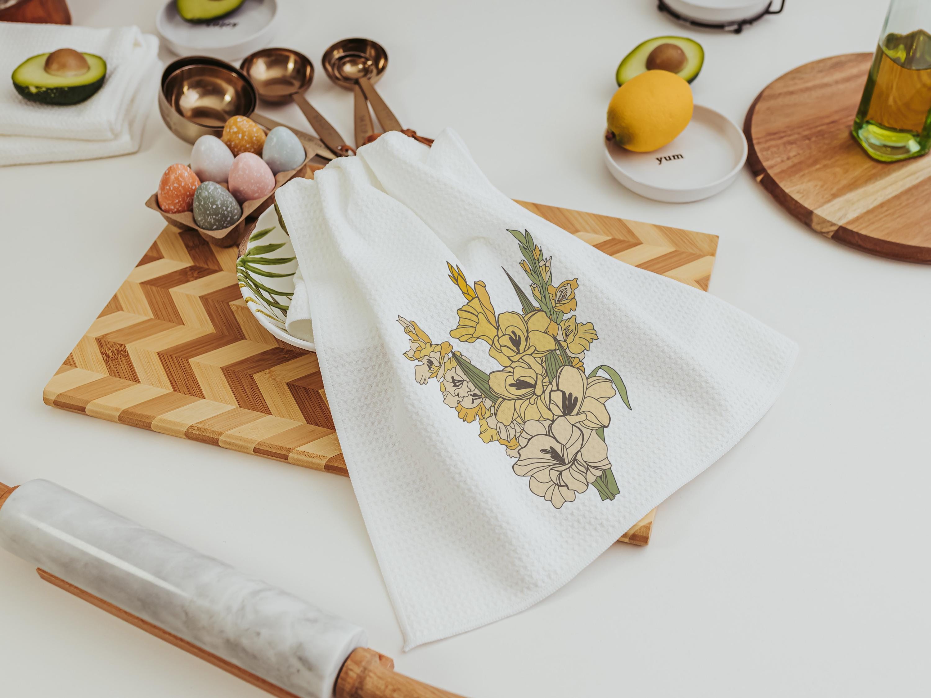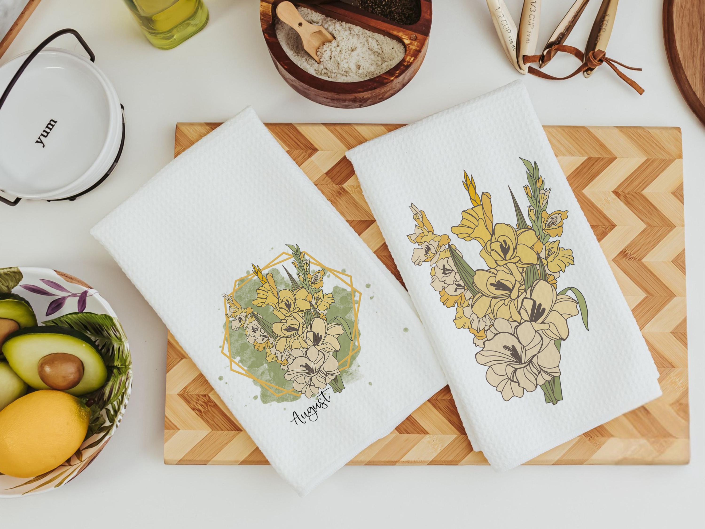 Gladiolus blooms in golden yellow bring warmth to this August birth month pillow and coordinating towel set. A thoughtful gift for friends, Leo women, or anyone who loves cheerful kitchen and bedroom accents. Available as a set or sold separately.