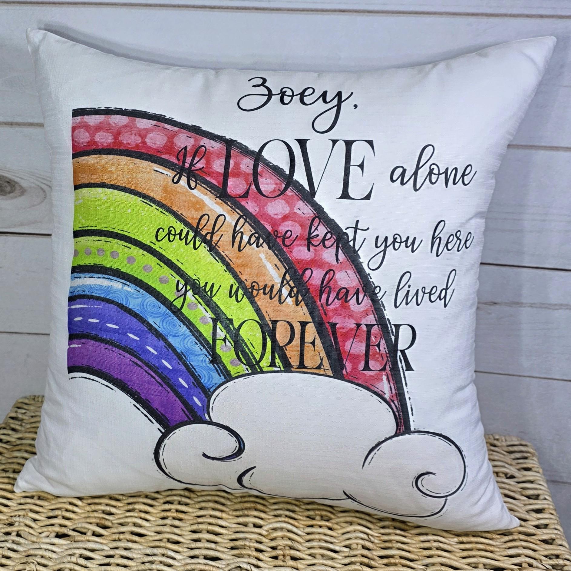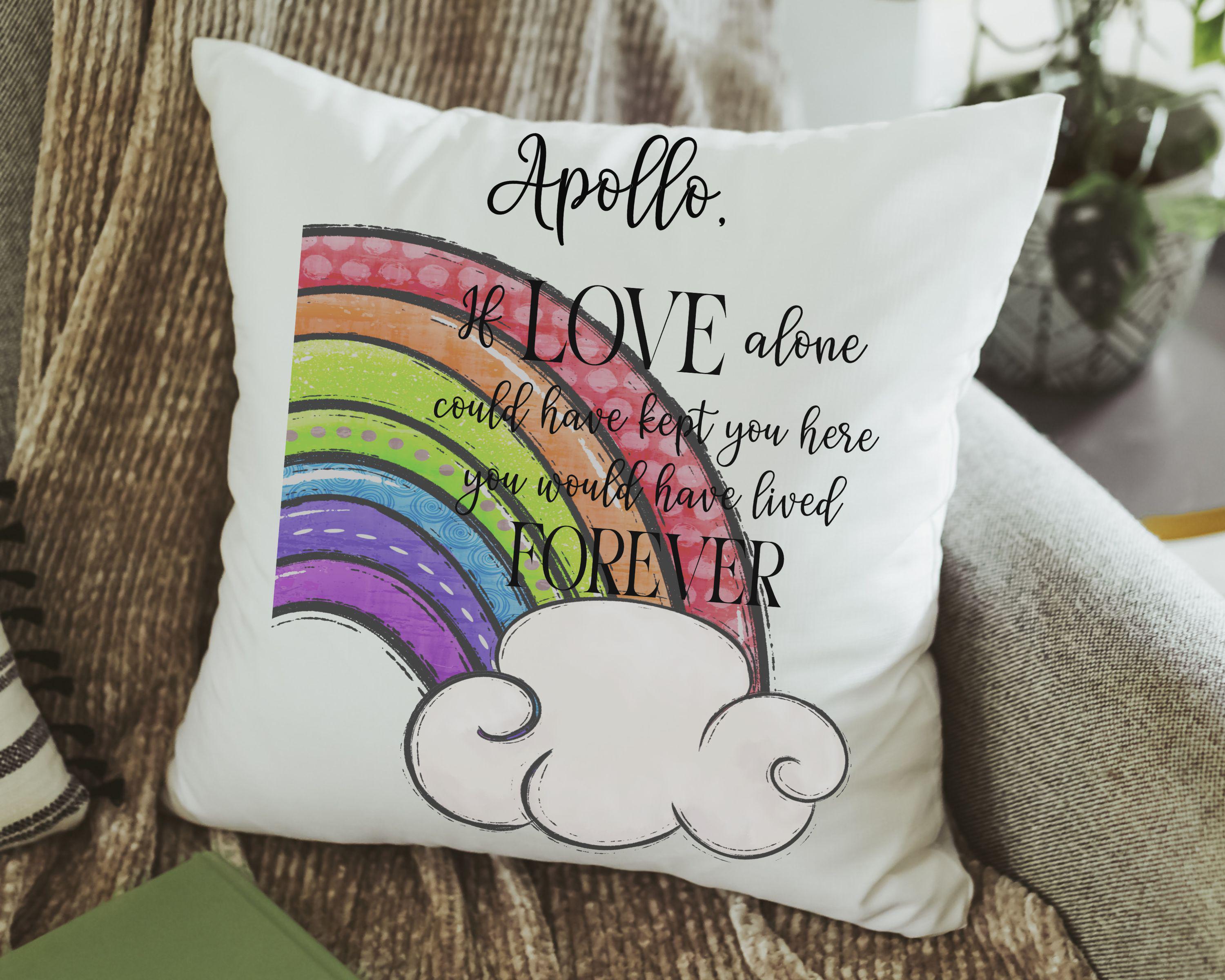 Honor the memory of a beloved pet with this personalized Rainbow Bridge throw pillow, featuring the heartfelt quote, "If love alone could have kept you here, you would have lived forever." A comforting sympathy gift for those grieving a pet’s loss, this remembrance pillow adds a thoughtful touch to any couch or sofa, offering a gentle reminder of the love that never fades.