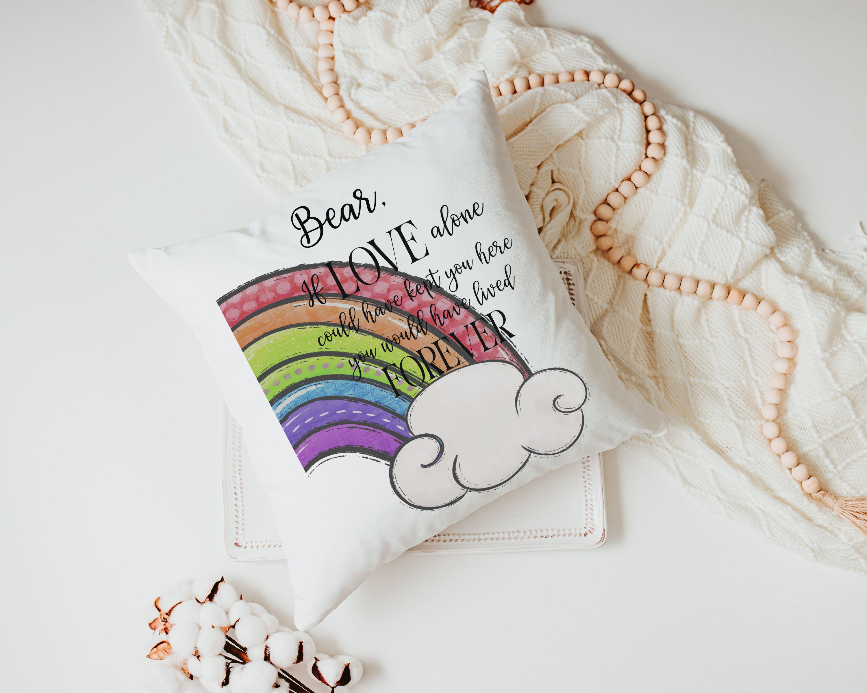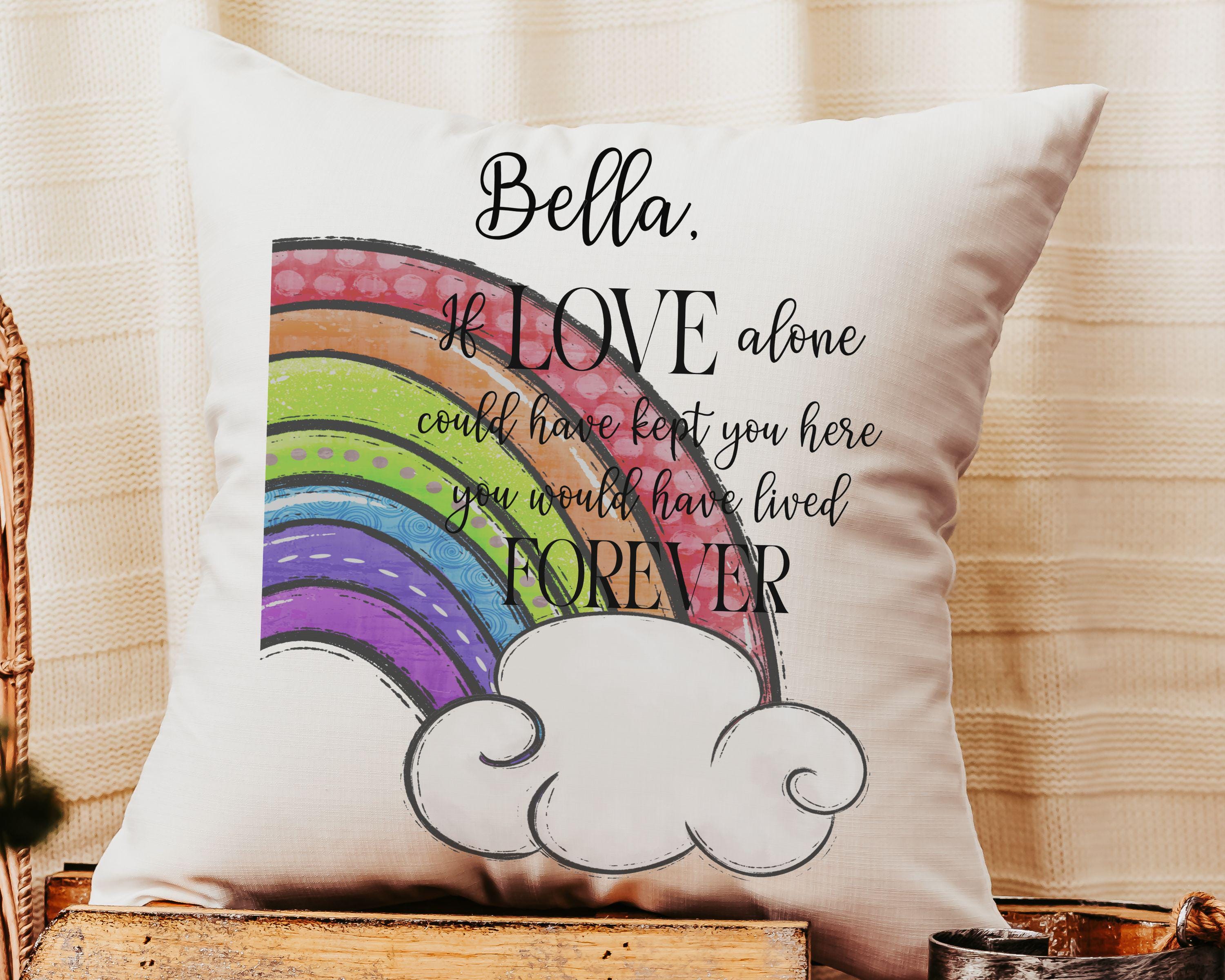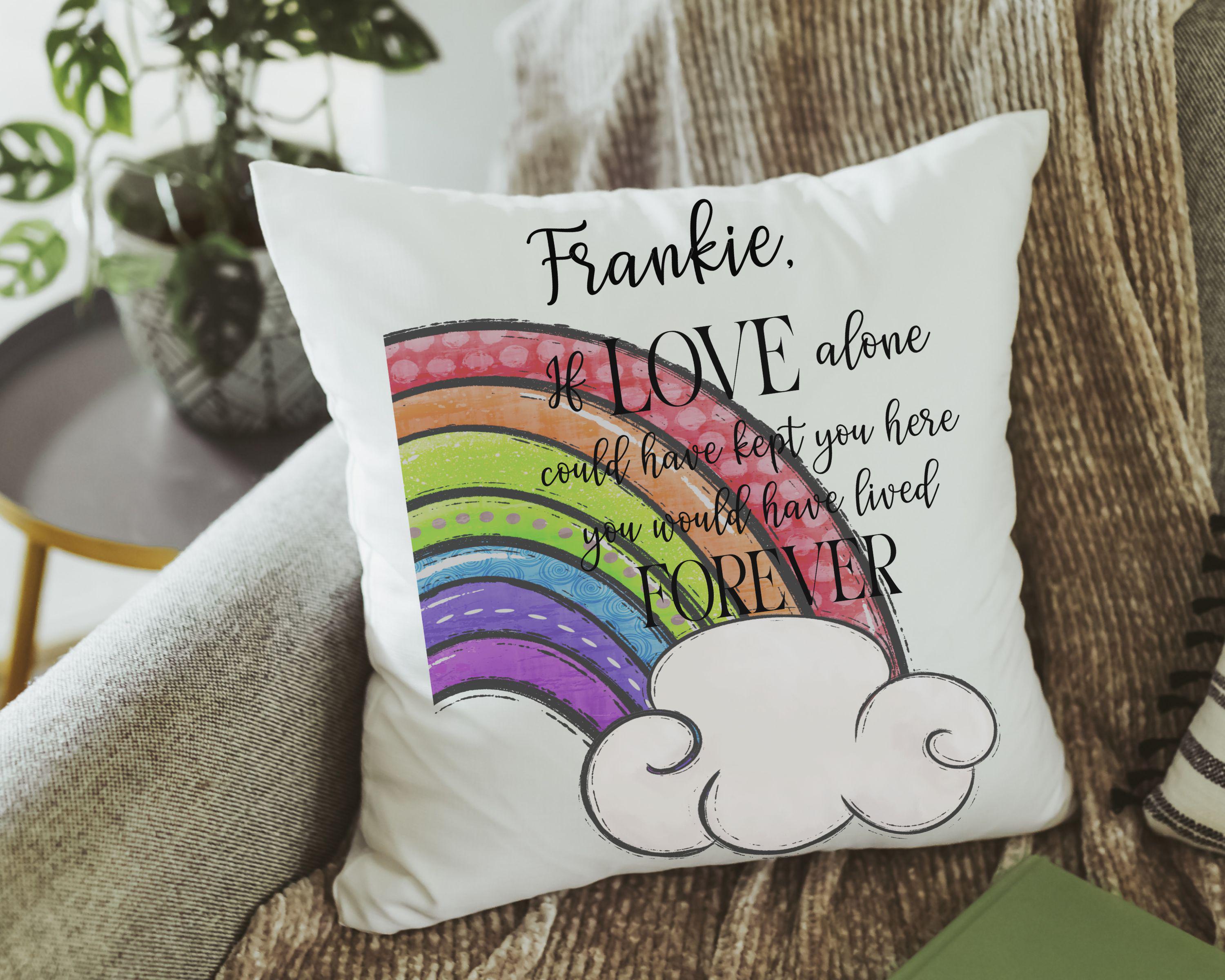 Honor the memory of a loved cat with this personalized rainbow bridge throw pillow, designed to comfort grieving pet parents. Featuring the beautiful message "If love alone could have kept you here, you would have lived forever" it’s a thoughtful gift for anyone who has lost a feline friend. Beautiful as a keepsake for the couch, this pillow adds sweet reminders to any space.