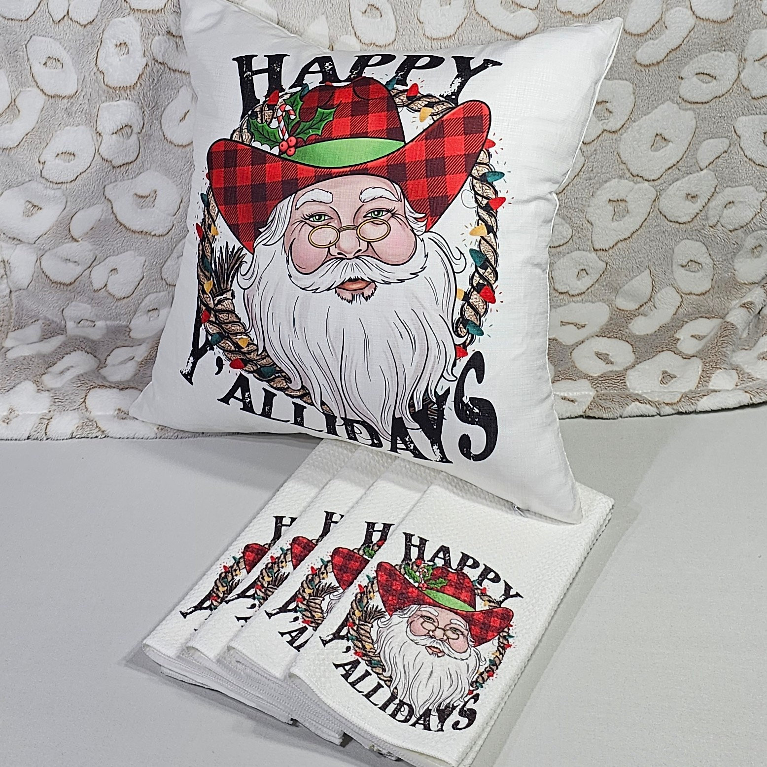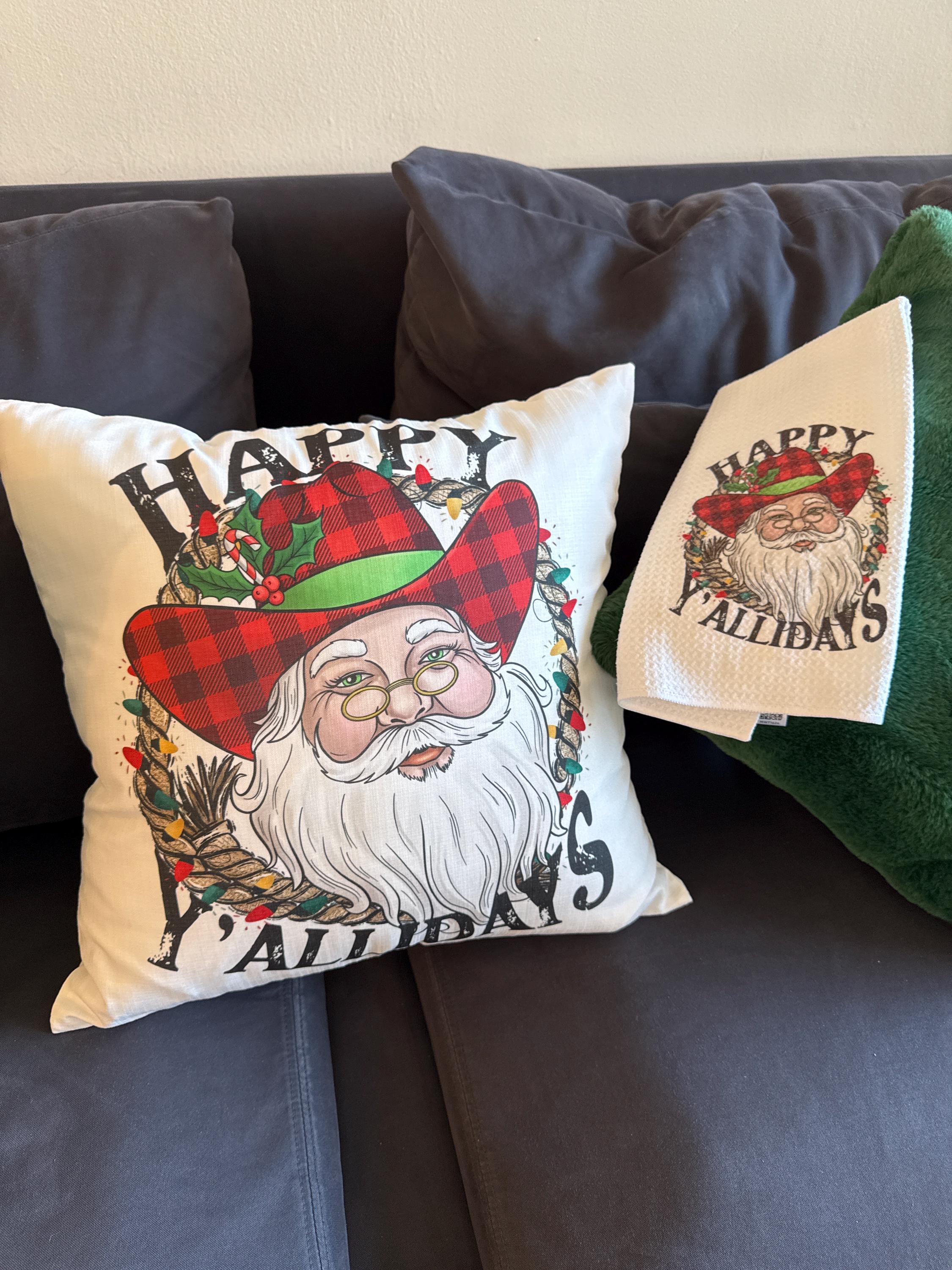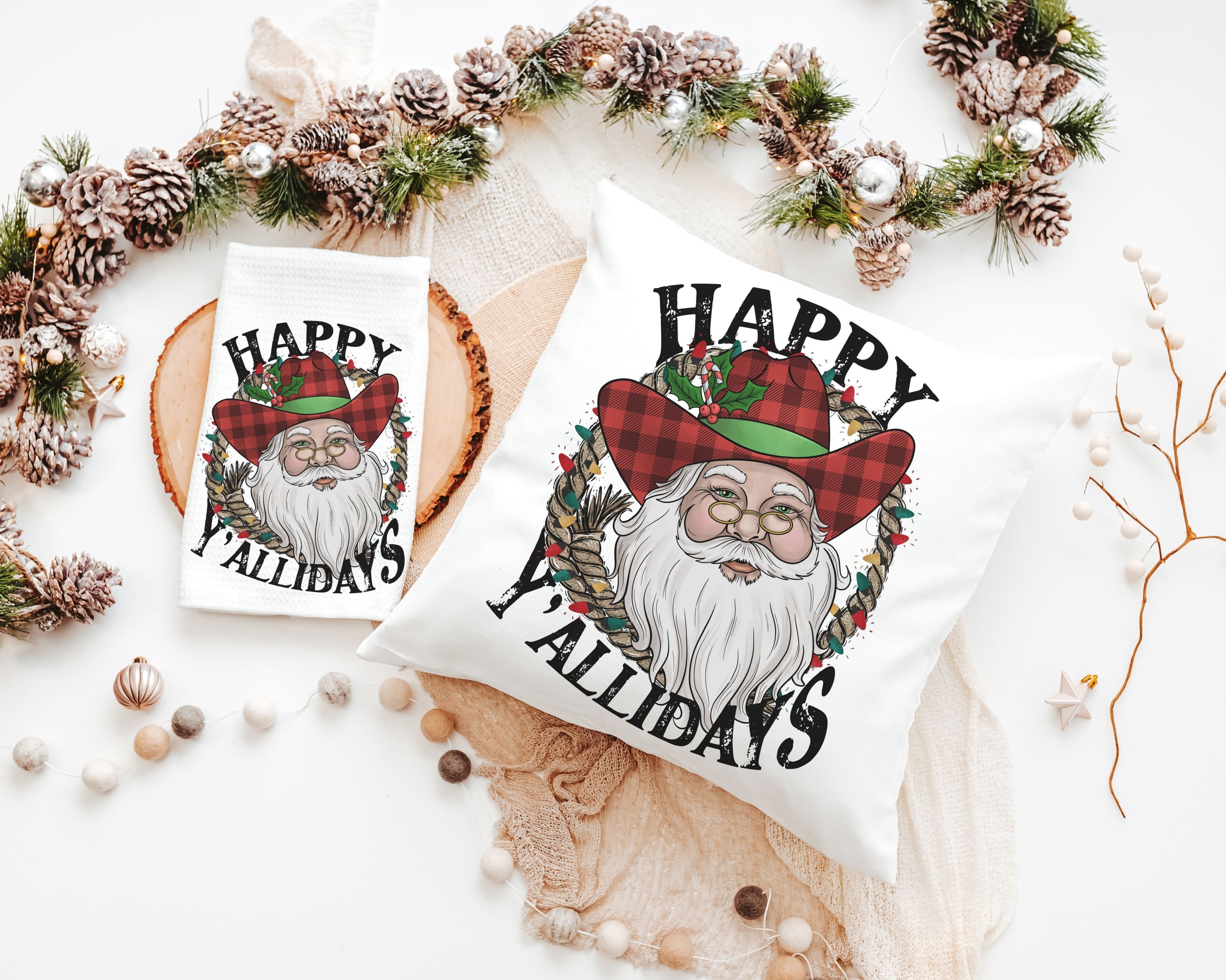 Celebrate the season with a touch of western cuteness with these “Happy Y’allidays” cowboy Santa throw pillows for your sofa or bed. This fun and festive rodeo-themed Christmas pillow brings a unique touch to holiday decor, making it the perfect gift for country girls or a funny white elephant present. Complete the set with matching towels, available individually or as a set for a coordinated look.