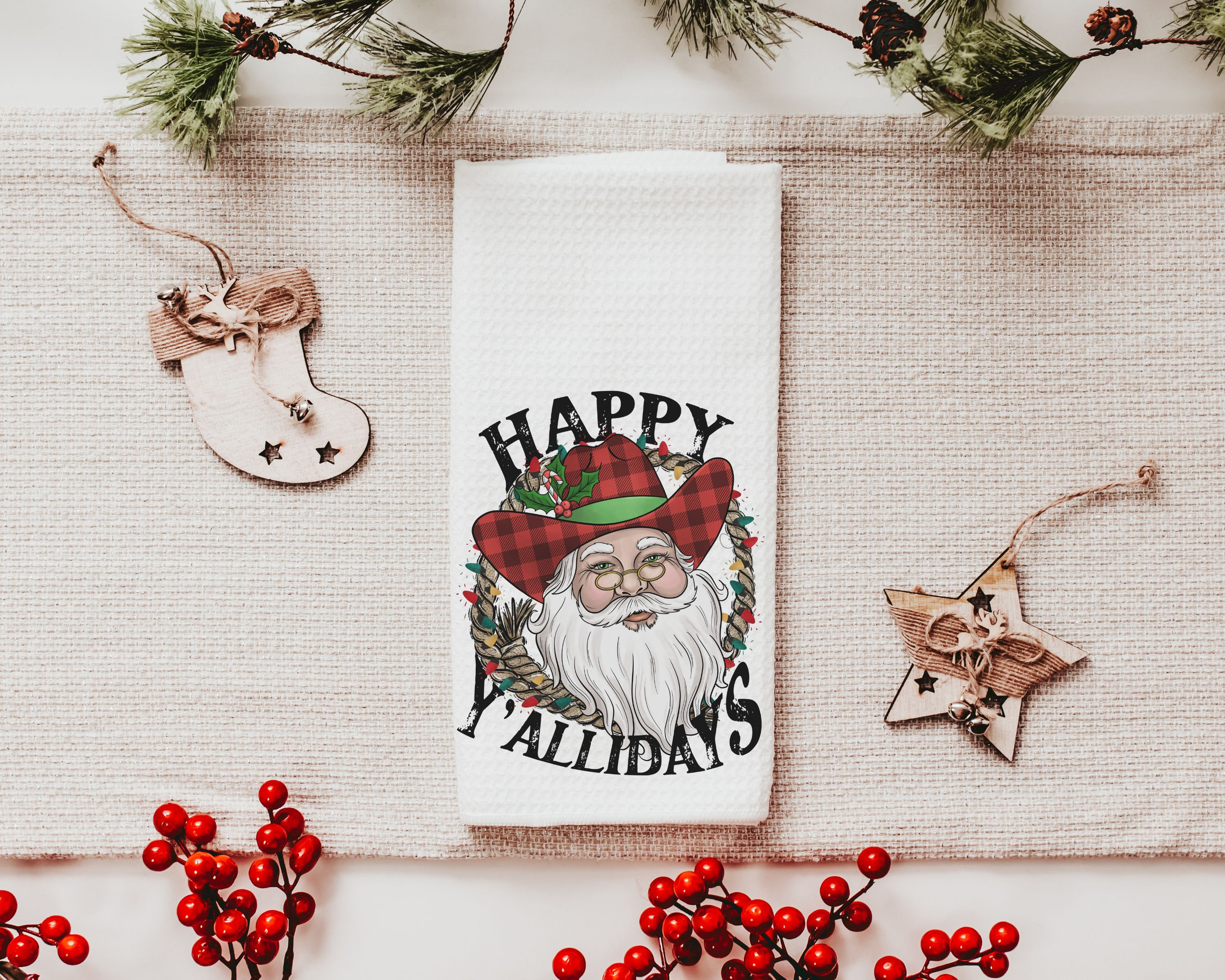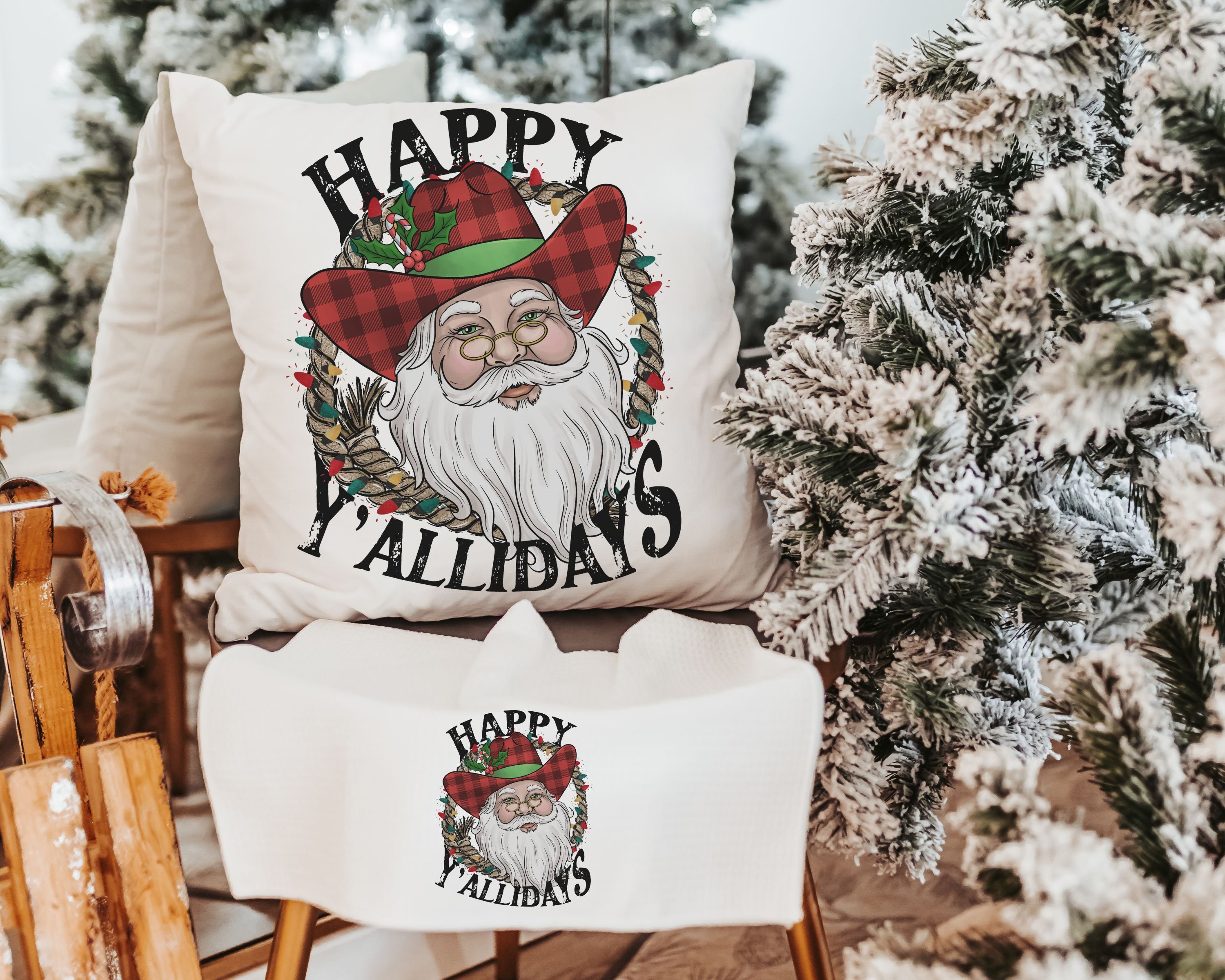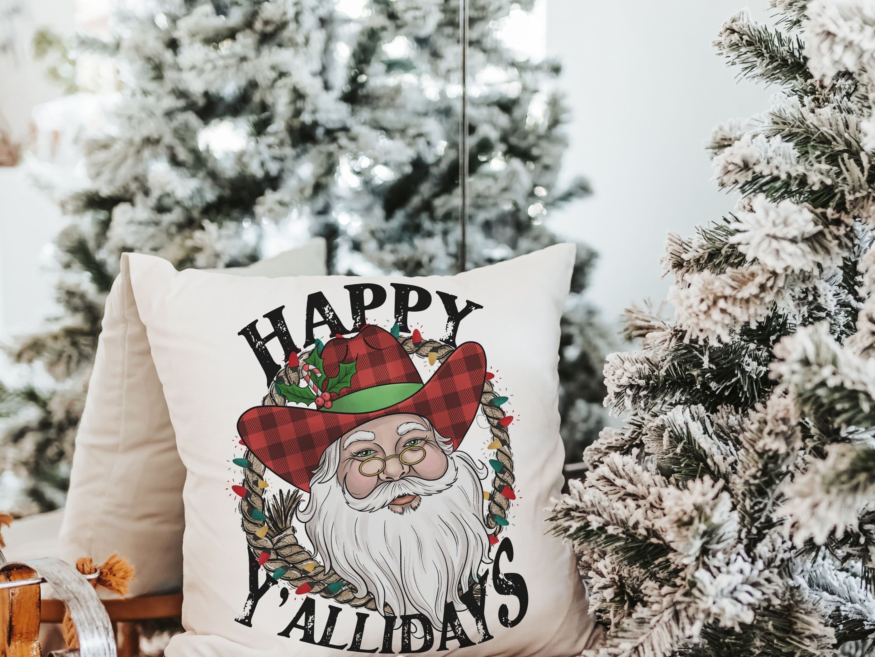 Celebrate the season with a touch of western cuteness with these “Happy Y’allidays” cowboy Santa throw pillows for your sofa or bed. This fun and festive rodeo-themed Christmas pillow brings a unique touch to holiday decor, making it the perfect gift for country girls or a funny white elephant present. Complete the set with matching towels, available individually or as a set for a coordinated look.