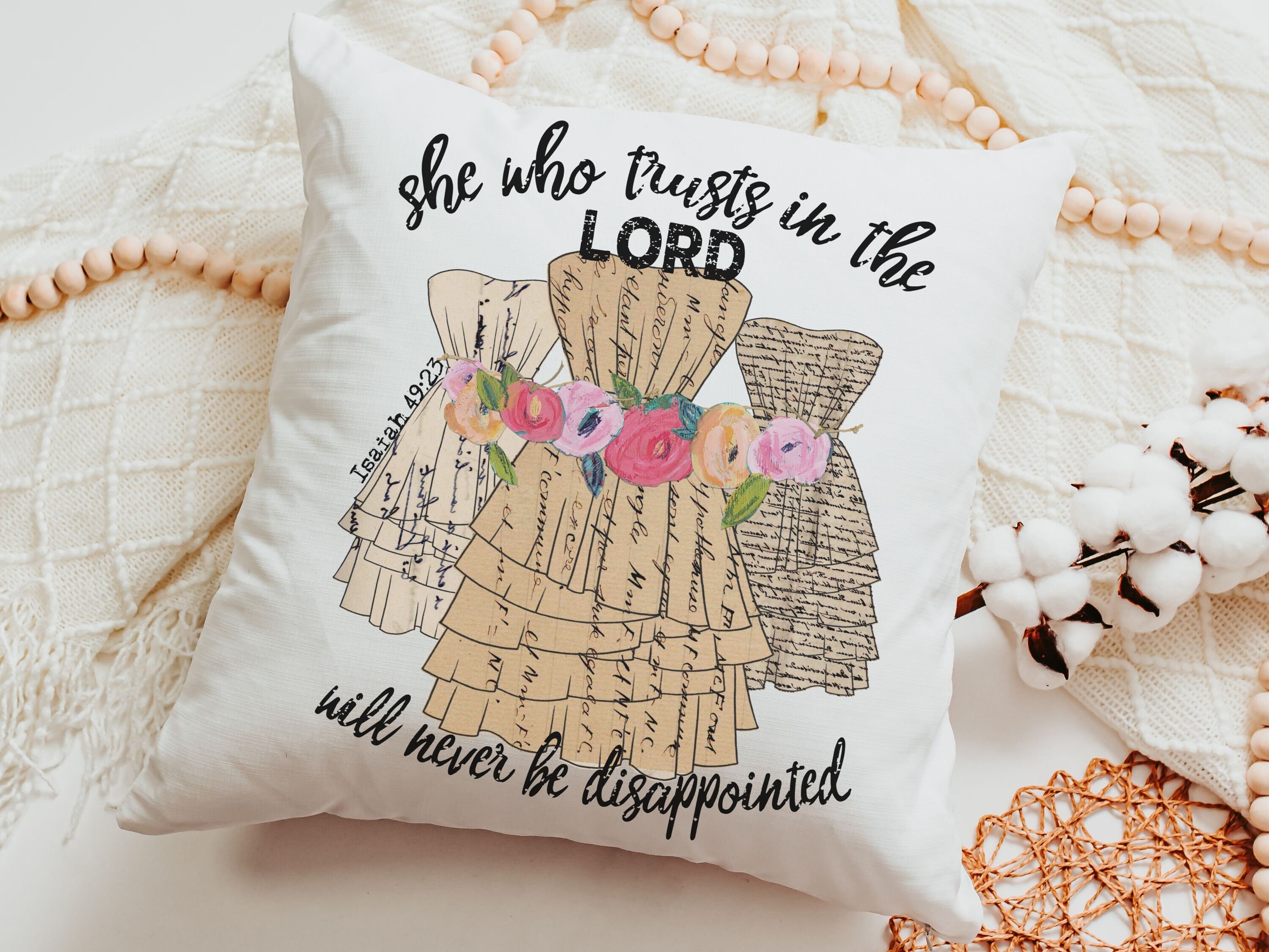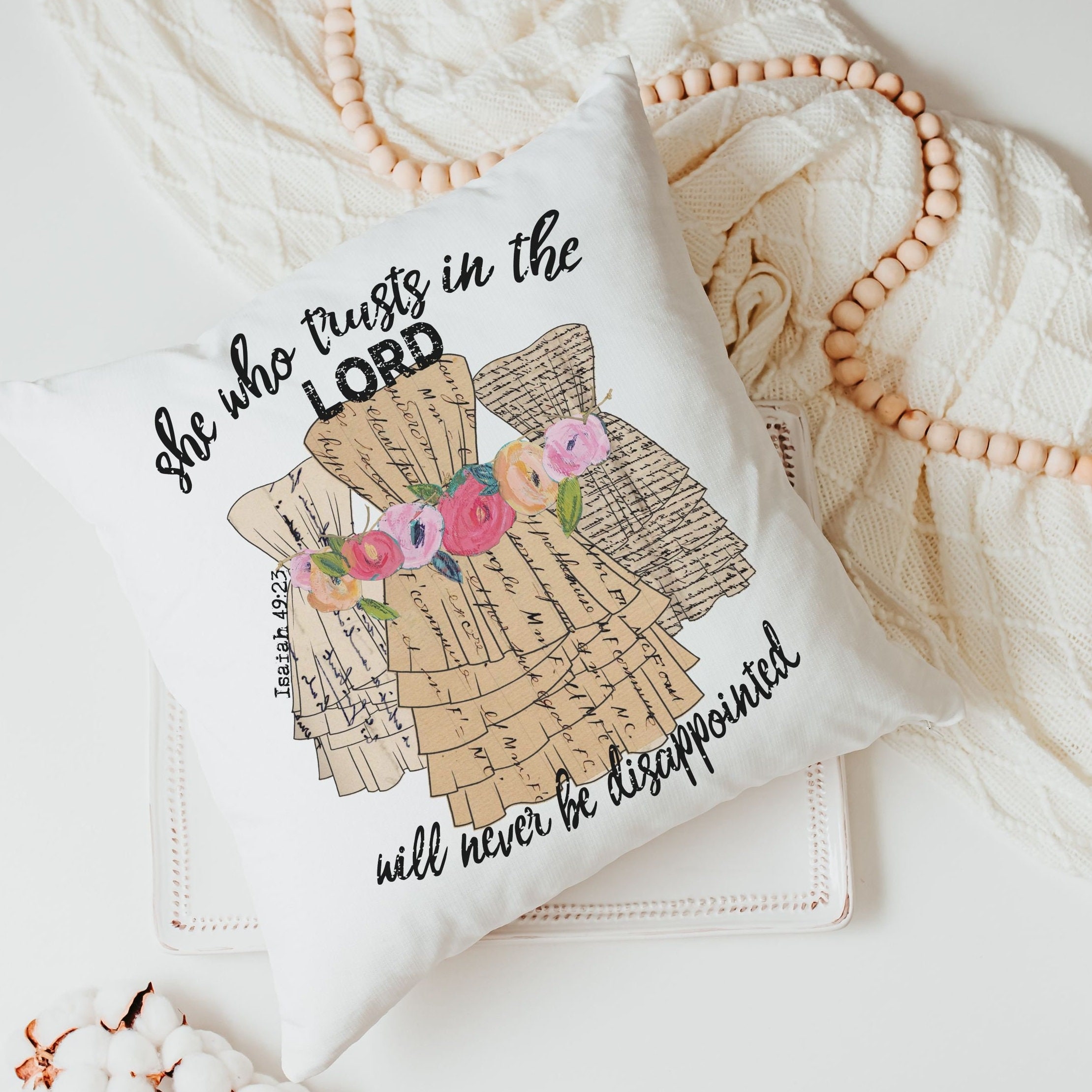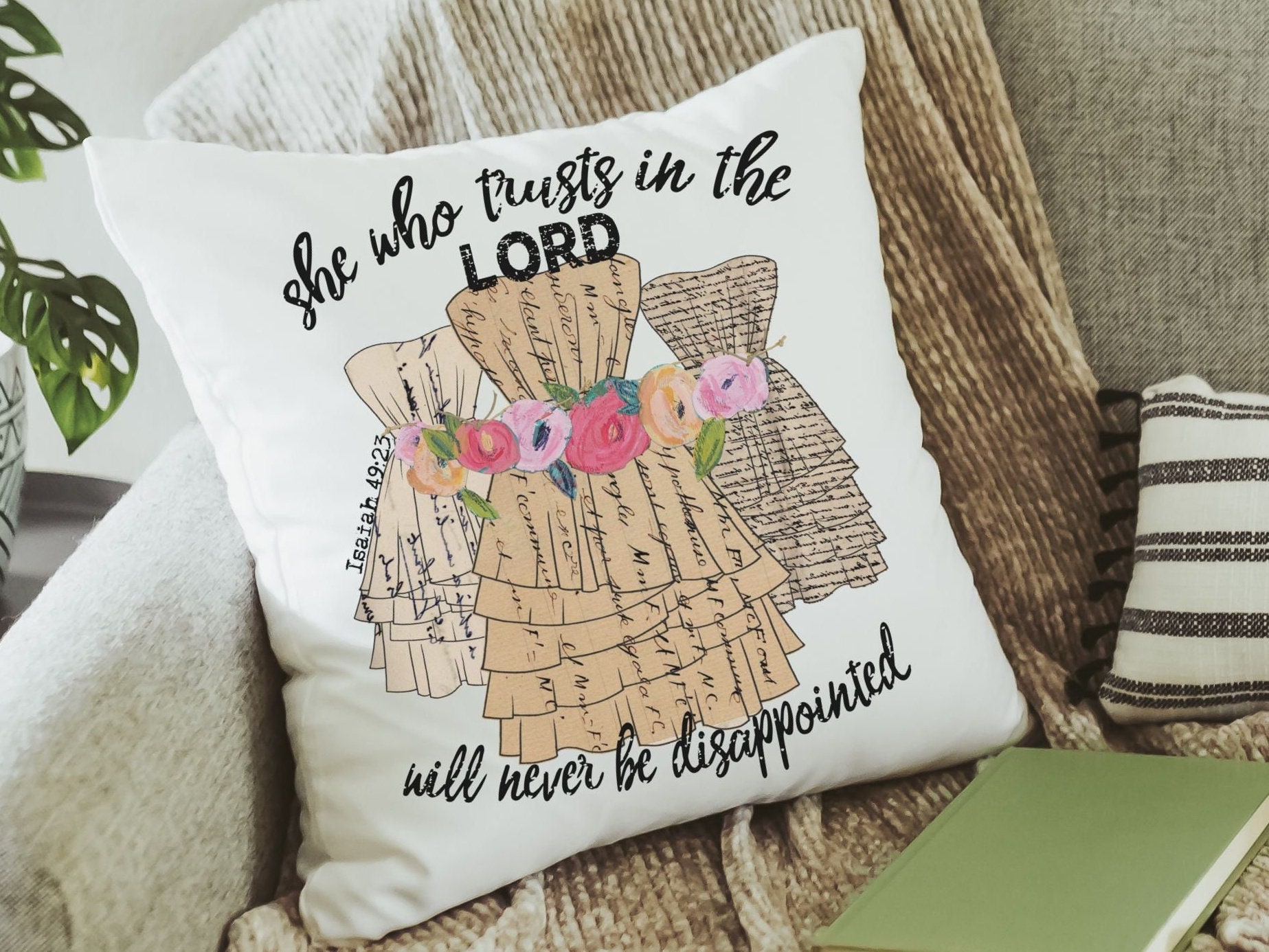Add faith and beauty to your space with an Isaiah 49 she who trusts in the Lord will never be disappointed floral pillow, a meaningful reminder of God’s promise. Perfect for a dorm, bedroom, or reading nook, it makes a thoughtful Christian gift for women, teachers, or anyone who loves scripture-inspired decor.