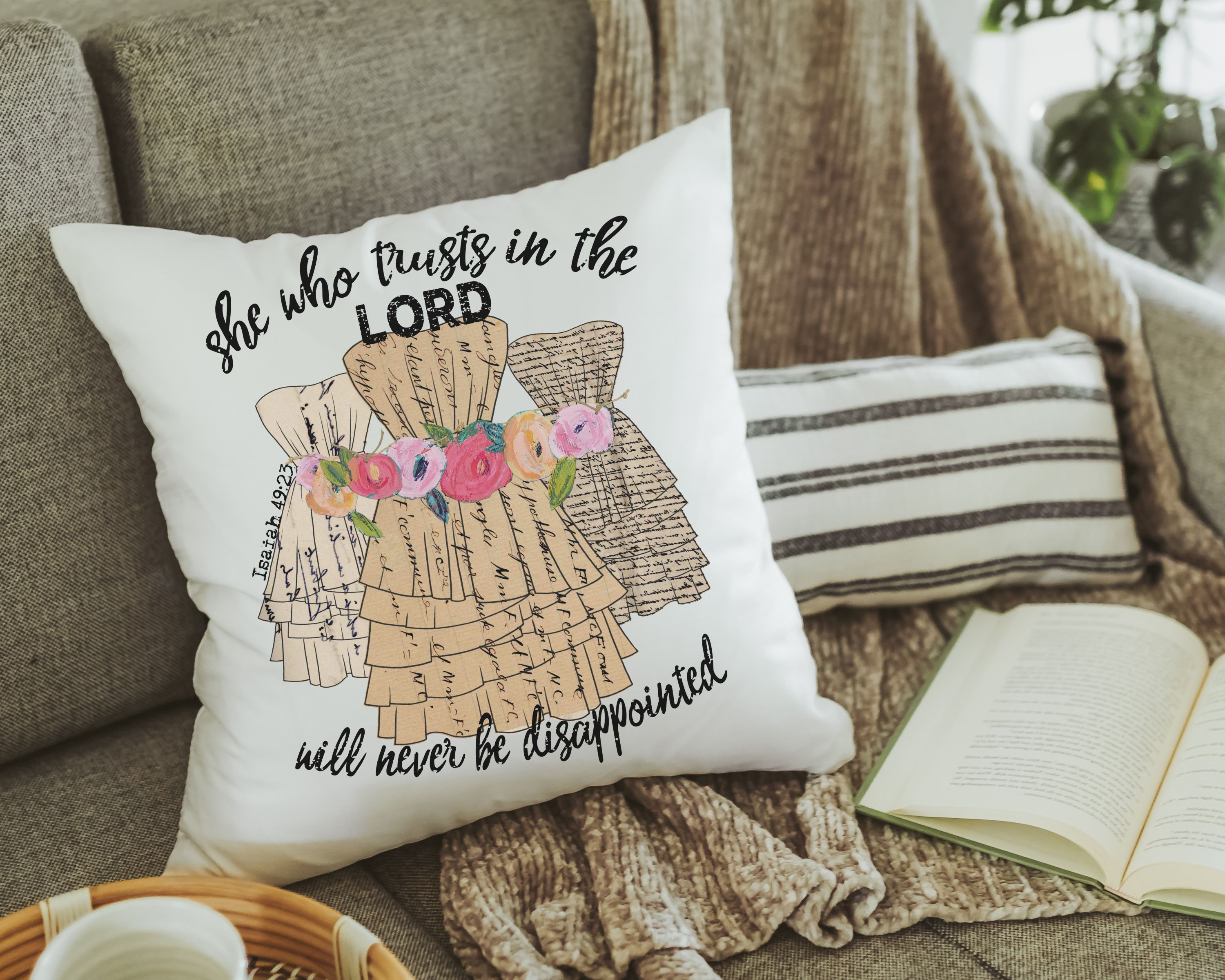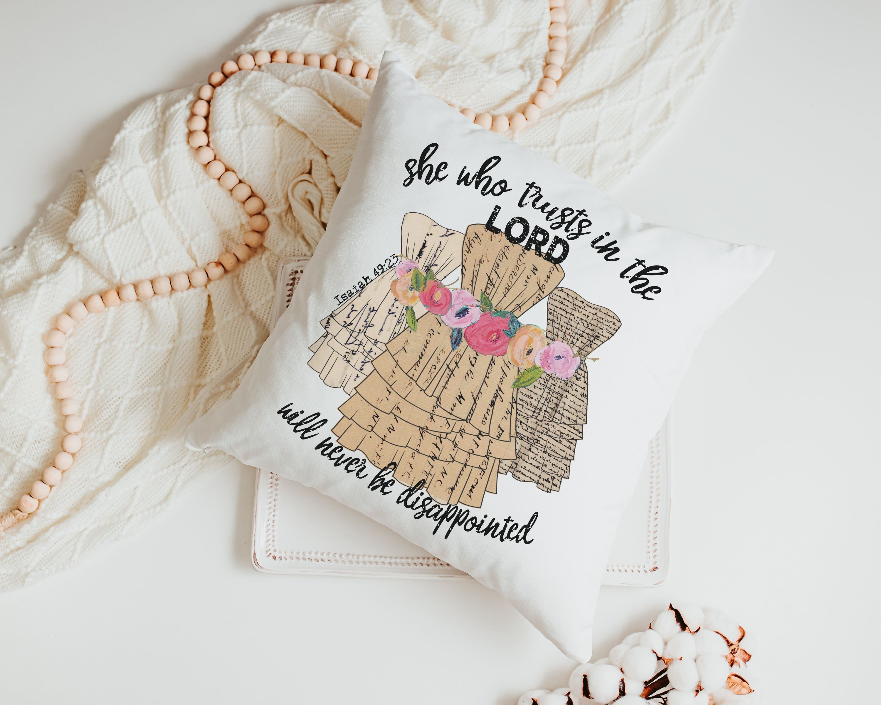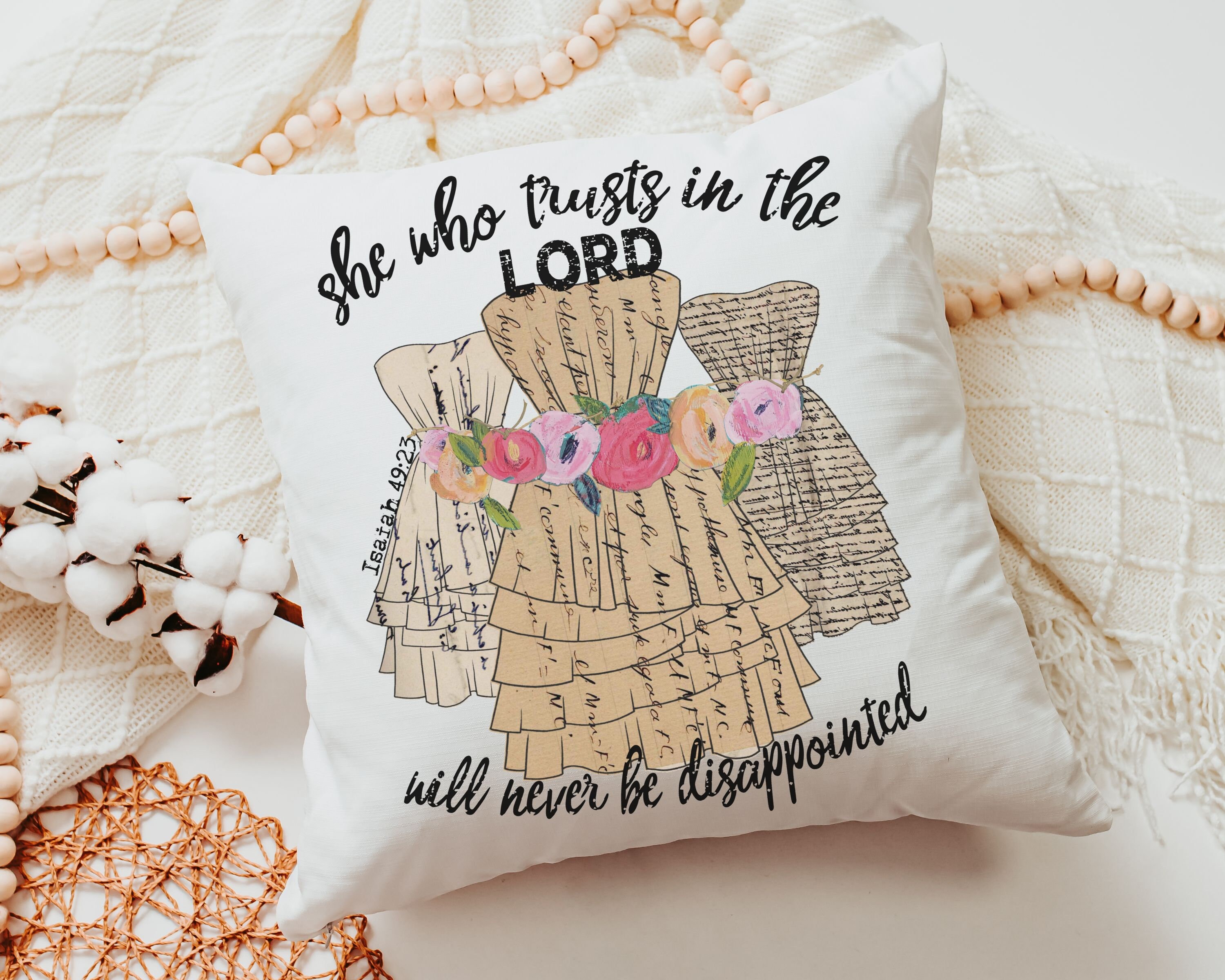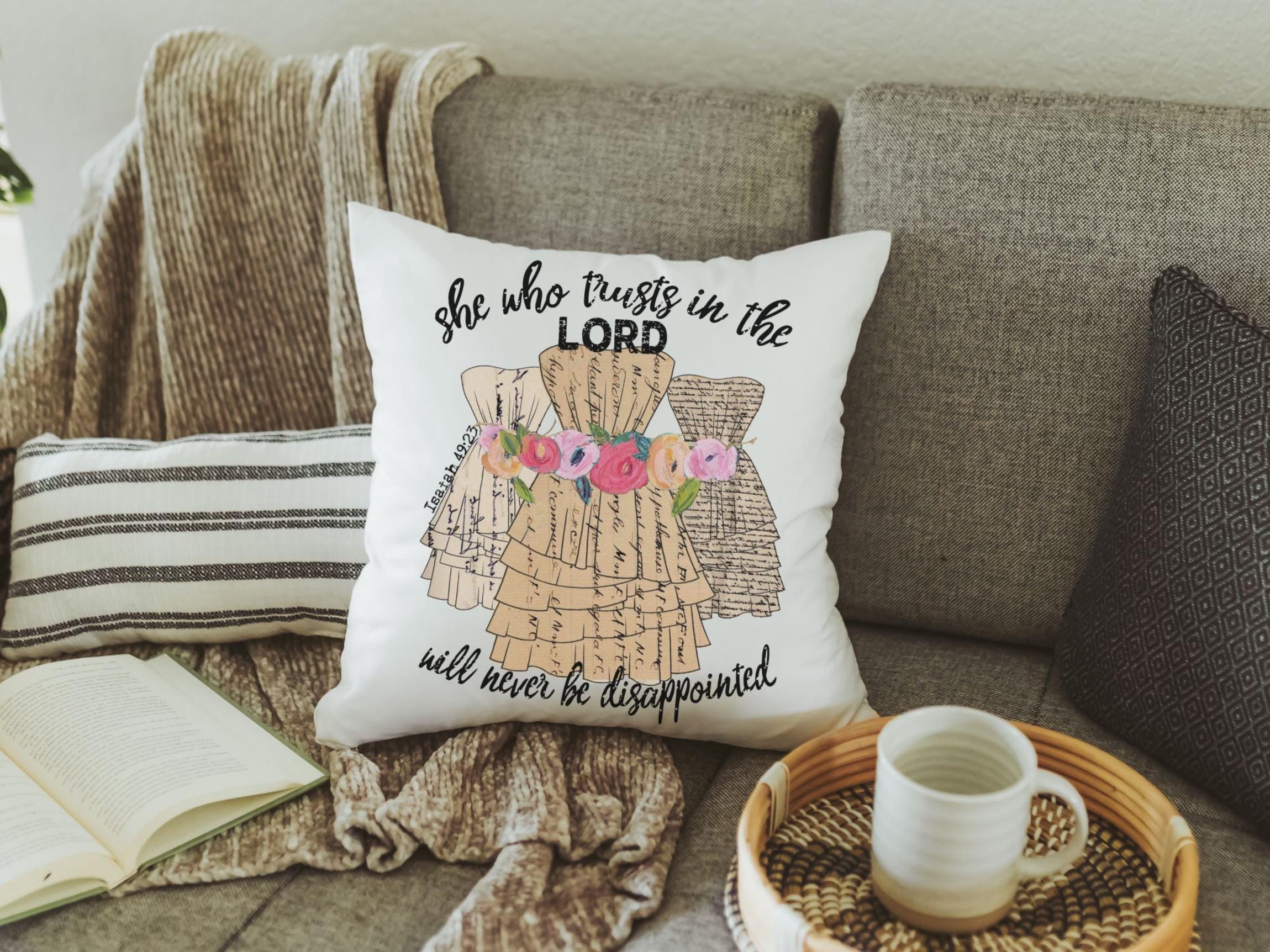 Add faith and beauty to your space with an Isaiah 49 she who trusts in the Lord will never be disappointed floral pillow, a meaningful reminder of God’s promise. Perfect for a dorm, bedroom, or reading nook, it makes a thoughtful Christian gift for women, teachers, or anyone who loves scripture-inspired decor.