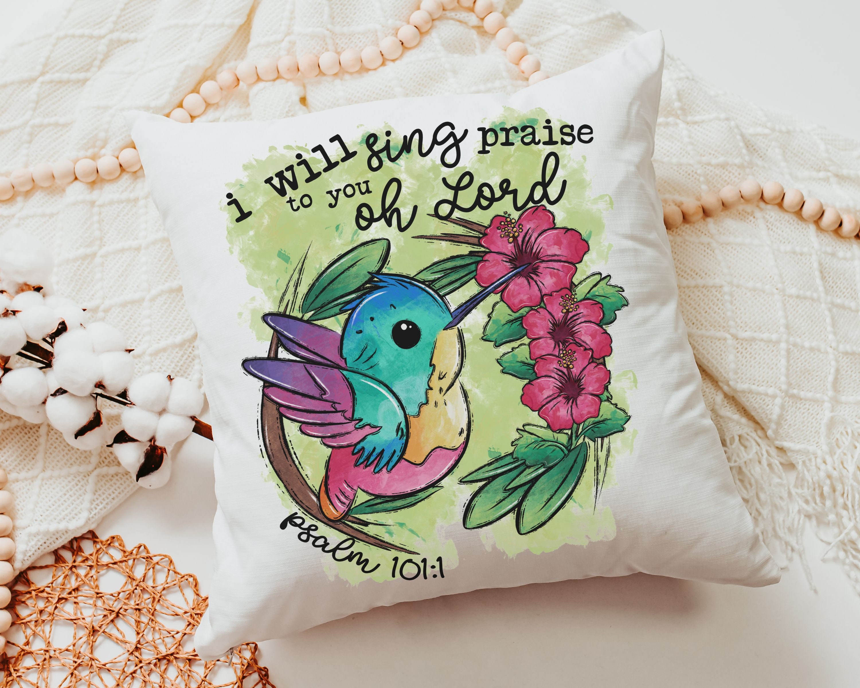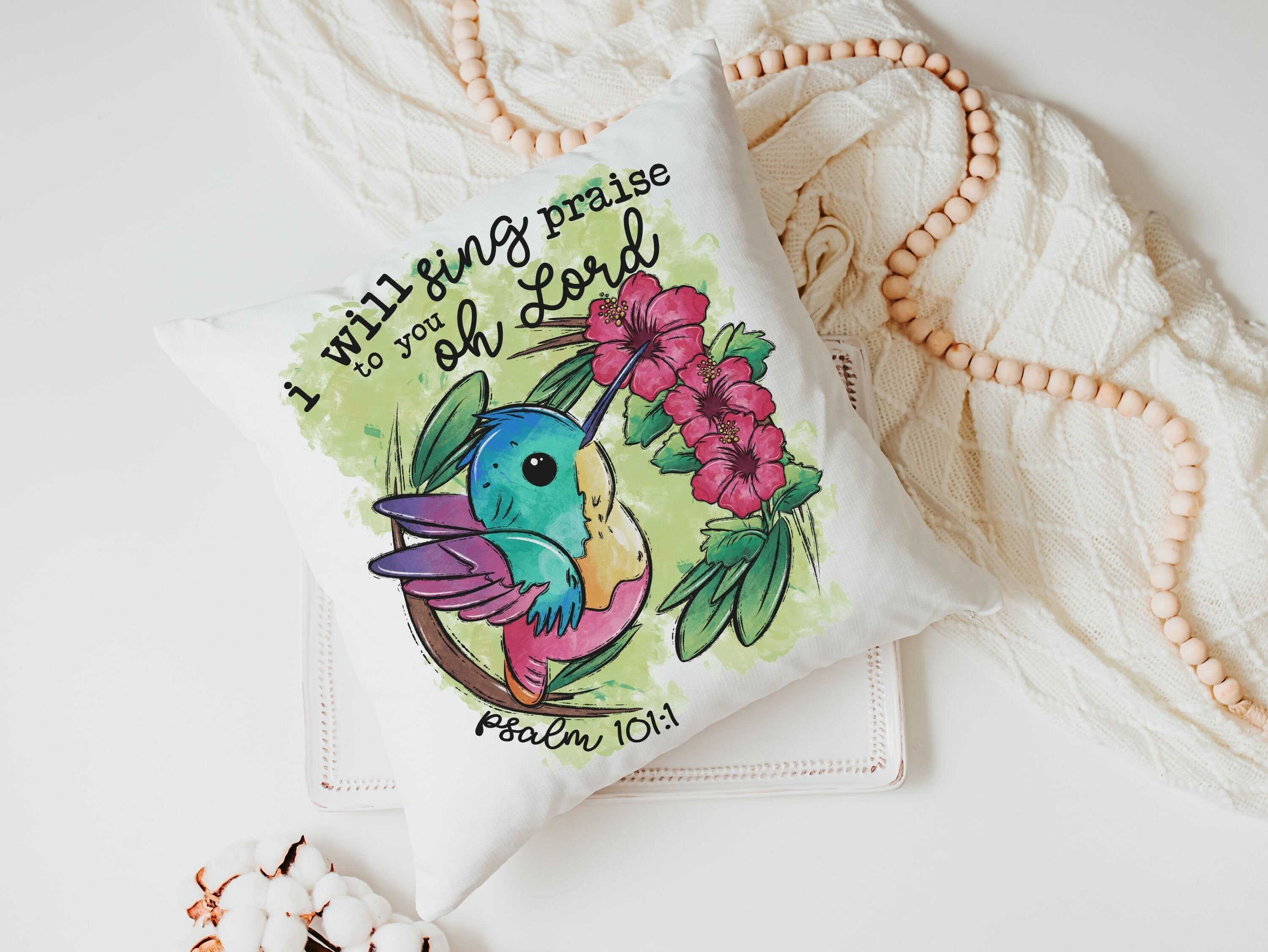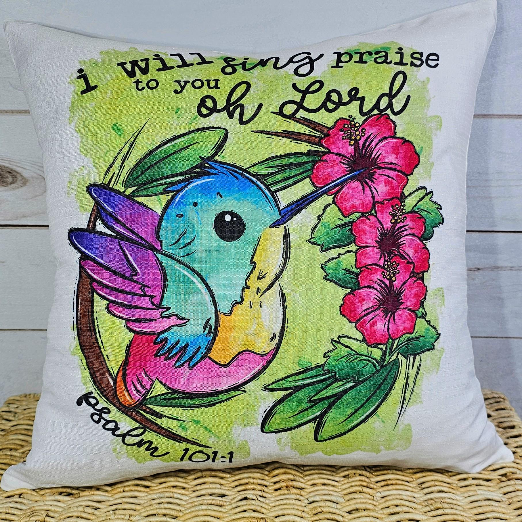 Psalm 101 I will sing praise to you oh Lord hummingbird throw pillow for nursery, Christian gifts for women faith gifts for her, tropical