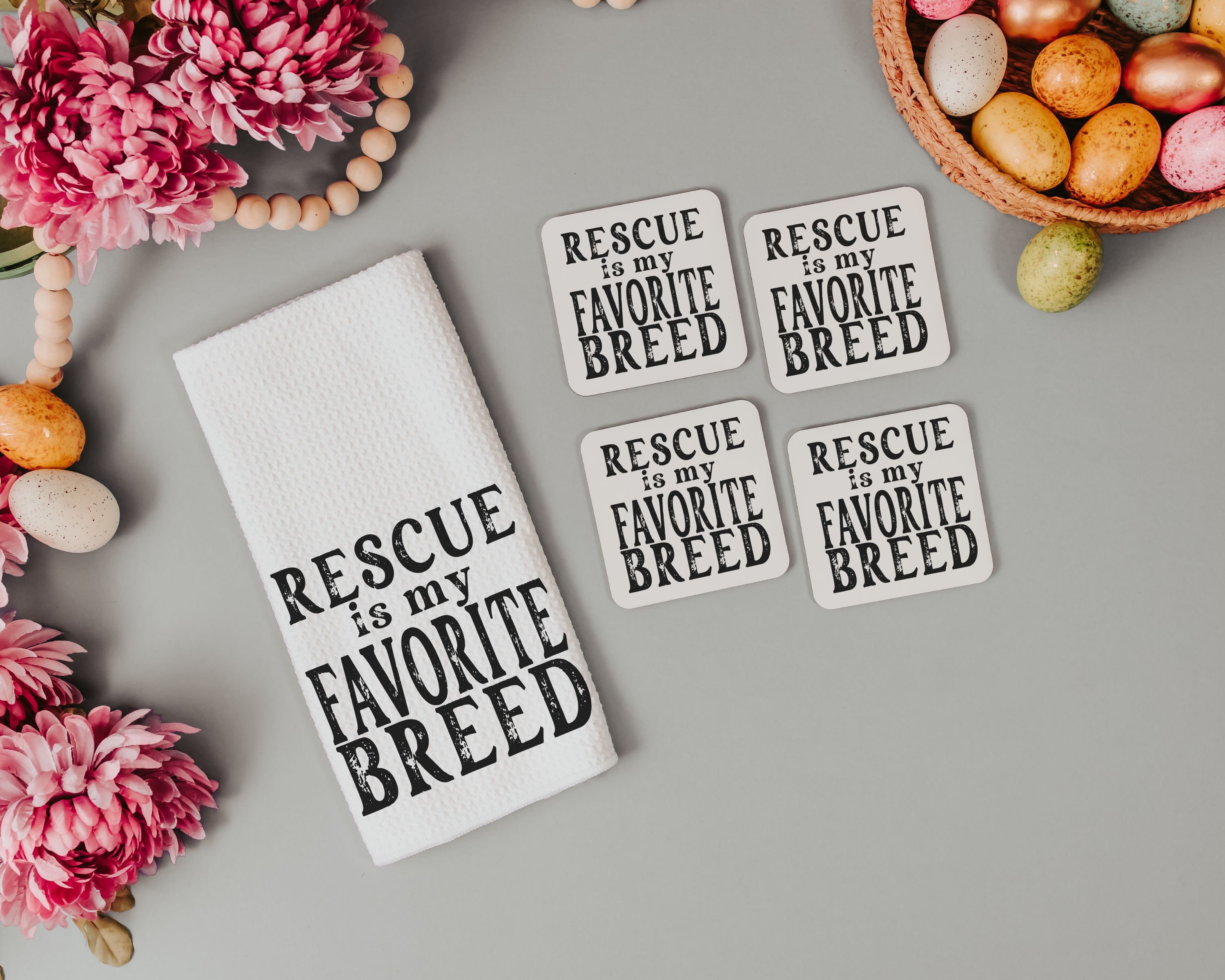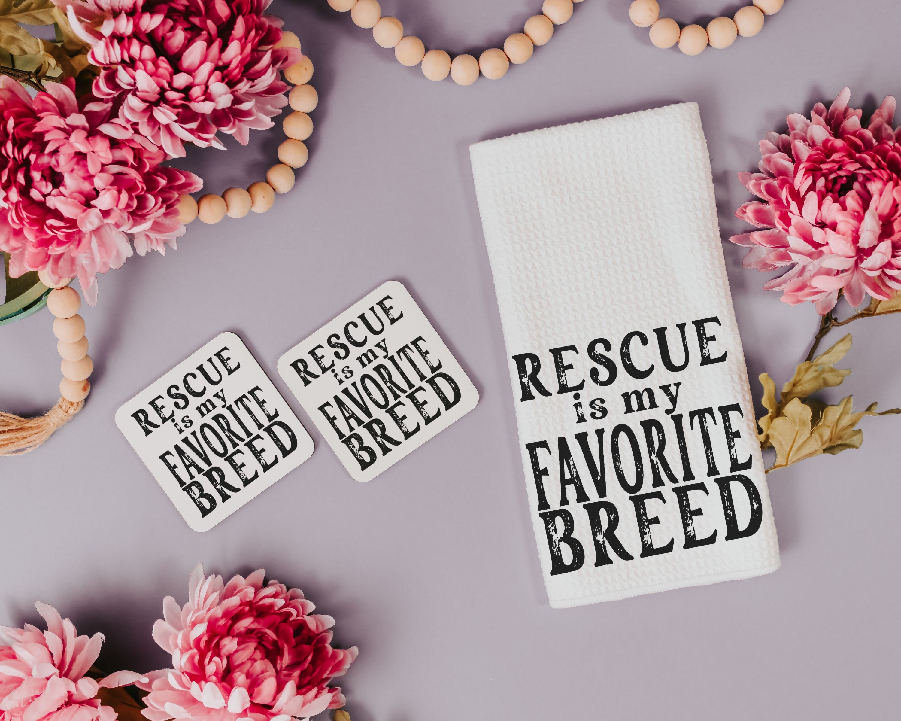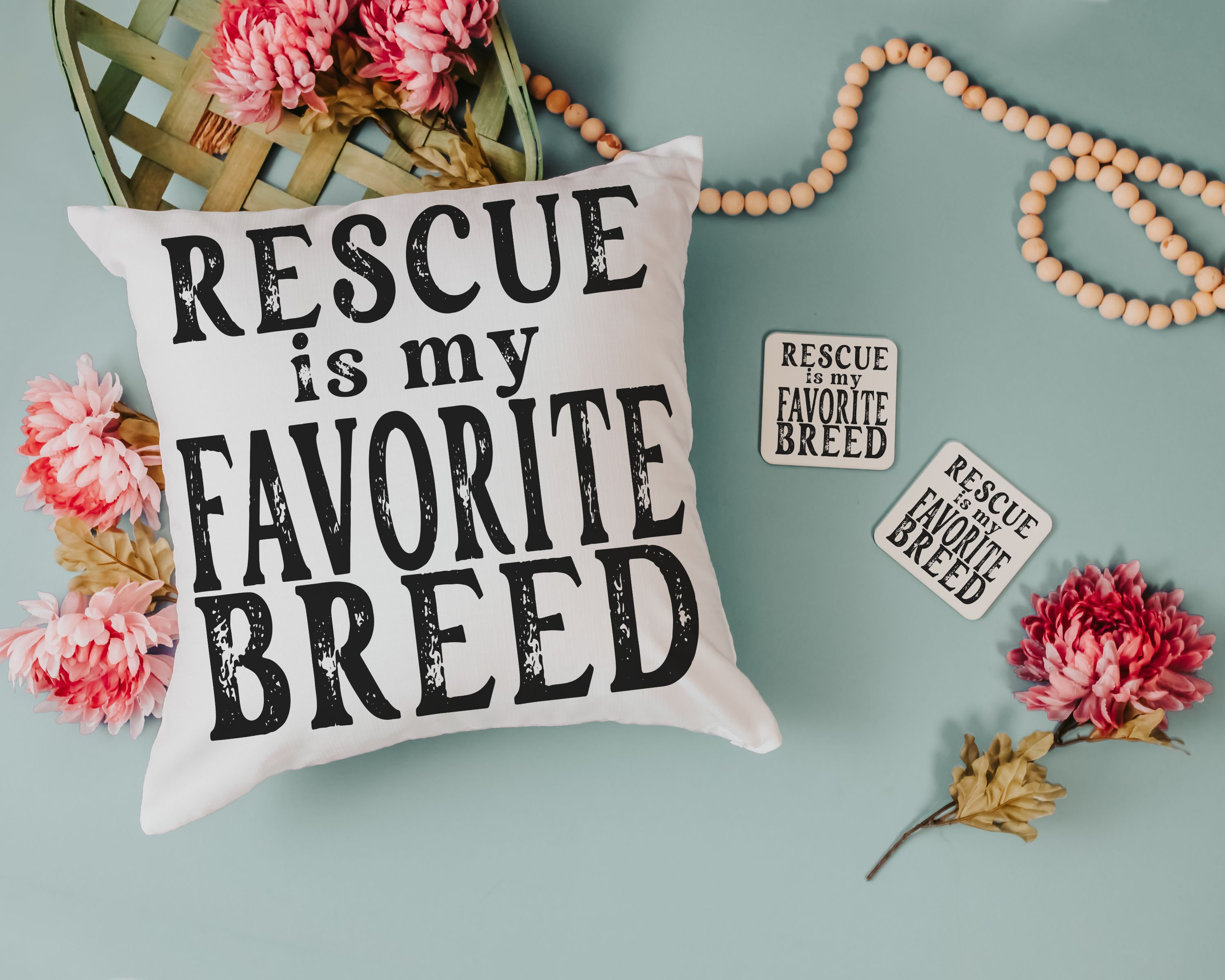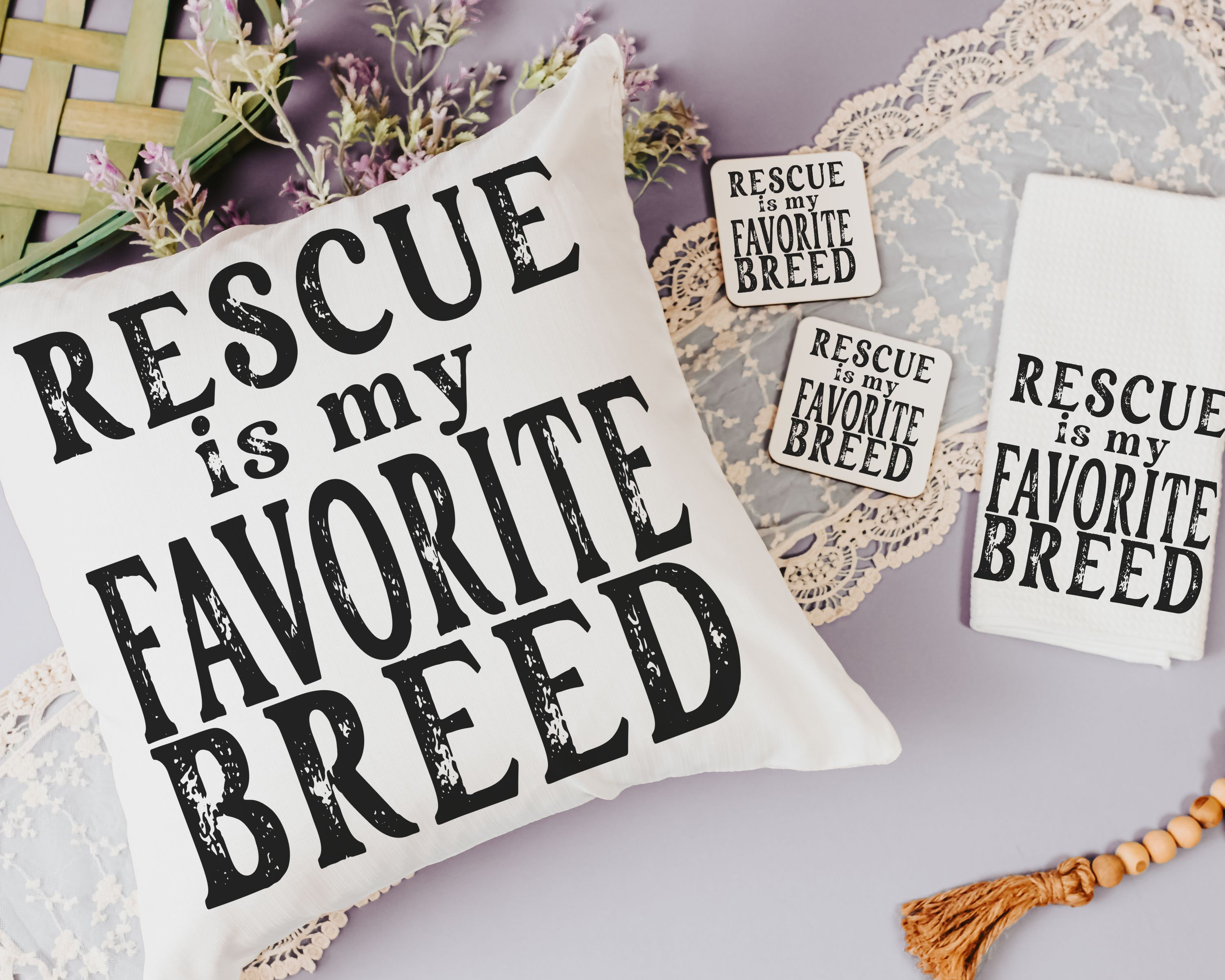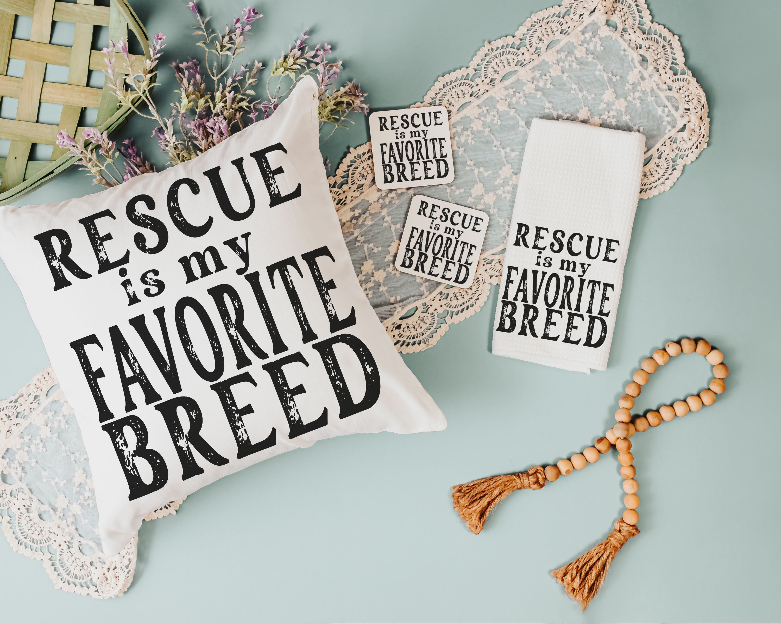 Spoil yourself or a fellow dog mom with our "Rescue is My Favorite Breed" throw pillows, coasters and towels. Add some rescue dog decor to your home with our beautiful pieces that celebrate the love for your furry friend. Our cute dog throw pillow is a must-have for your sofa or bed, showcasing your love for dogs in style. It's the ultimate dog lover gift, combining practicality and cuteness. Show your appreciation for rescue dogs and treat yourself or a loved one to this beautiful set.