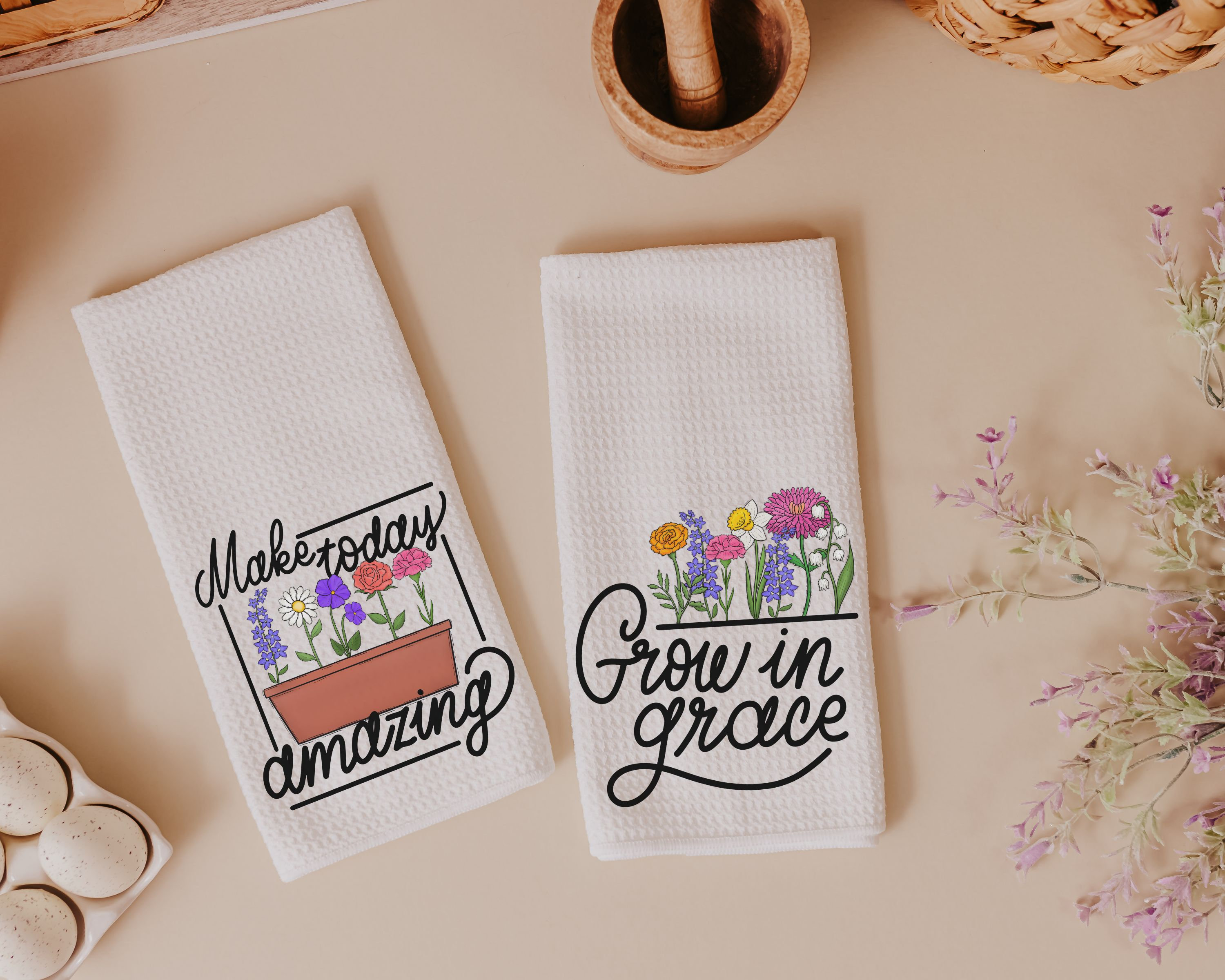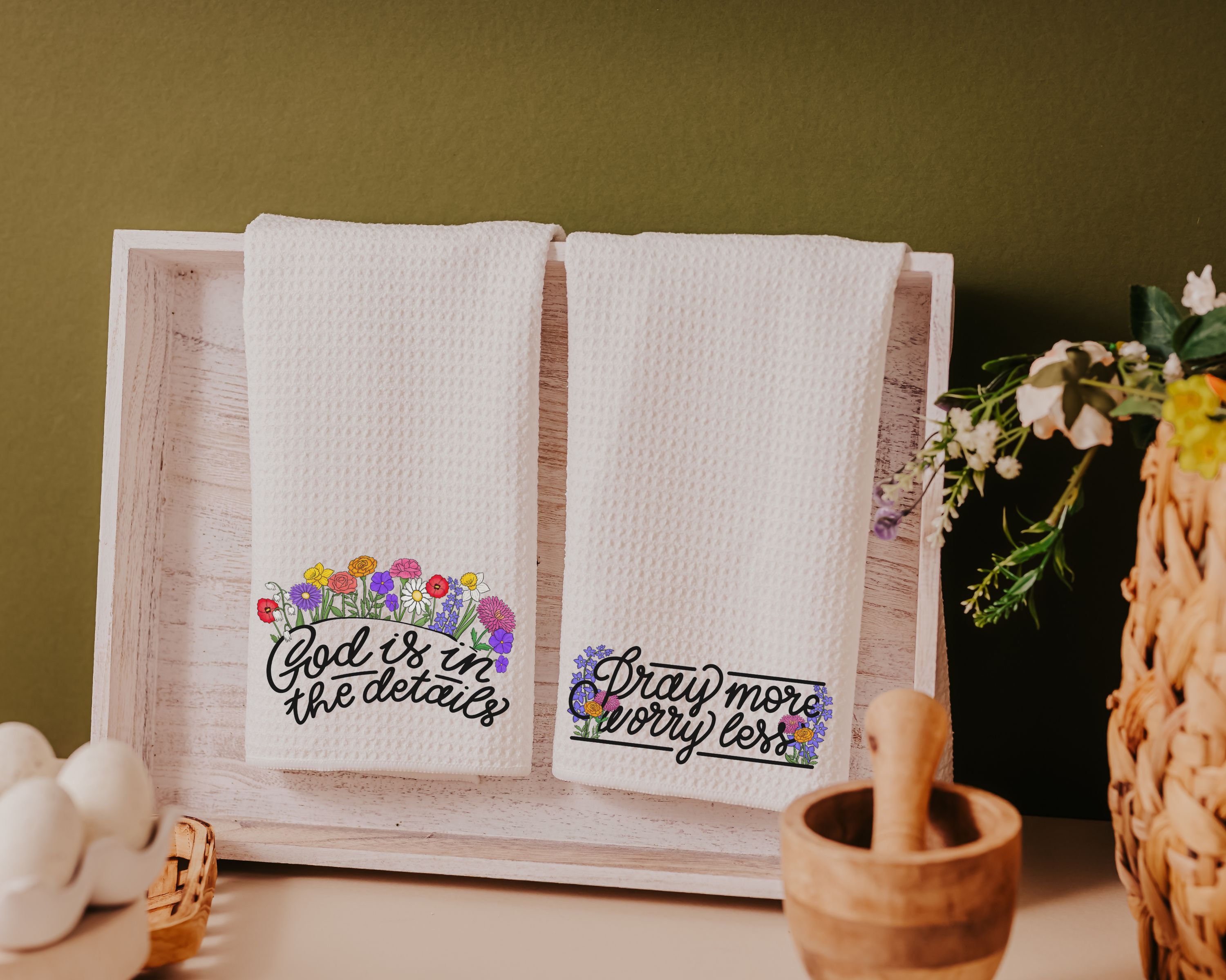Add a thoughtful touch to the kitchen with this wildflower towel set featuring “Grow in Grace,” “Pray More Worry Less,” “God Is in the Details,” and “Make Today Amazing.” A sweet pick for plant moms, bridal showers, or as Christian gifts for Mom. Great for drying dishes or adding a bit of inspiration to your everyday kitchen decor. Purchase individually or as a set.