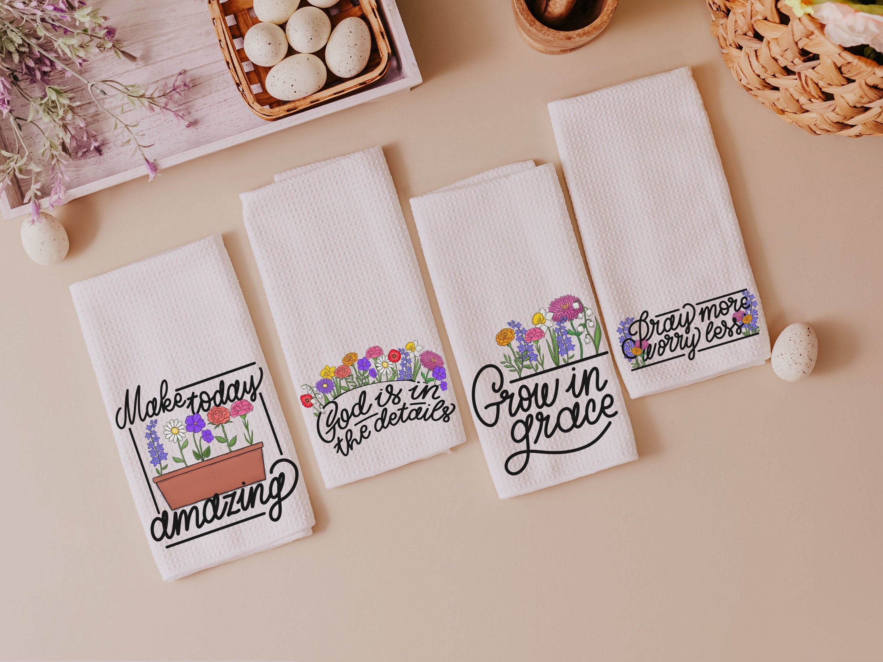 grow in grace wildflower kitchen towels, pray more worry less flower dish towels for drying dishes, Christian gifts for Mom, faith gifts for