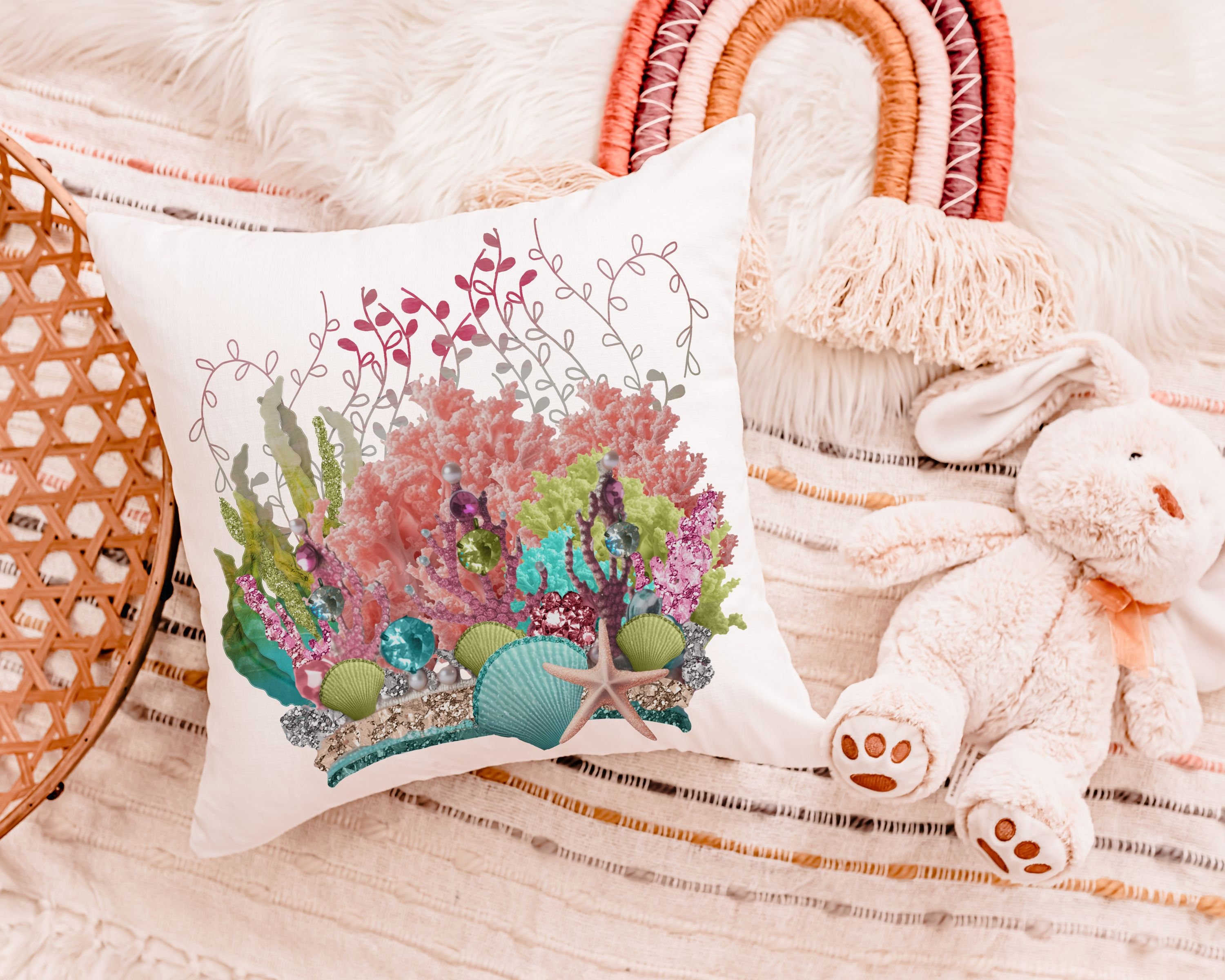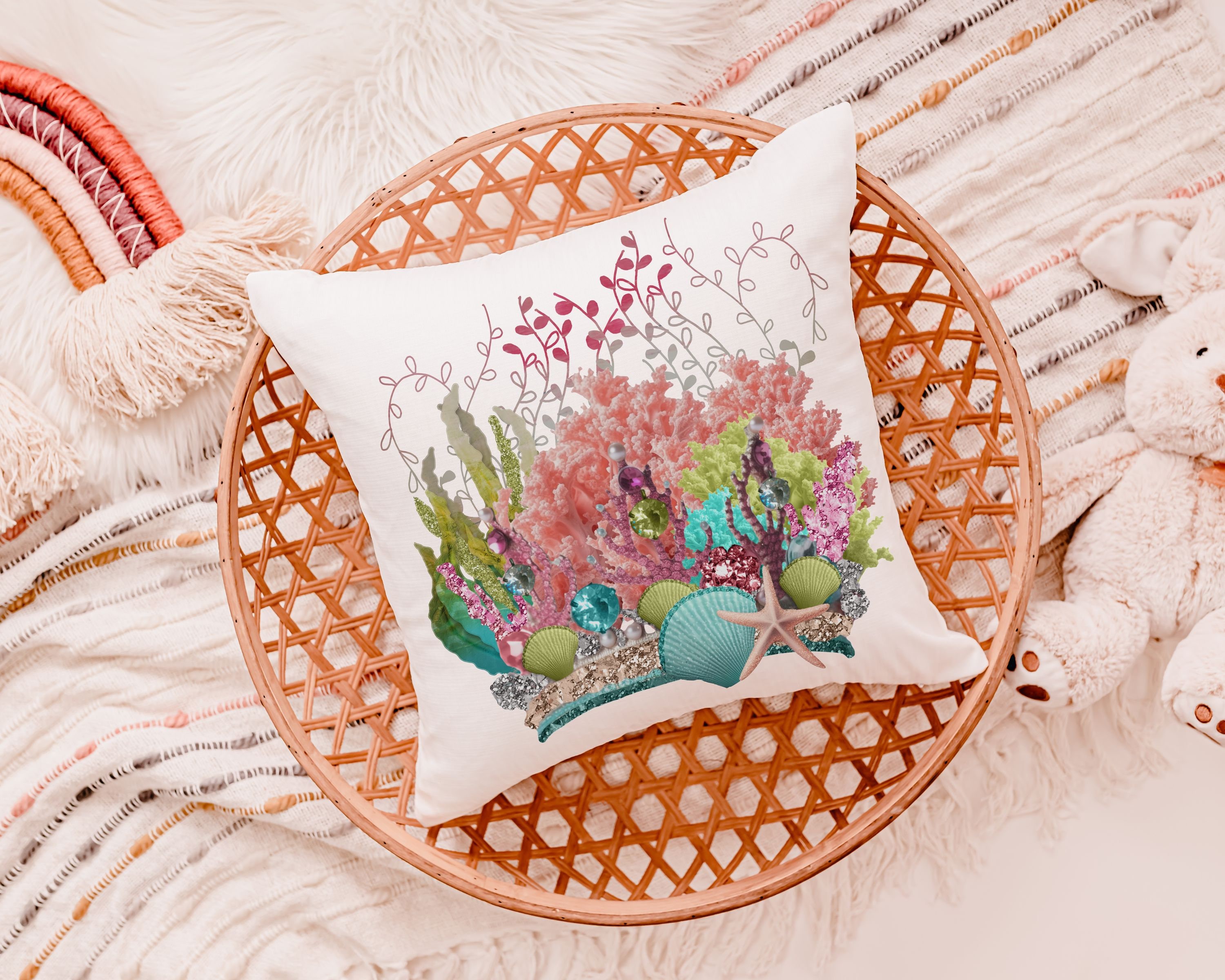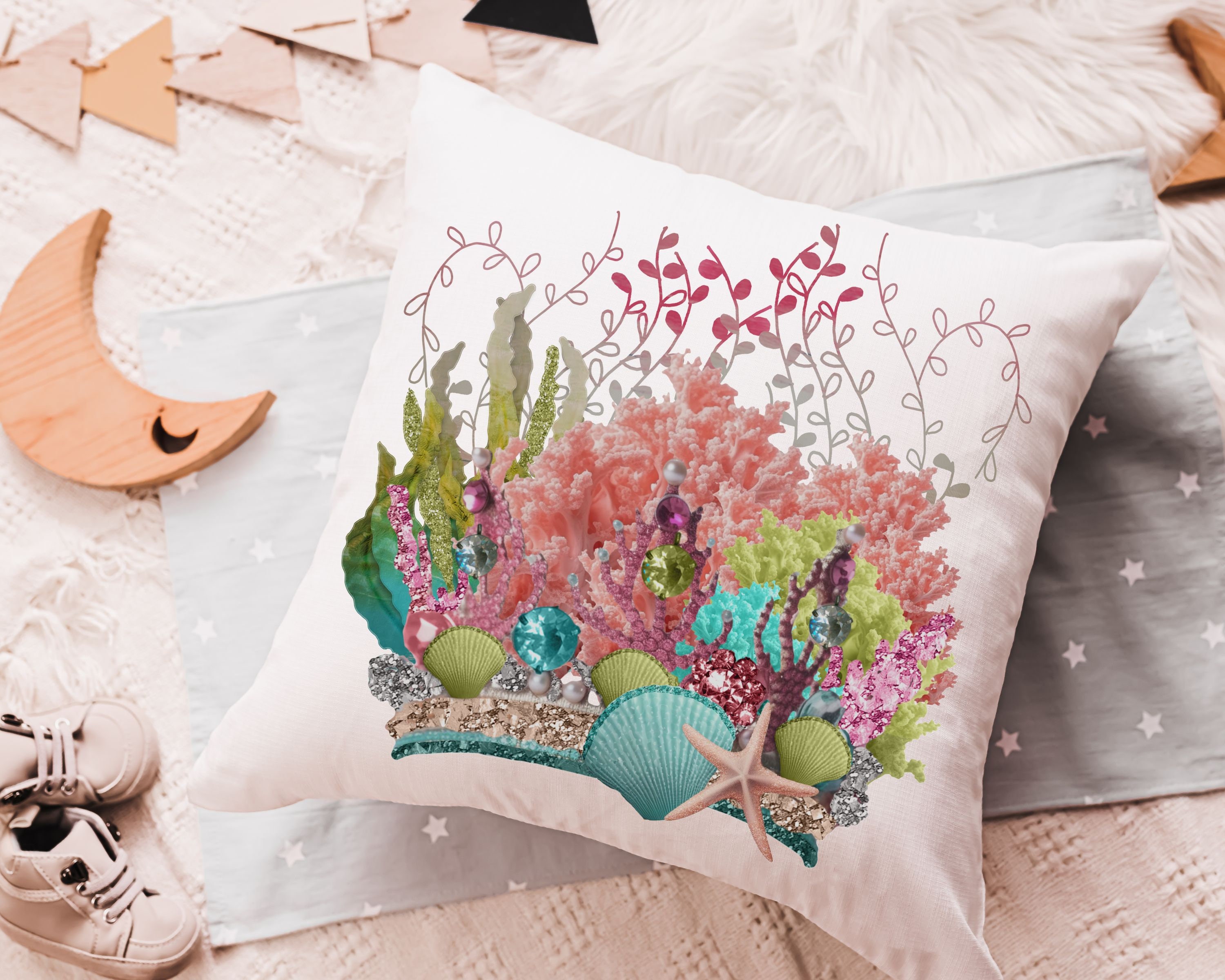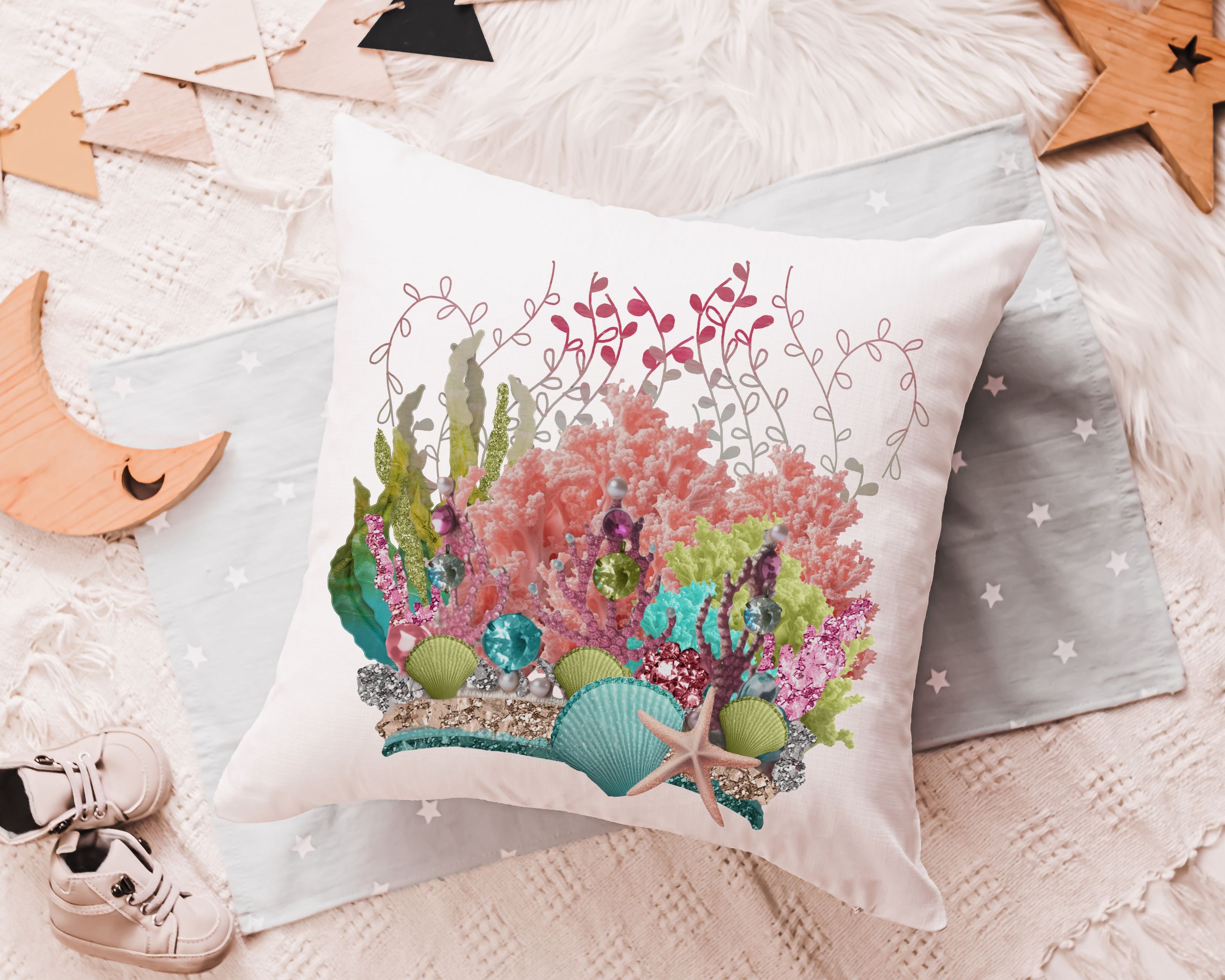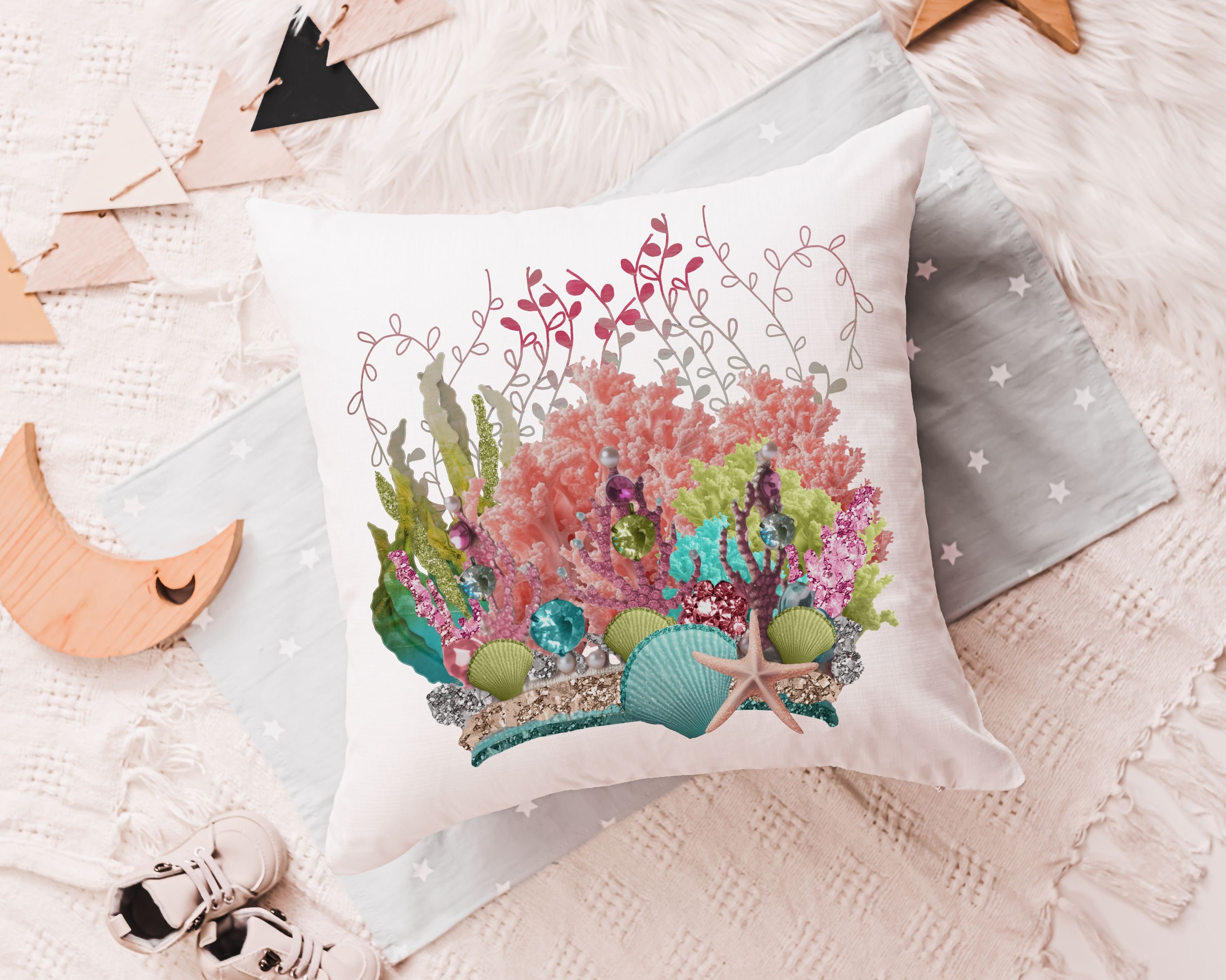 mermaid vibes colorful throw pillow for teenage girls, coral reef nursery decor girl, mermaid decor for girls room, reading nook pillow