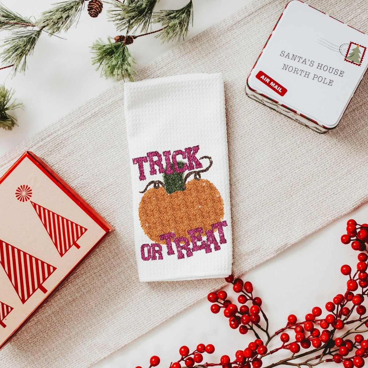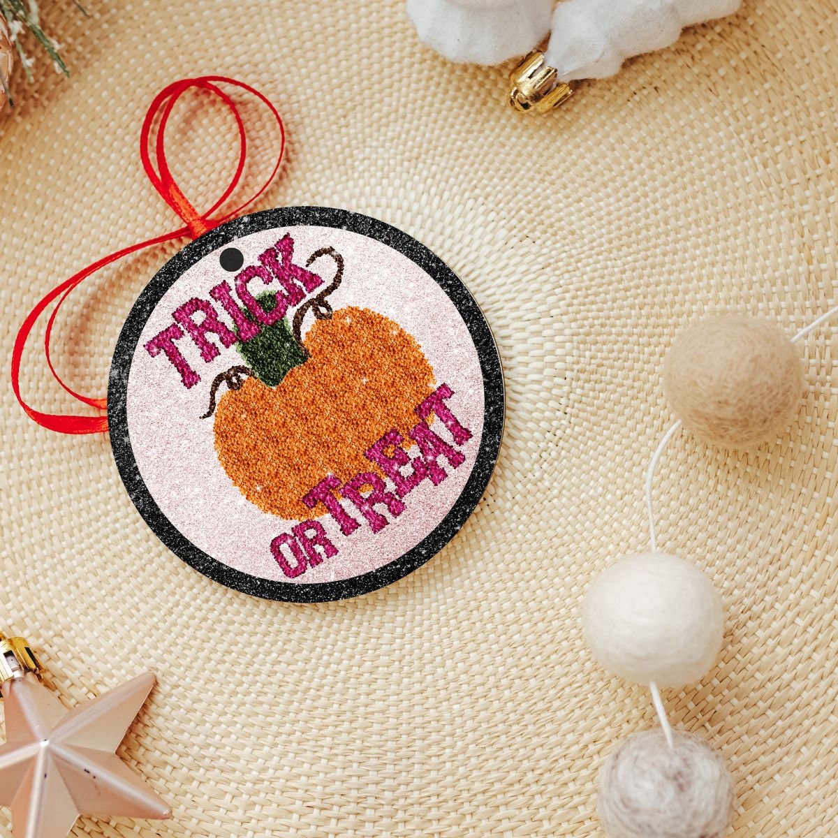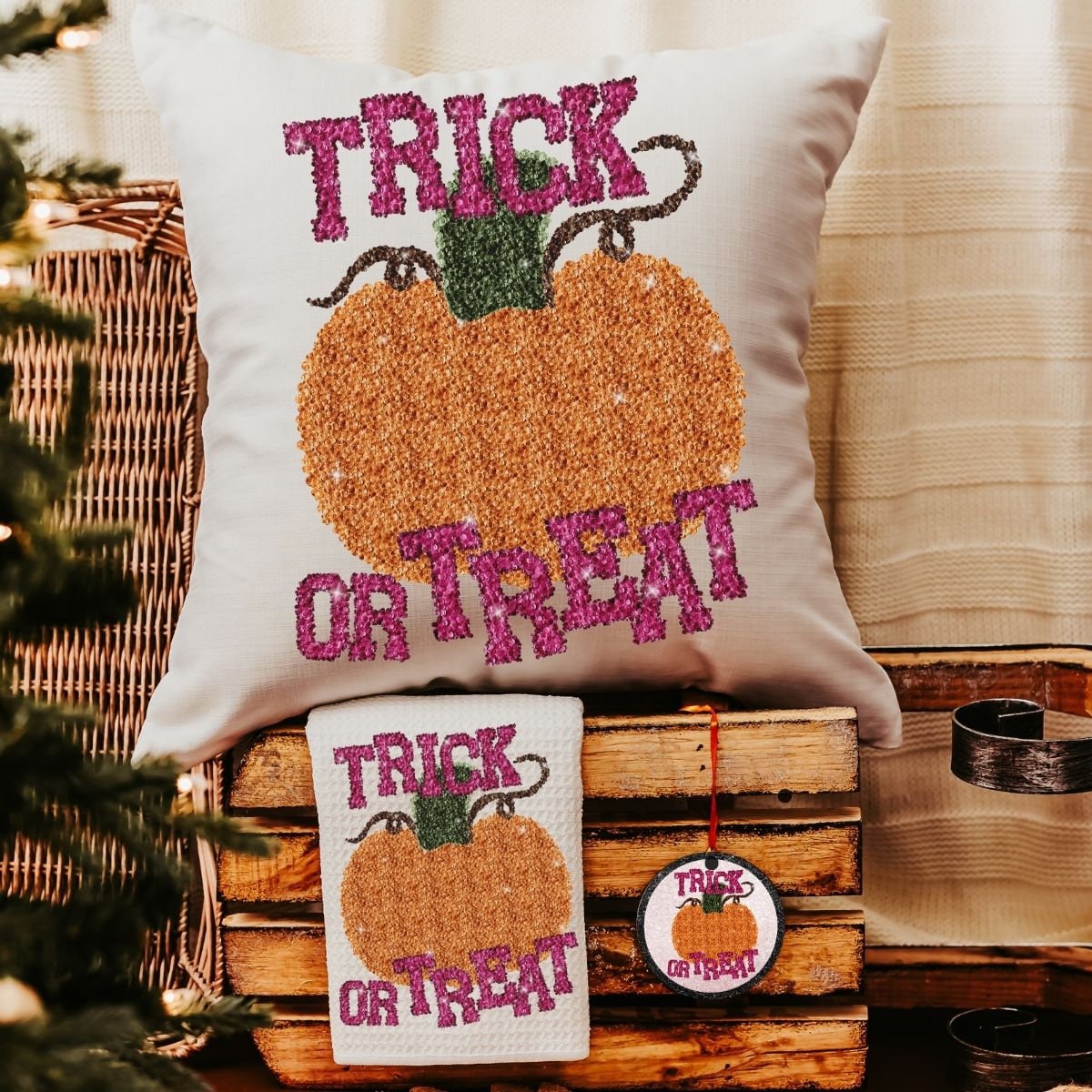 Add a festive touch to your home with our Cute "Trick or Treat" Pumpkin Throw Pillow, perfect for the couch or as an orange pumpkin accent pillow for the bed. The printed design features a sequins-inspired look, offering a touch of sparkle to your Halloween decor. Choose the complete Halloween gift set, or pick individual pieces like the pillow, matching towel, and ornament. This set makes a thoughtful Halloween gift for friends or loved ones, perfect for bringing the spirit of the season into any space!