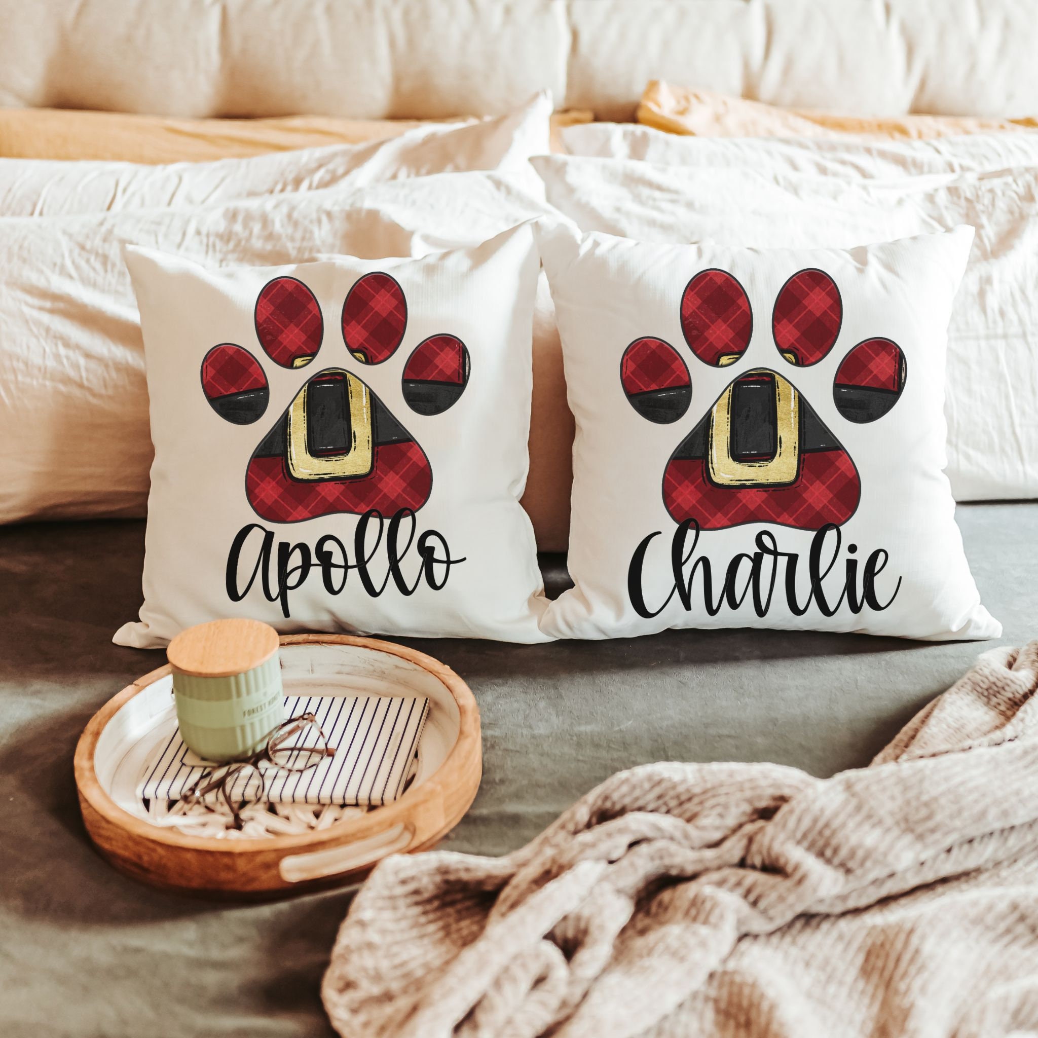 personalized Santa Paws Christmas throw pillows plaid Christmas decor for home, stocking stuffers for dog mom Christmas gifts for dog lovers