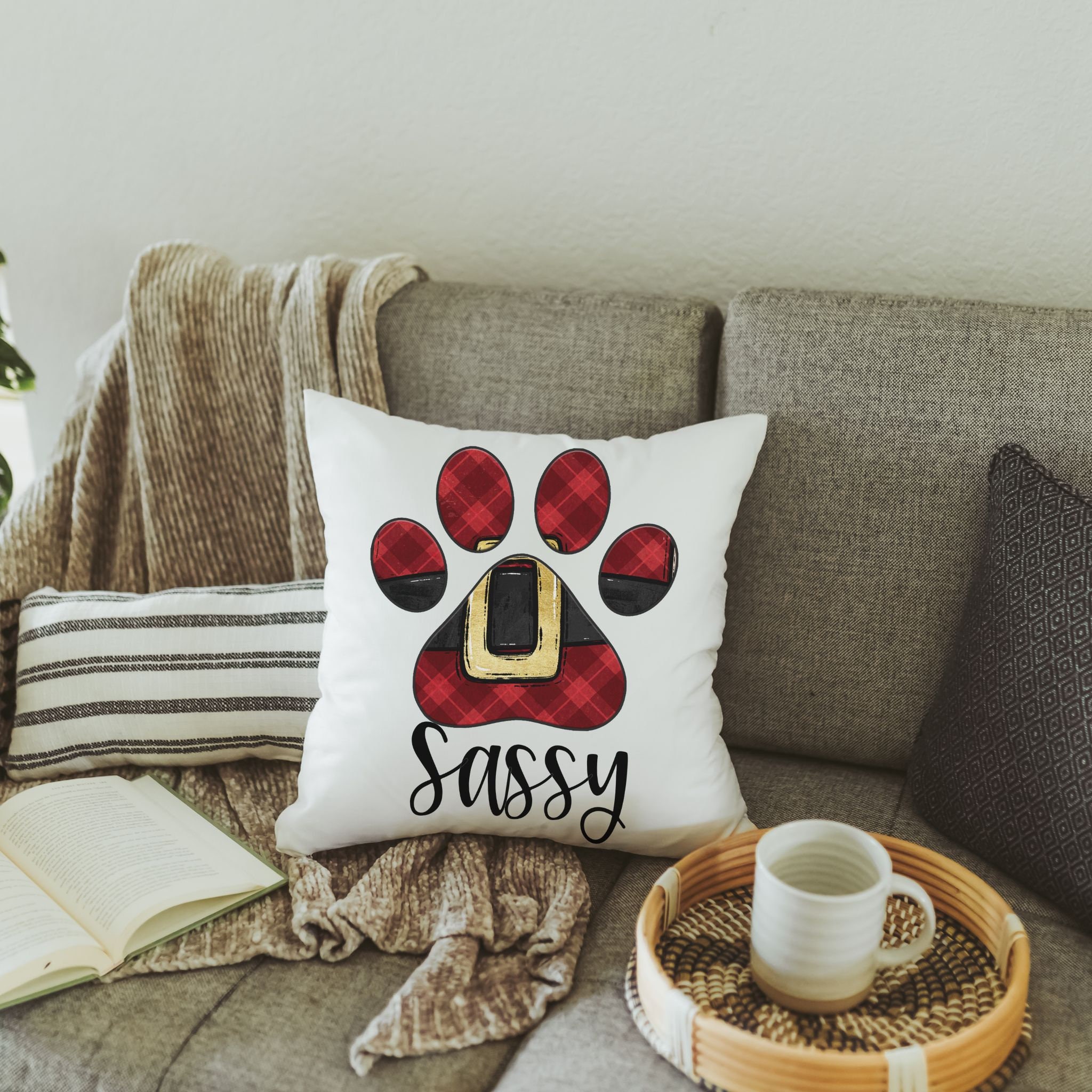 Add a playful touch to your holiday decor with this personalized Santa Paws throw pillow, perfect for the dog lovers in your life. Featuring a cozy plaid paw-print design, it's perfect for the couch, entryway, or bedroom. A great choice for dog moms and owners, it makes a charming stocking stuffer or thoughtful Christmas gift. Pair with other seasonal decor to create an inviting home for the holidays!
