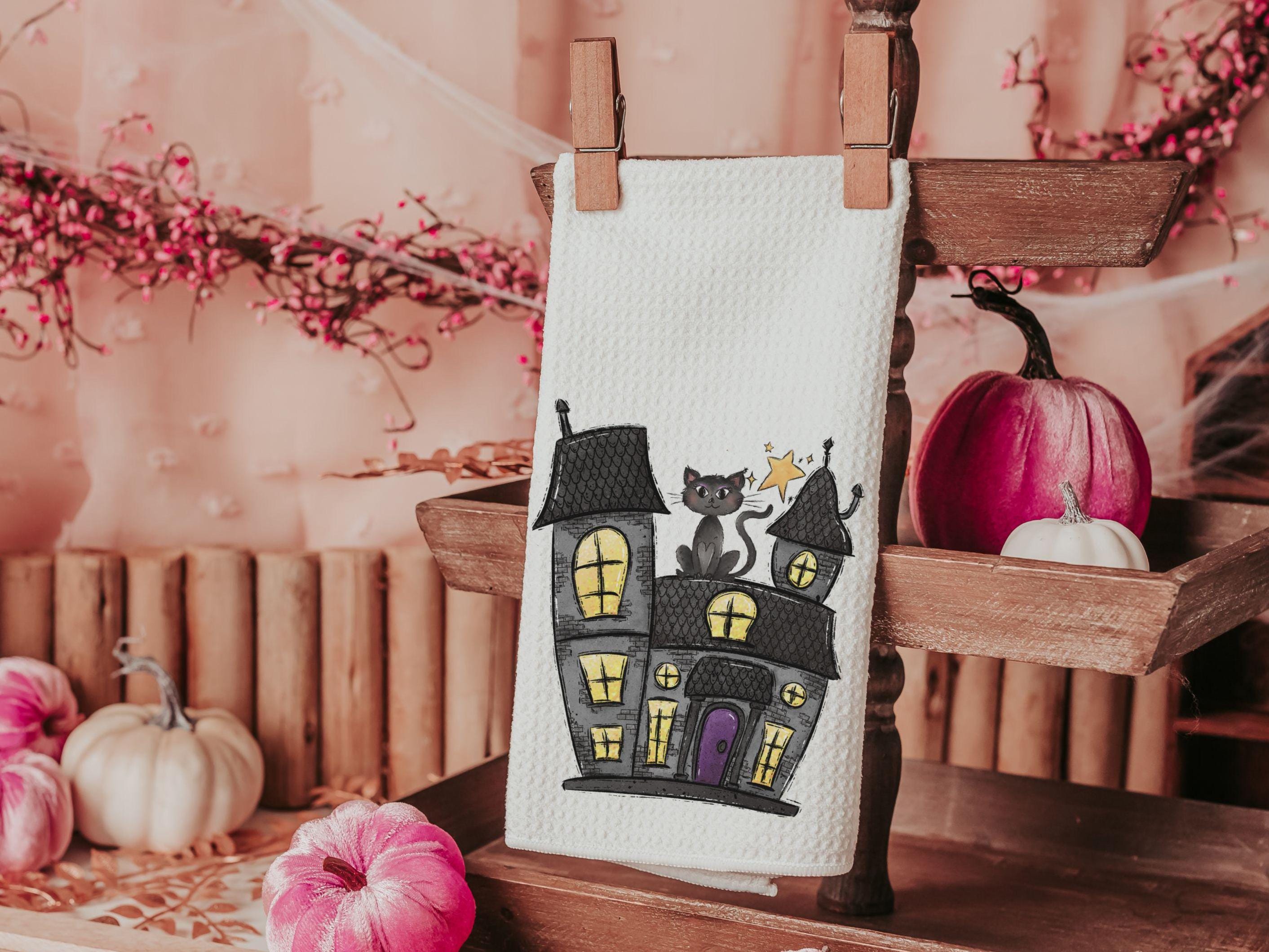 haunted house spooky cute Halloween kitchen towels, whimsigoth decor, whimsical Halloween gift set for women, black cat Halloween decor for