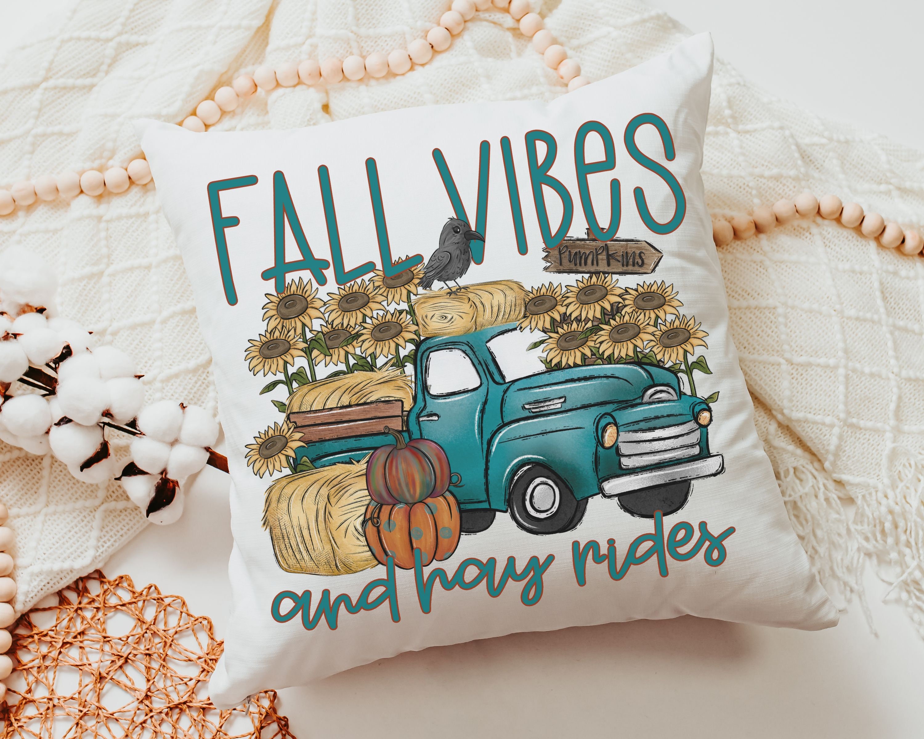 Add a fall touch to your home this season with our fall vibes and hayrides throw pillow, featuring an adorable blue truck and pumpkin design. Perfect for your couch, this pillow also makes a beautiful gift for women who love sunflowers and autumn decor. Ideal for baby showers or decorating your home for the season.