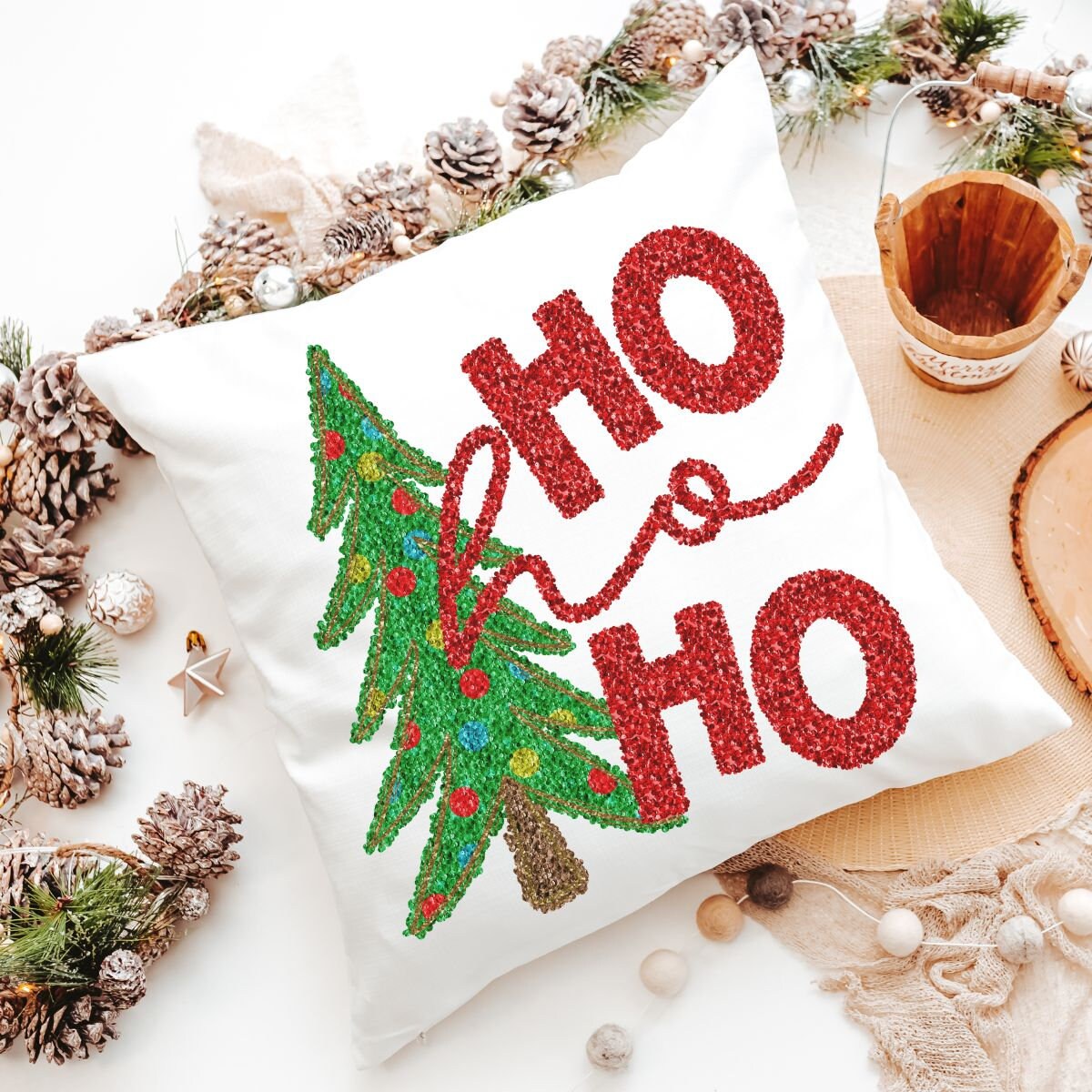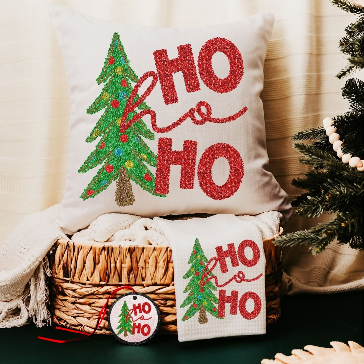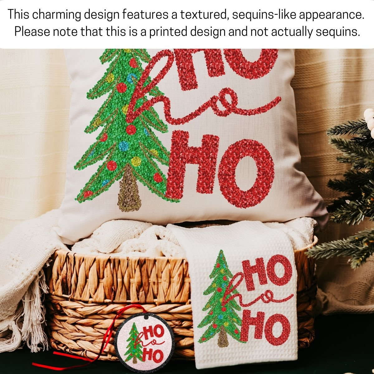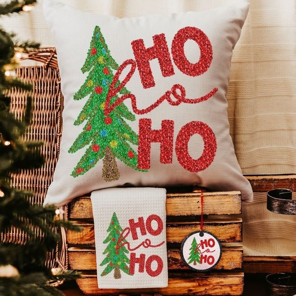 Add sparkle to your holiday decor with Ho Ho Ho Christmas tree pillows, matching towels, and a coordinating ornament featuring a faux sequin design. Perfect for the sofa or kitchen, this cute Christmas gift set makes a fun secret Santa surprise or a festive housewarming gift for women or couples. Available to purchase as pillows, towels, or ornaments, sold separately or as sets.