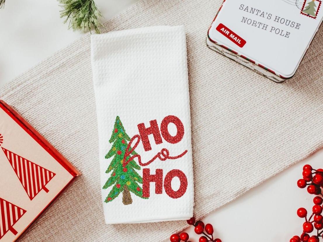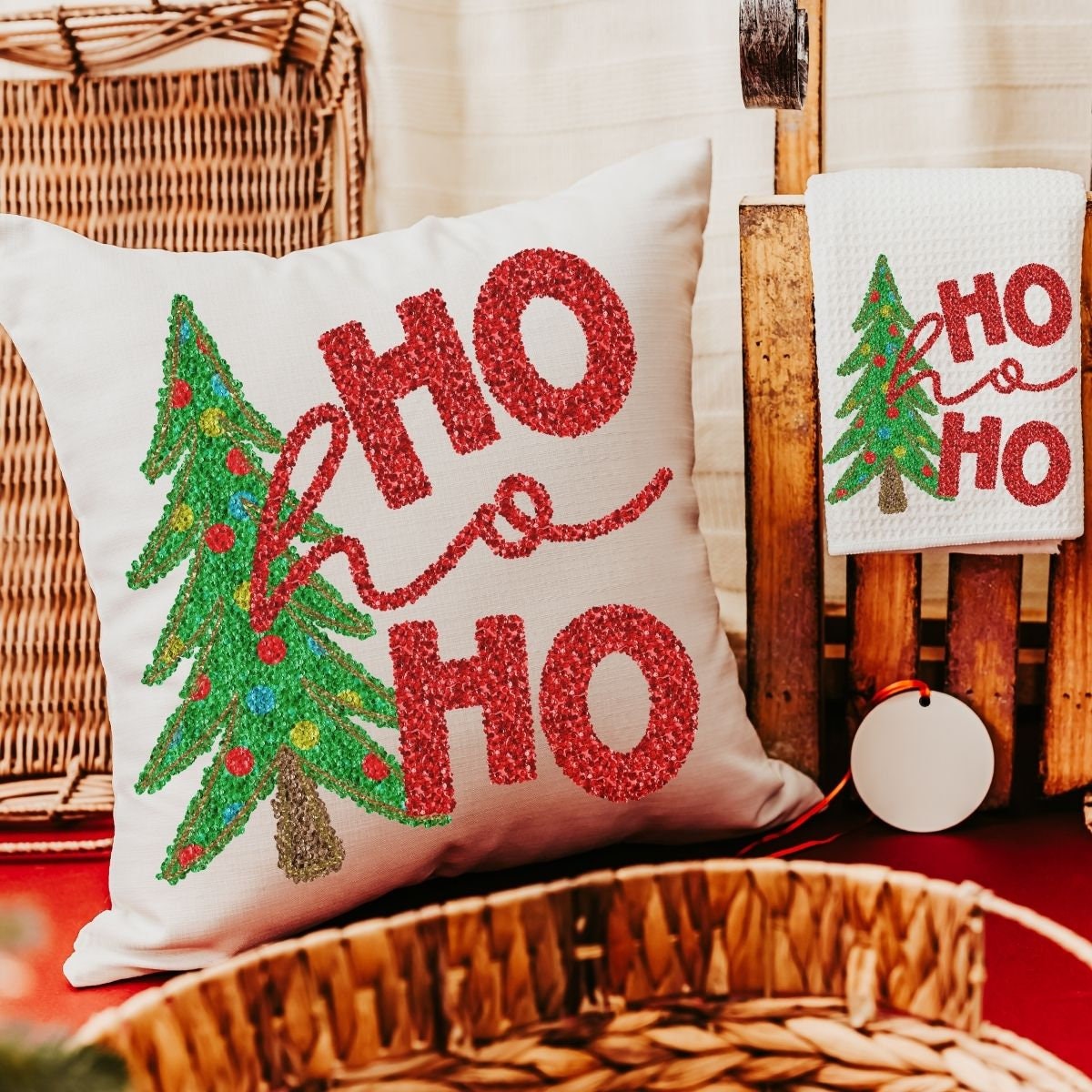 ho ho ho Christmas tree throw pillow for sofa, Christmas housewarming gift set for women, faux sequin Christmas kitchen towels, secret Santa