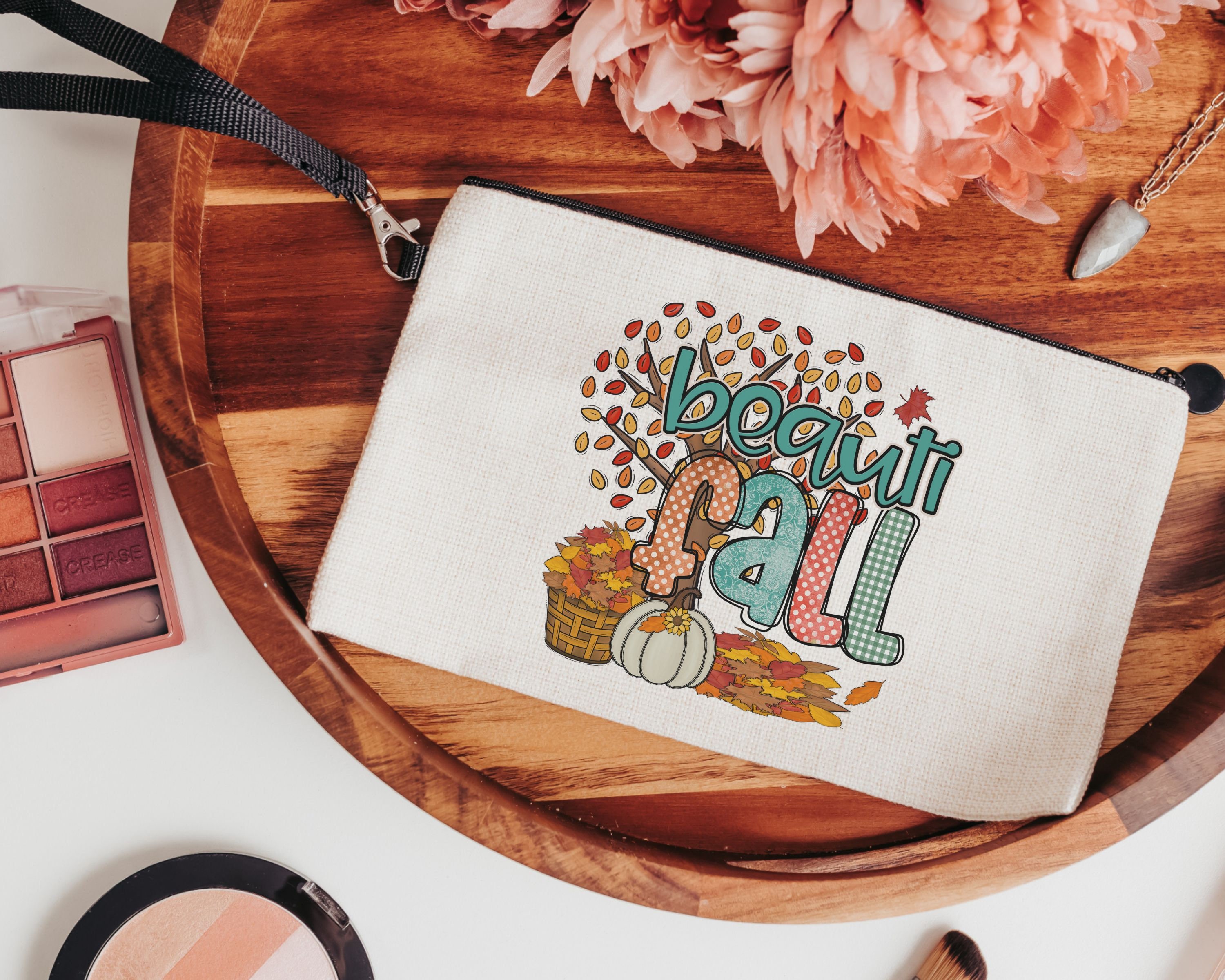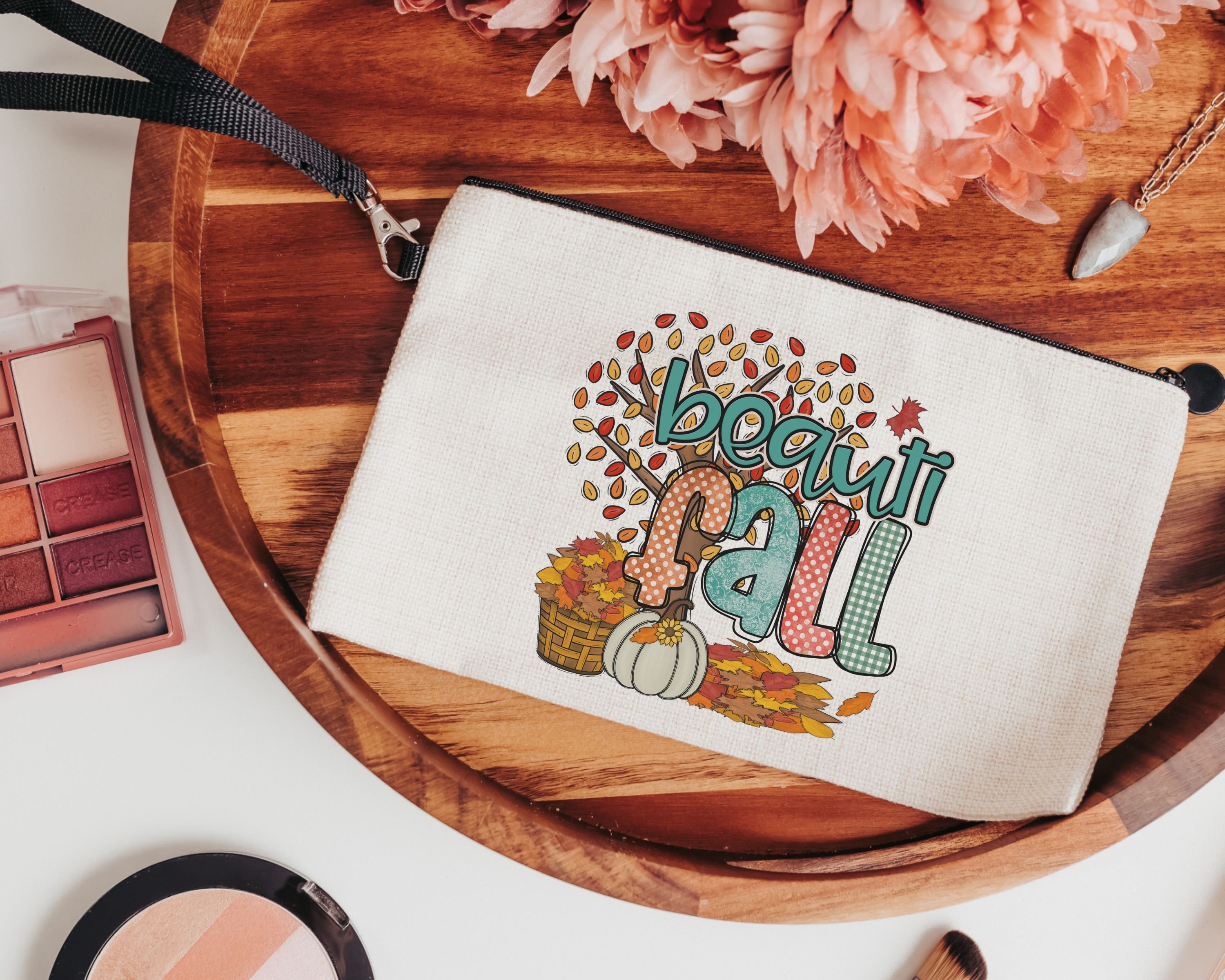 beautiful fall makeup bags best sellers, fall style gift, autumn leaves cosmetic bag for women, fall host gift, pumpkin season gift, zipper