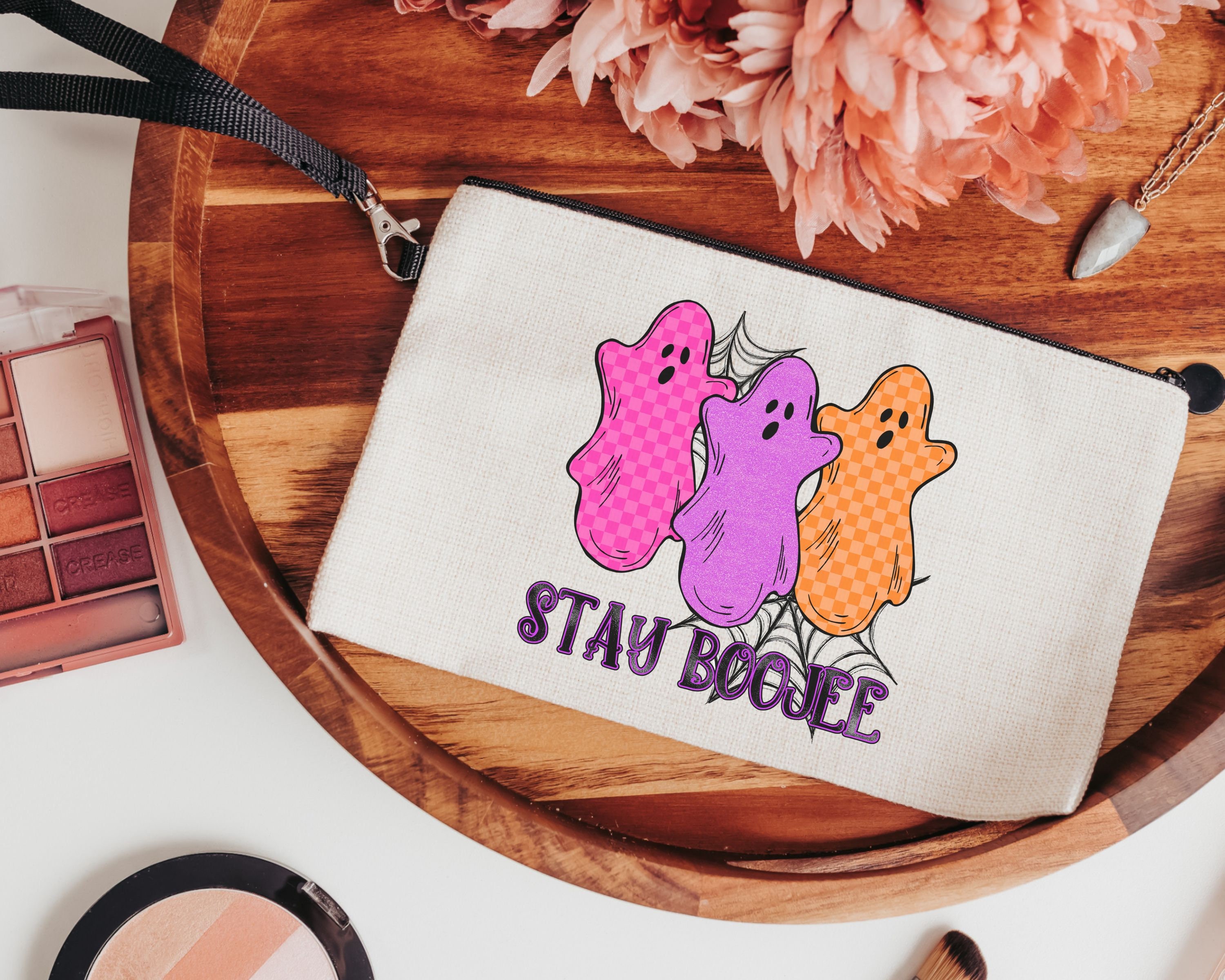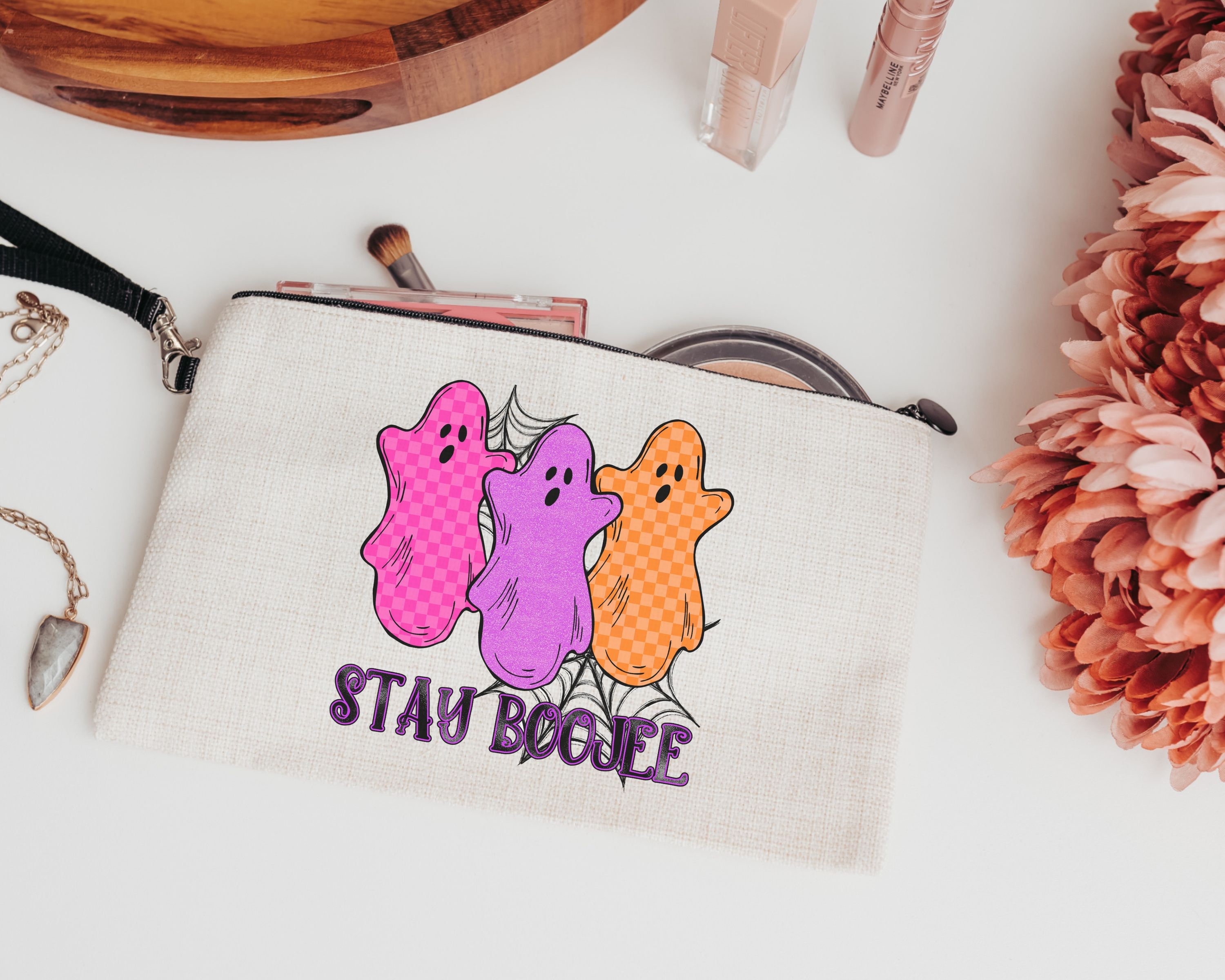 Show off your Halloween style with our "stay boojee" trendy Halloween makeup bag featuring a cute ghost design. This cosmetic bag, perfect for your purse, makes a fantastic Halloween gift, especially for tweens and those celebrating October birthdays. It's a fun and fashionable accessory that adds a touch of spookiness to your everyday routine. Don't miss out on this ghost-themed bag for women and teenagers – a chic way to embrace the Halloween spirit!