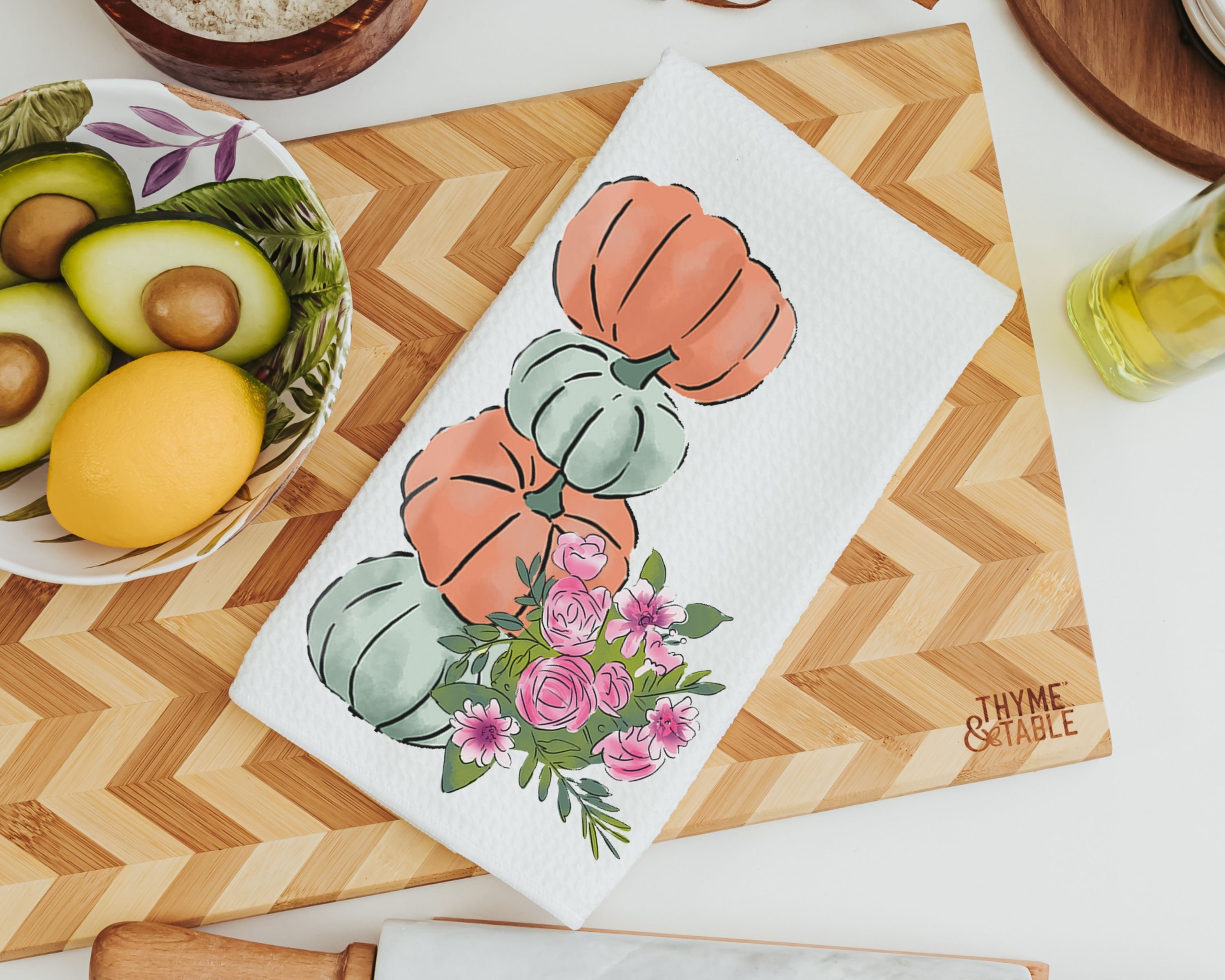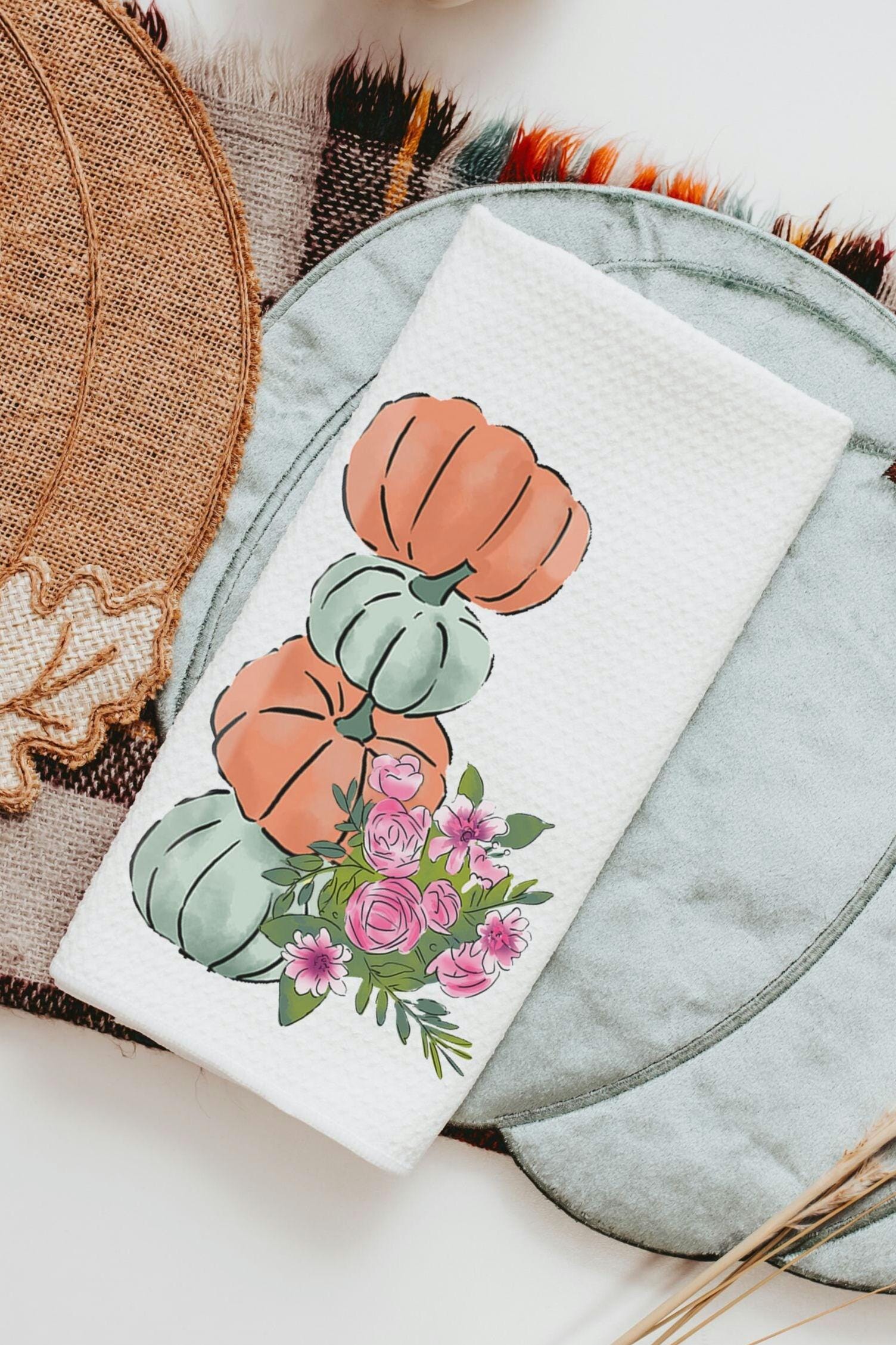 sage green pumpkin kitchen towels for friends, autumn kitchen decor for fall floral hand towels for bathroom, Thanksgiving hostess gifts for