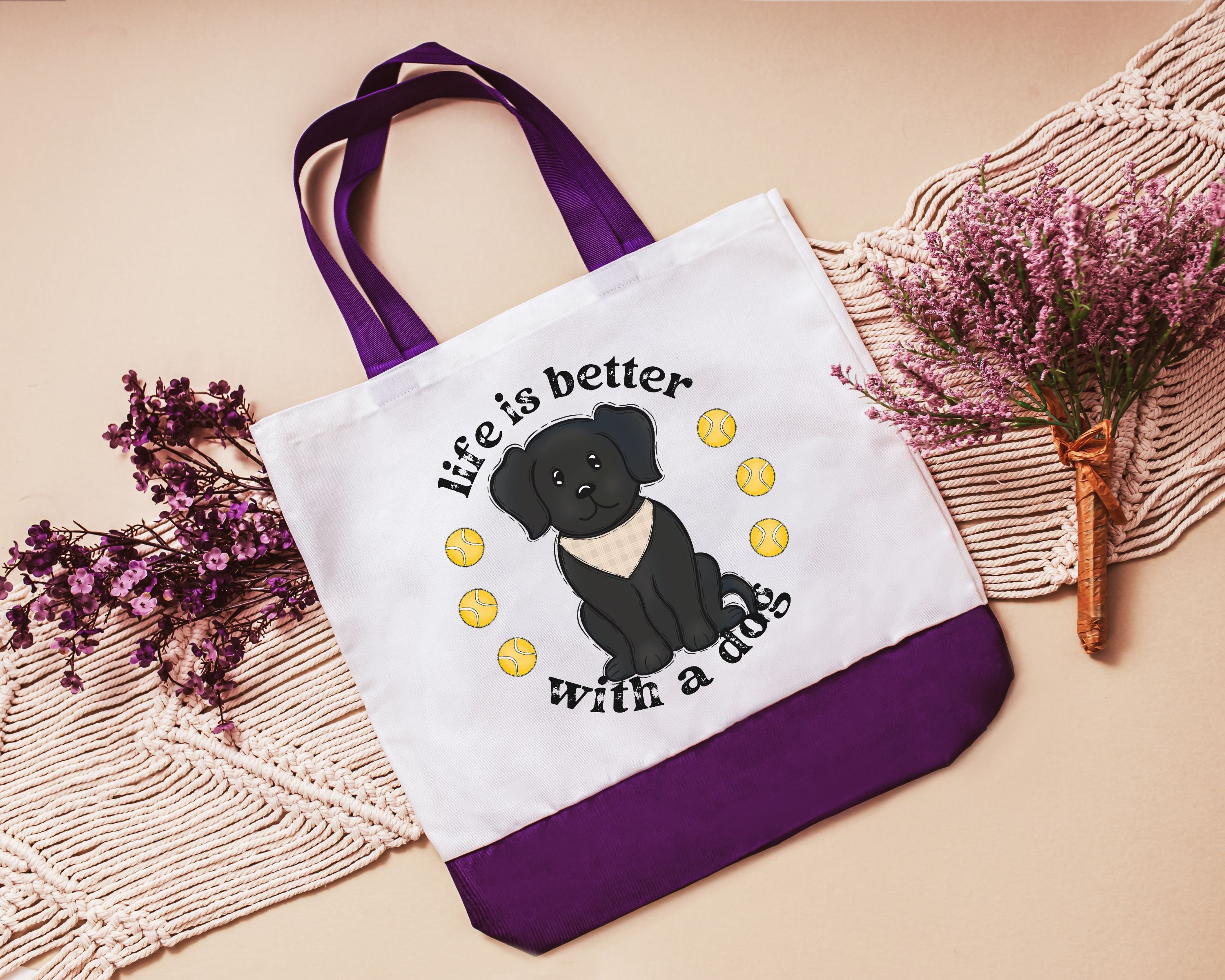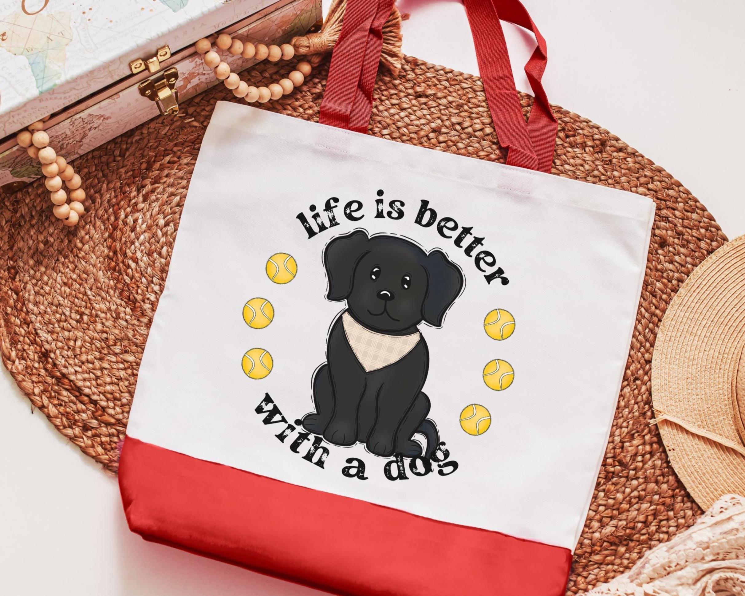 Celebrate the bond with your favorite four-legged friend with this "Life is Better with a Dog" tote bag, featuring a black Labrador design. Perfect for dog moms, this reusable shopping bag makes a sweet birthday gift or surprise for dog lovers. A practical and thoughtful gift for anyone who adores their loyal lab.