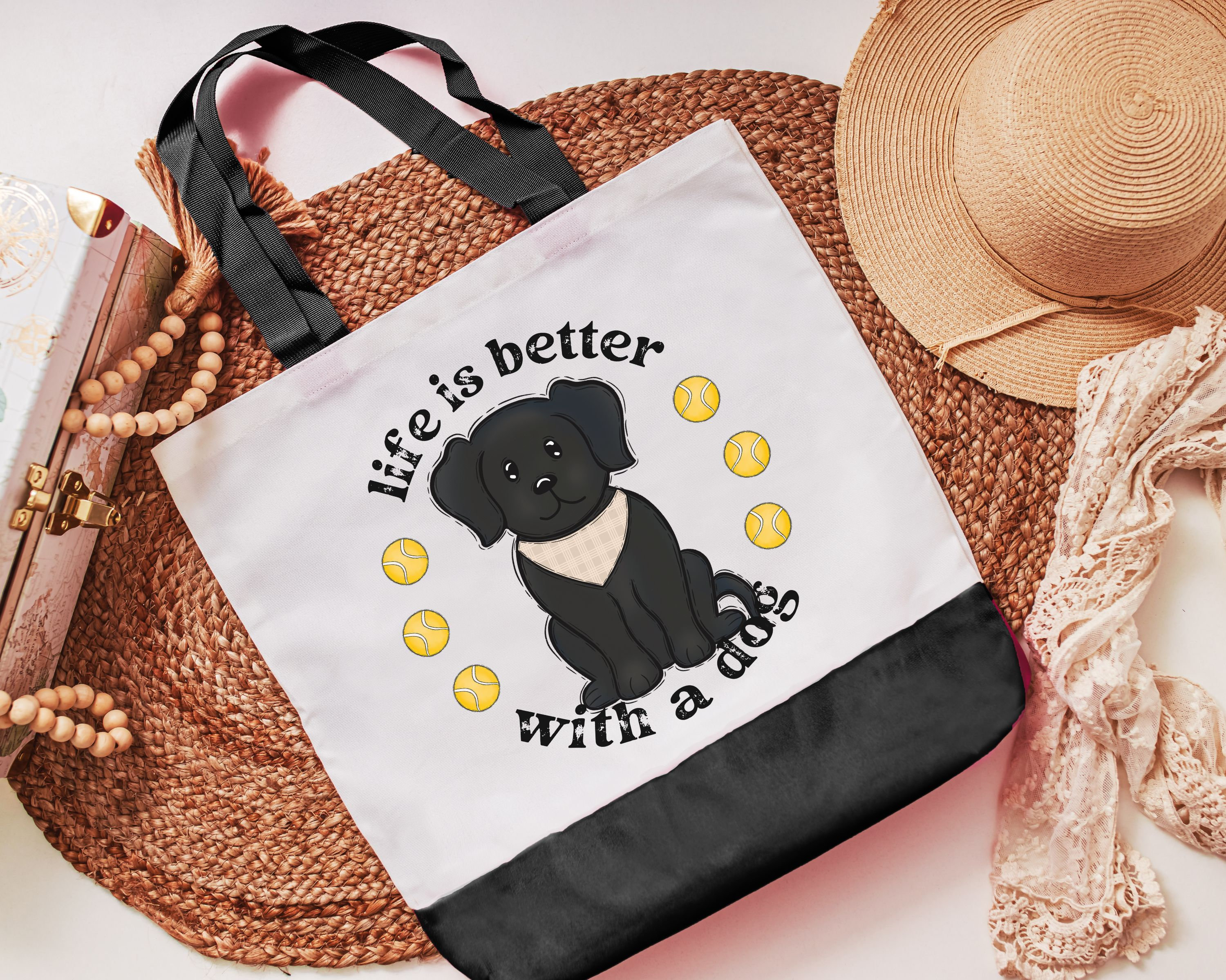 life is better with dogs black lab tote bag for women, stocking stuffers for dog mom Christmas gifts for dog lovers, black Labrador gifts