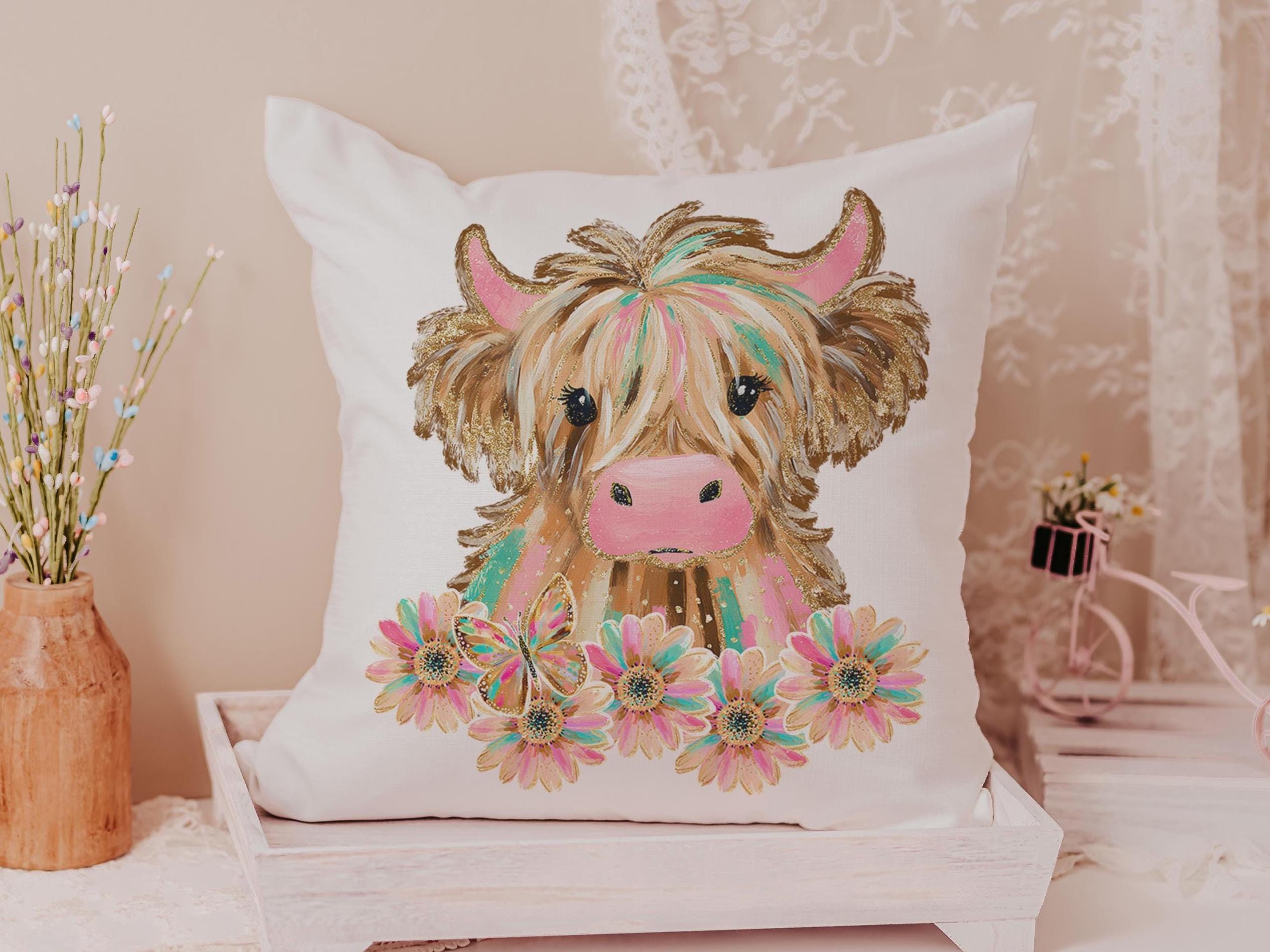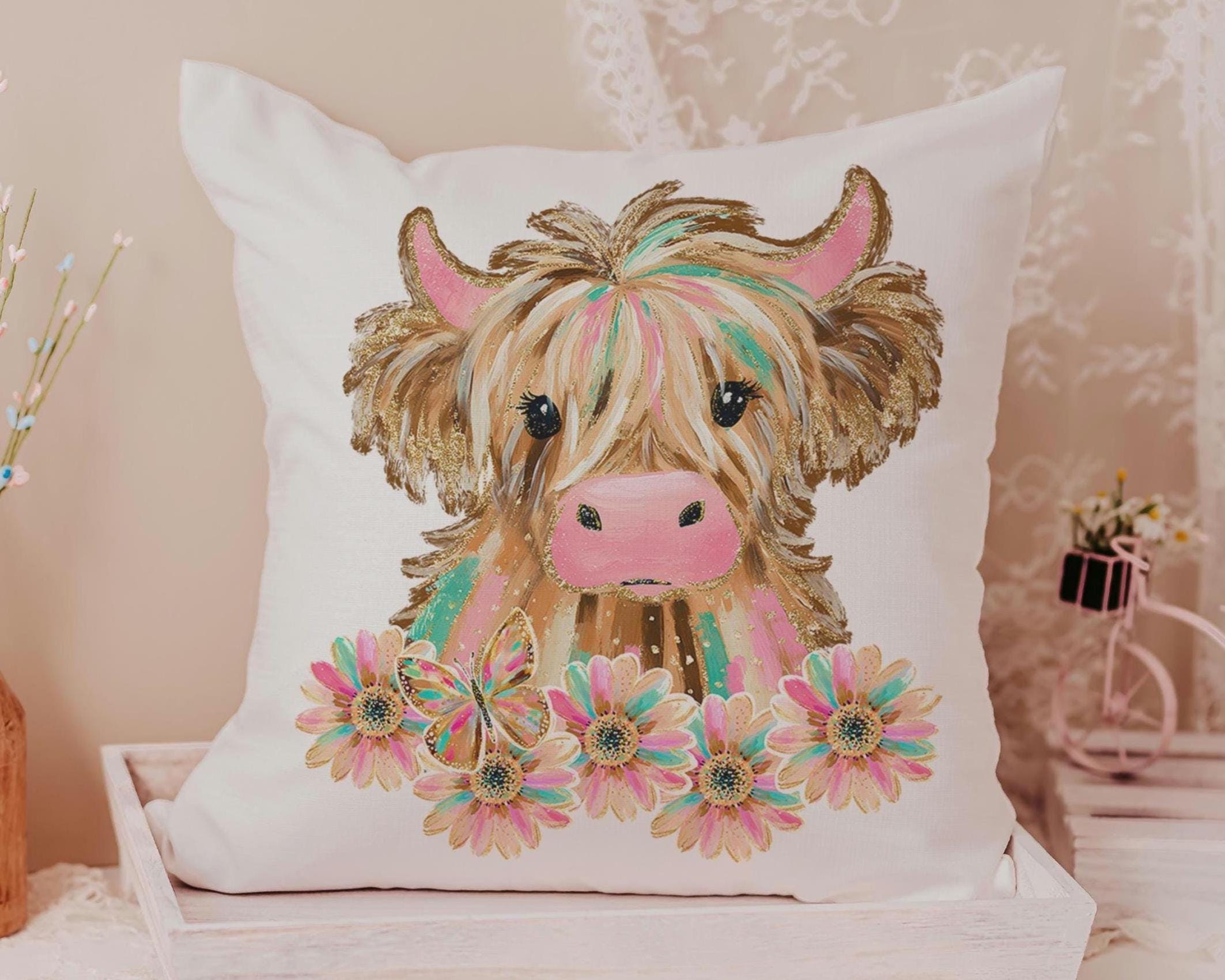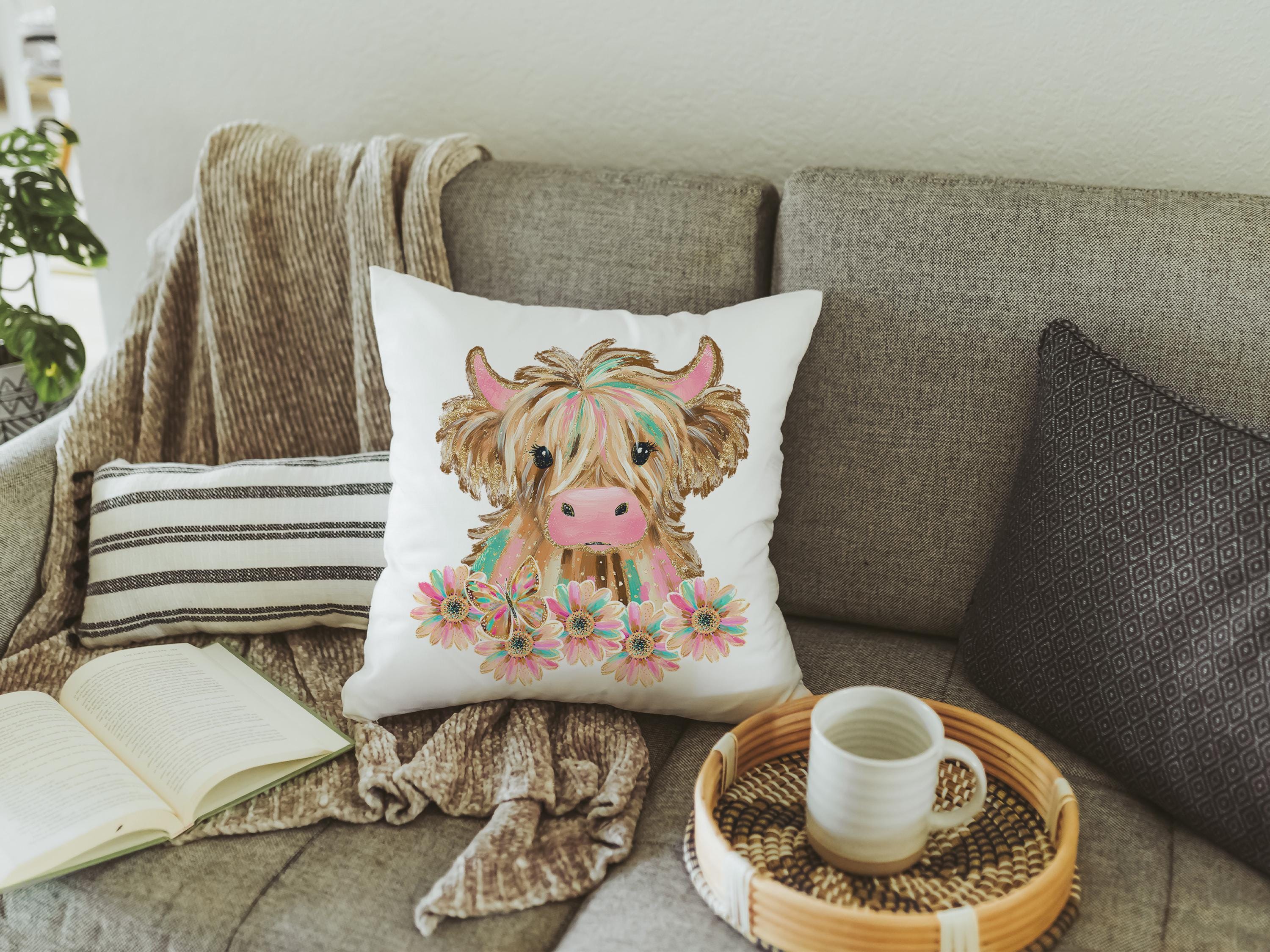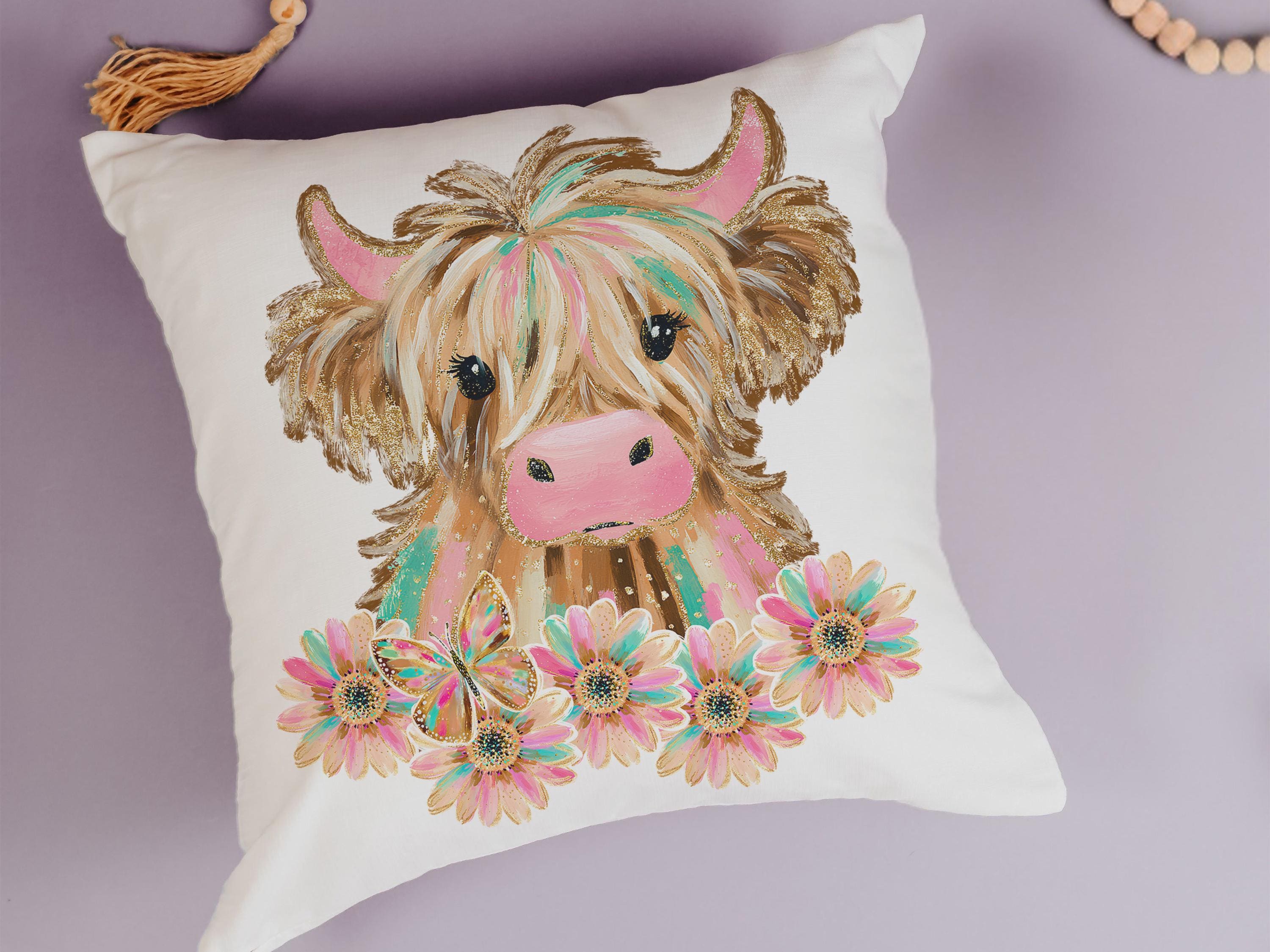 Add a sweet touch to your space with pink highland cow pillows, perfect for the couch, bedroom, or nursery. This cute shaggy cow design makes adorable Christmas gifts for little girls and charming decor for anyone who loves farmhouse or watercolor cow accents.